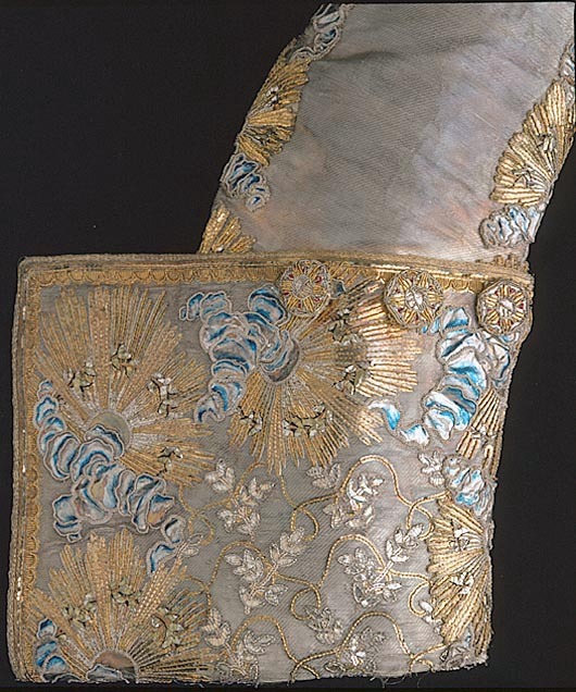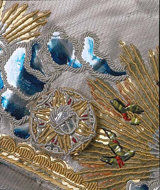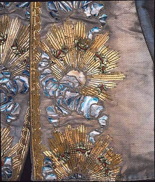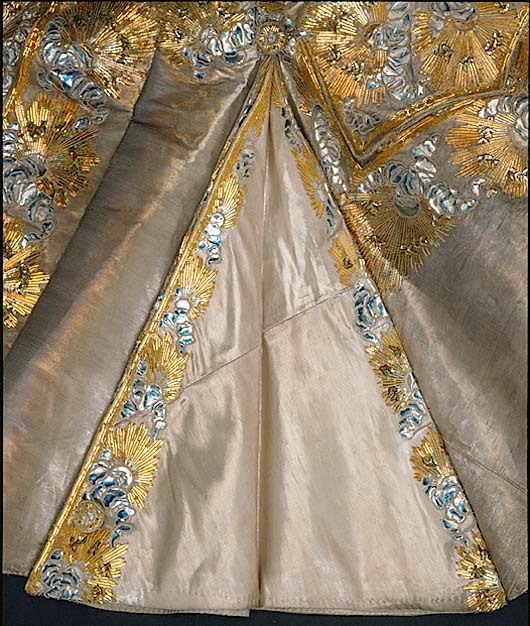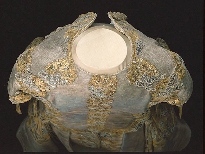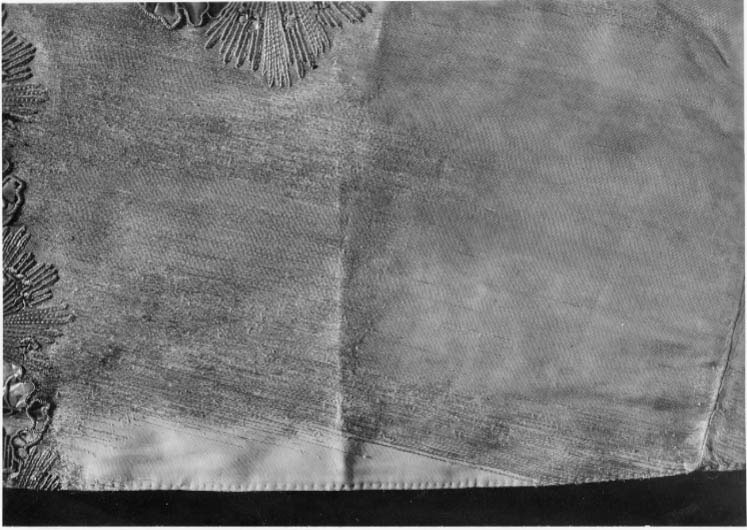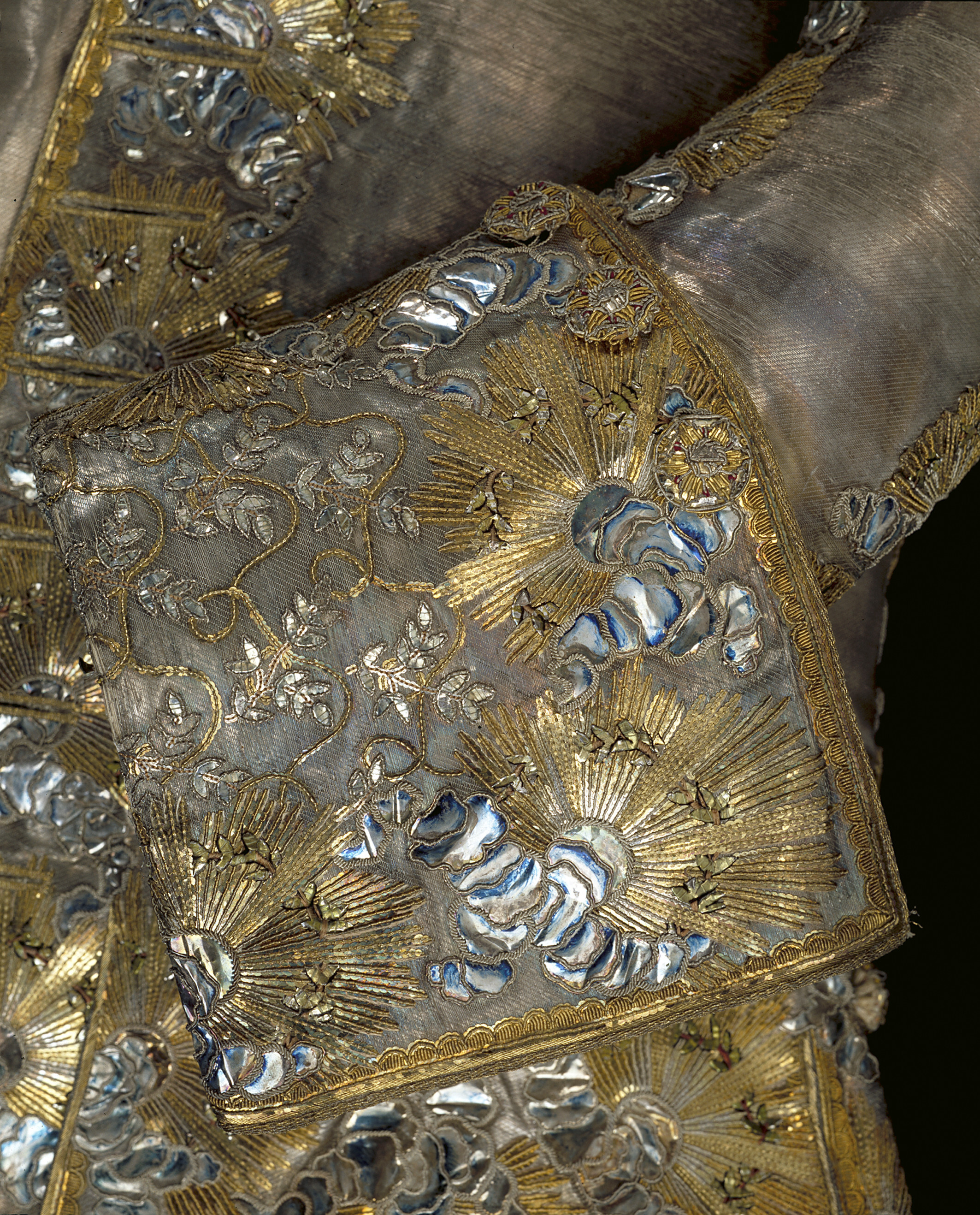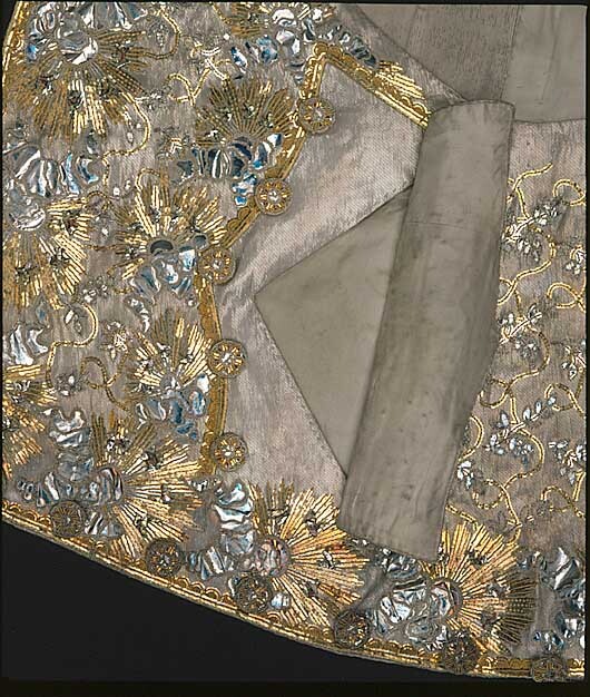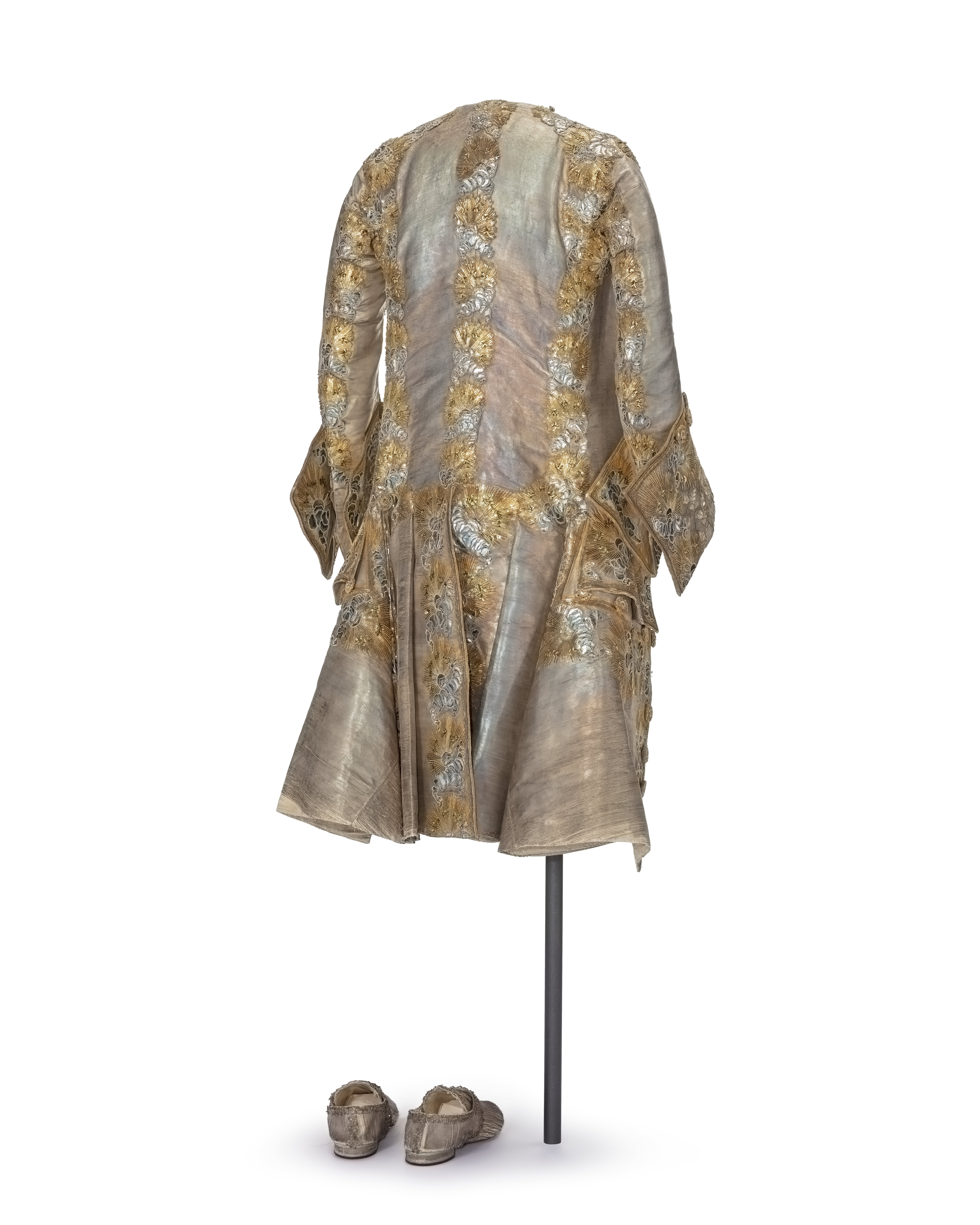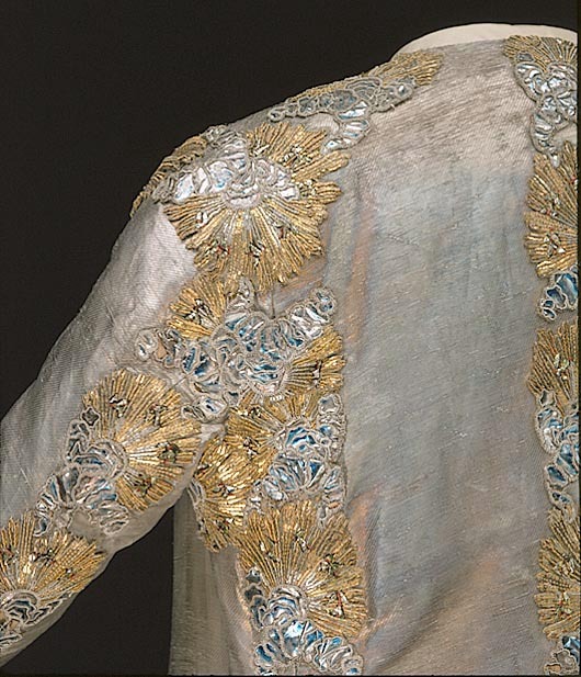 Använd vid bröllopet med Sofia Magdalena den 4 november 1766. Rock i silvertyg med svagt böjd framkant, vida skört med veckade sidsprund, snäva ärmar med mycket breda ärmuppslag eller manschetter. Den är mycket rikt dekorerad längs alla kanter med ett applikationsbroderi i blå metallfolie och guldtråd samt paljetter. Broderiet är av en typ där de olika dekorelementen kunde kombineras ihop på ett sätt som passade plagget och appliceras på plagget. Motivet som är detsamma på västen består av moln och strålande solar. Blomkvistar i strålarna. Mönsterrapporten är ca 11 cm och bredden ca 7 cm. Broderiet sitter längs med framkanten, på ficklocken och under ficklocken vid ficköppningen samt längs med sidsömmen, i sidsprunden, längs ärmhålssömmar, ärmsömmar och på manschetterna. I de inre delarna av vecken i sidskörten har broderiet kvar en otrolig gnistrande glans. Broderiet är av två storlekar i t.ex. sidsprundet är mönsterrapporten mindre. Längs med alla avslutande kanter på plagget löper en tunn snedvävd guldlinje samt en paljettrad samt en guldudd i av kantiljer på paljetter. Knappar: Knapparna är brodrade med paljetter och metalltråd som små smycken. Mitt fram sitter 18 knappar (ca 25 mm) den 19:onde saknas. Knapparna är fästade med 5,5-6 cm mellanrum. På ficklocken sitter 5 st (25 mm) knappar. Vänster sidsprund har 2 st (25 mm) knappar och Manchetten 4 st. Knapphålen är 12 och flertalet har nog inte knäppts, raden slutar vid ficklocken. Knapphålen är skodda med guldtråd. Vid höger axelsöm finns knapp och snodd för ordensband. Tygbredd ca 50 cm Vävteknik: kypert, inslag i silke och silverlanomspunnet silke. Foder i silvermoiré gjort på en vävd sidenrips som bl.a. har silverlan som inslag. Ryggen och ärmfodret i sidenkypert. Manchettens insida är i annat tyg, en rips, samma som fodret. Rocken finns uppritad, där de veckade spundens skärning blir tydlig. För att ta vara på det dyrbara tyget förekommer skarvar inne i skörtet. Anm. Broderierna är sannolikt utförda av den franske hovbrodören Léger Trémeau. Den 15 december 1767 levererar han en väst till franske kungen med ett noga beskrivet broderi som mycket väl överensstämmer med broderierna i Gustav III:s bilägersdräkt. Se Fastes de cour et ceremonies royales, s 90-91 Anm. Kraschanen broderad i Christoffer Sergels ateljé. Bilägersdräkten beställdes till Gustavs bröllop med Sofia Magdalena. Dräkten tillverkades i Paris och broderierna ansågs redan då mycket fina. se vidare brev ...(Lena) Redan 1773 finns dräkten i Klädkammaren. Enligt äldre vägledningar av livrustkammaren verkar dräkten ha varit utställd ganska länge under 1800-talets andra hälft och en bra bit in på 1900-talet.