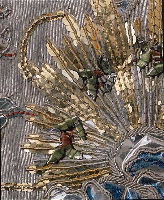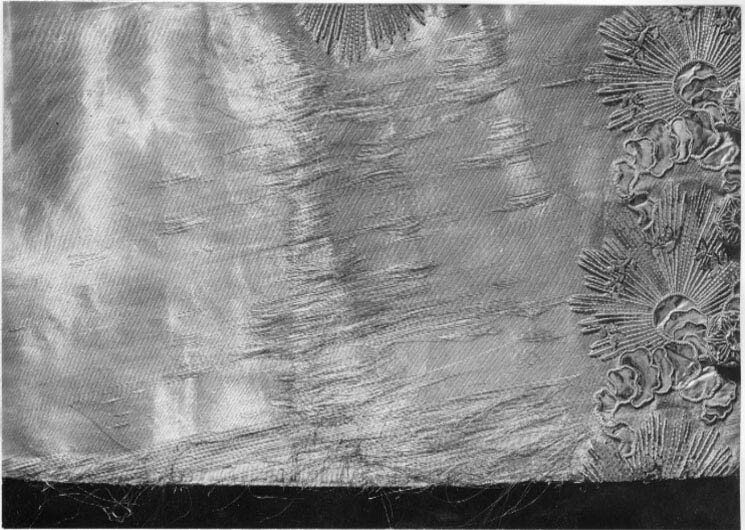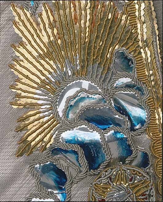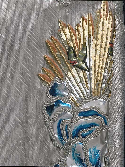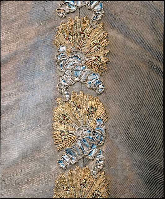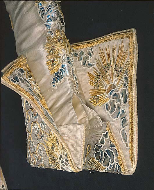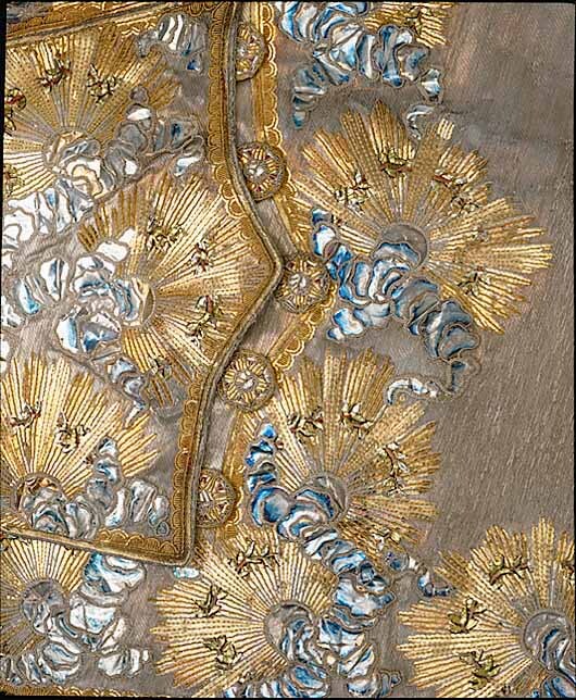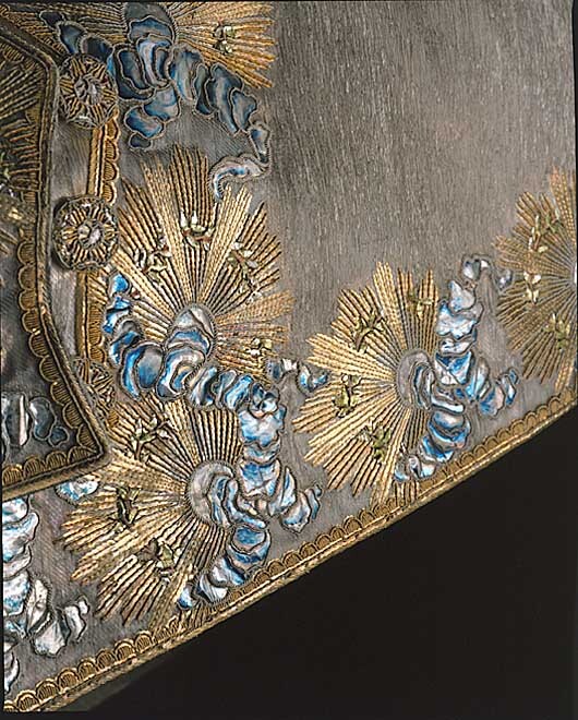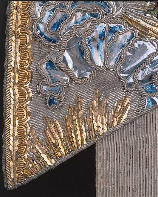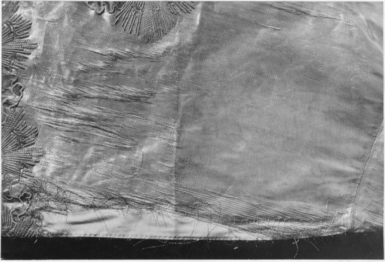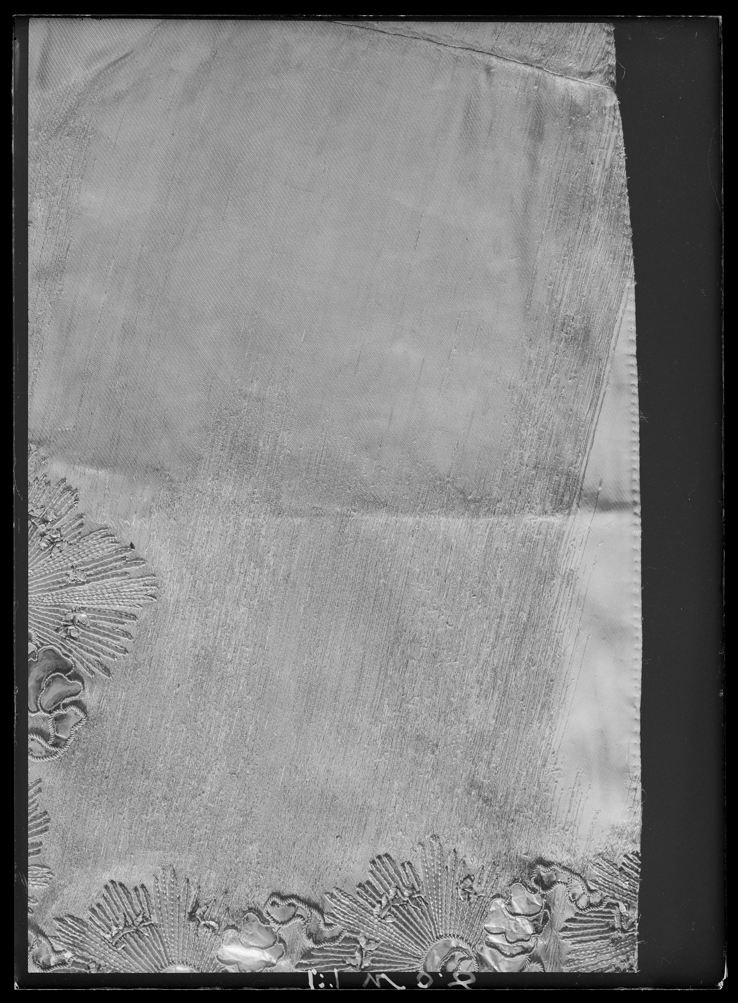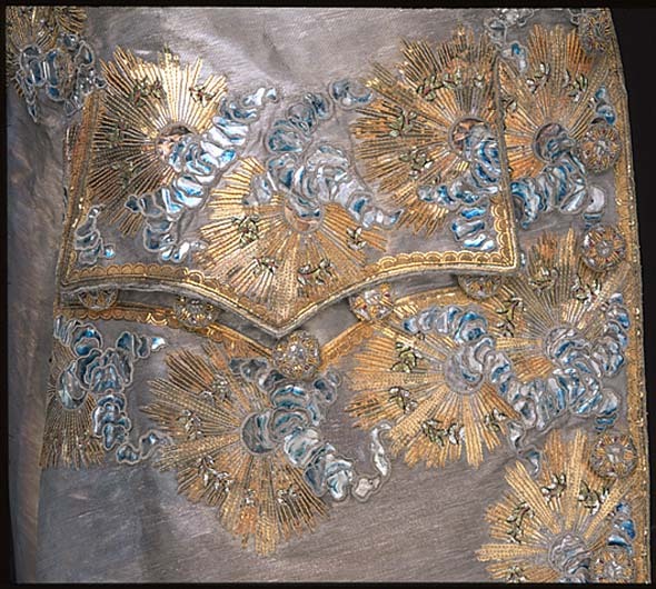 Använd vid bröllopet med Sofia Magdalena den 4 november 1766. Rock i silvertyg med svagt böjd framkant, vida skört med veckade sidsprund, snäva ärmar med mycket breda ärmuppslag eller manschetter. Den är mycket rikt dekorerad längs alla kanter med ett applikationsbroderi i blå metallfolie och guldtråd samt paljetter. Broderiet är av en typ där de olika dekorelementen kunde kombineras ihop på ett sätt som passade plagget och appliceras på plagget. Motivet som är detsamma på västen består av moln och strålande solar. Blomkvistar i strålarna. Mönsterrapporten är ca 11 cm och bredden ca 7 cm. Broderiet sitter längs med framkanten, på ficklocken och under ficklocken vid ficköppningen samt längs med sidsömmen, i sidsprunden, längs ärmhålssömmar, ärmsömmar och på manschetterna. I de inre delarna av vecken i sidskörten har broderiet kvar en otrolig gnistrande glans. Broderiet är av två storlekar i t.ex. sidsprundet är mönsterrapporten mindre. Längs med alla avslutande kanter på plagget löper en tunn snedvävd guldlinje samt en paljettrad samt en guldudd i av kantiljer på paljetter. Knappar: Knapparna är brodrade med paljetter och metalltråd som små smycken. Mitt fram sitter 18 knappar (ca 25 mm) den 19:onde saknas. Knapparna är fästade med 5,5-6 cm mellanrum. På ficklocken sitter 5 st (25 mm) knappar. Vänster sidsprund har 2 st (25 mm) knappar och Manchetten 4 st. Knapphålen är 12 och flertalet har nog inte knäppts, raden slutar vid ficklocken. Knapphålen är skodda med guldtråd. Vid höger axelsöm finns knapp och snodd för ordensband. Tygbredd ca 50 cm Vävteknik: kypert, inslag i silke och silverlanomspunnet silke. Foder i silvermoiré gjort på en vävd sidenrips som bl.a. har silverlan som inslag. Ryggen och ärmfodret i sidenkypert. Manchettens insida är i annat tyg, en rips, samma som fodret. Rocken finns uppritad, där de veckade spundens skärning blir tydlig. För att ta vara på det dyrbara tyget förekommer skarvar inne i skörtet. Anm. Broderierna är sannolikt utförda av den franske hovbrodören Léger Trémeau. Den 15 december 1767 levererar han en väst till franske kungen med ett noga beskrivet broderi som mycket väl överensstämmer med broderierna i Gustav III:s bilägersdräkt. Se Fastes de cour et ceremonies royales, s 90-91 Anm. Kraschanen broderad i Christoffer Sergels ateljé. Bilägersdräkten beställdes till Gustavs bröllop med Sofia Magdalena. Dräkten tillverkades i Paris och broderierna ansågs redan då mycket fina. se vidare brev ...(Lena) Redan 1773 finns dräkten i Klädkammaren. Enligt äldre vägledningar av livrustkammaren verkar dräkten ha varit utställd ganska länge under 1800-talets andra hälft och en bra bit in på 1900-talet.