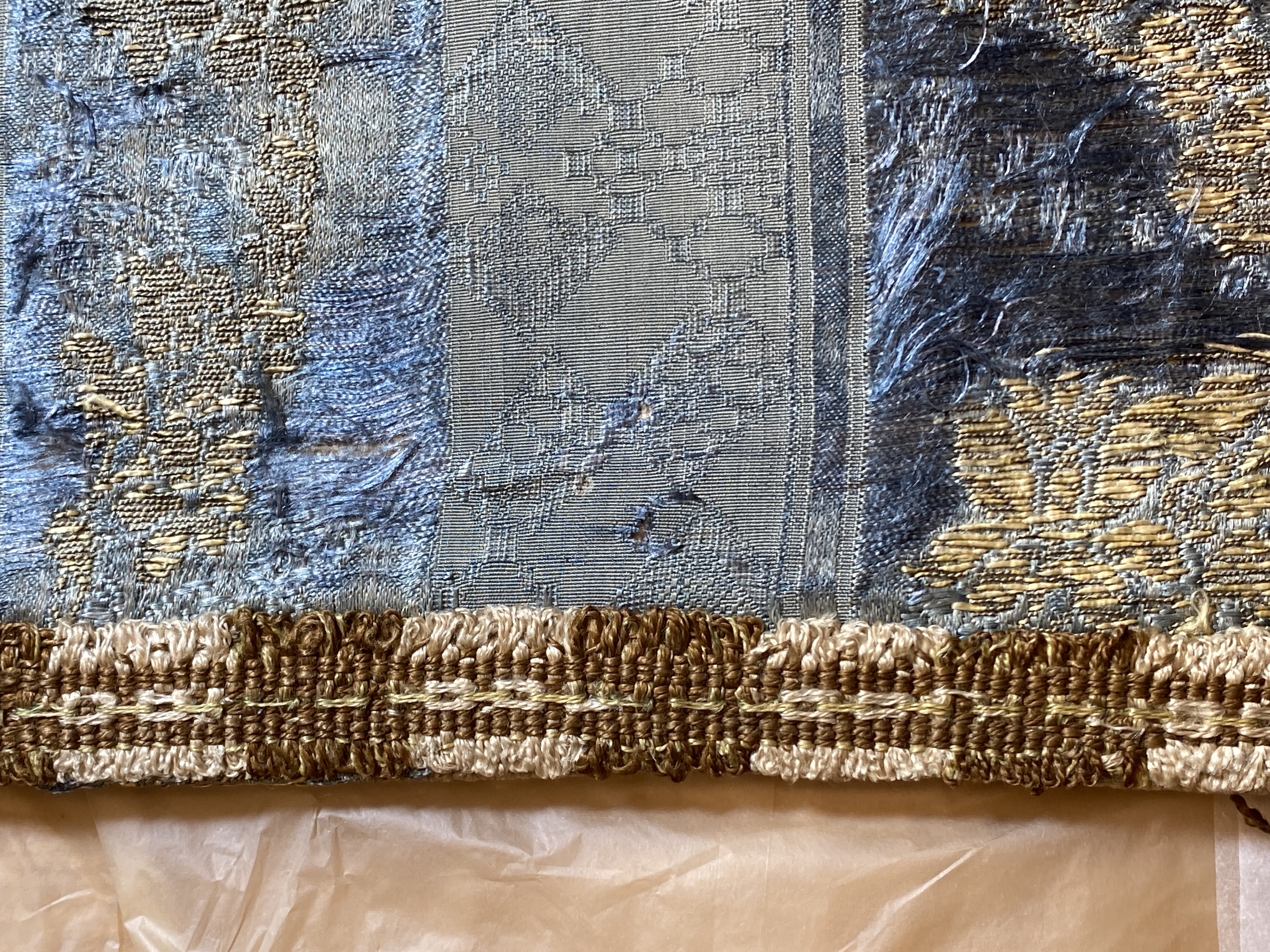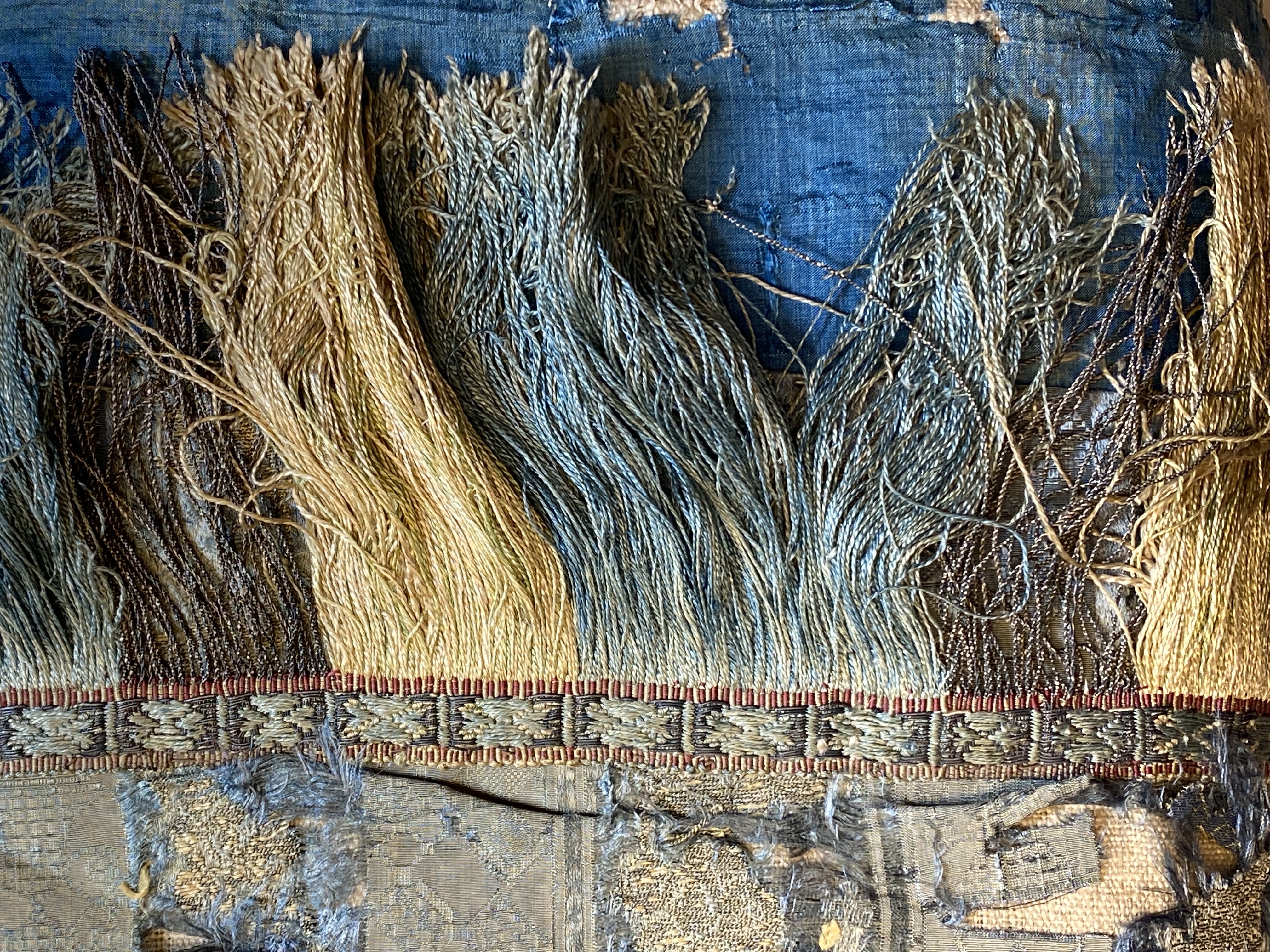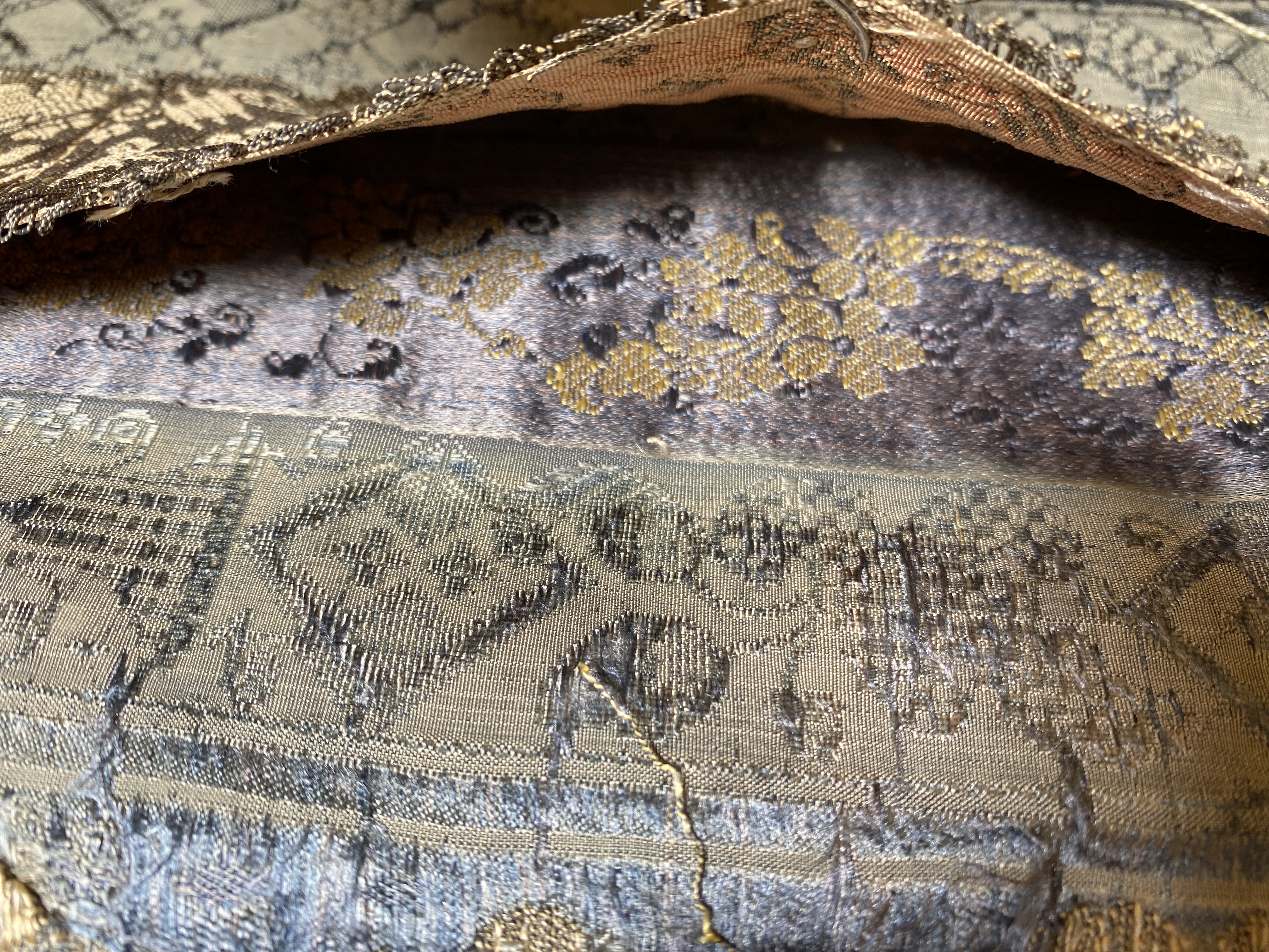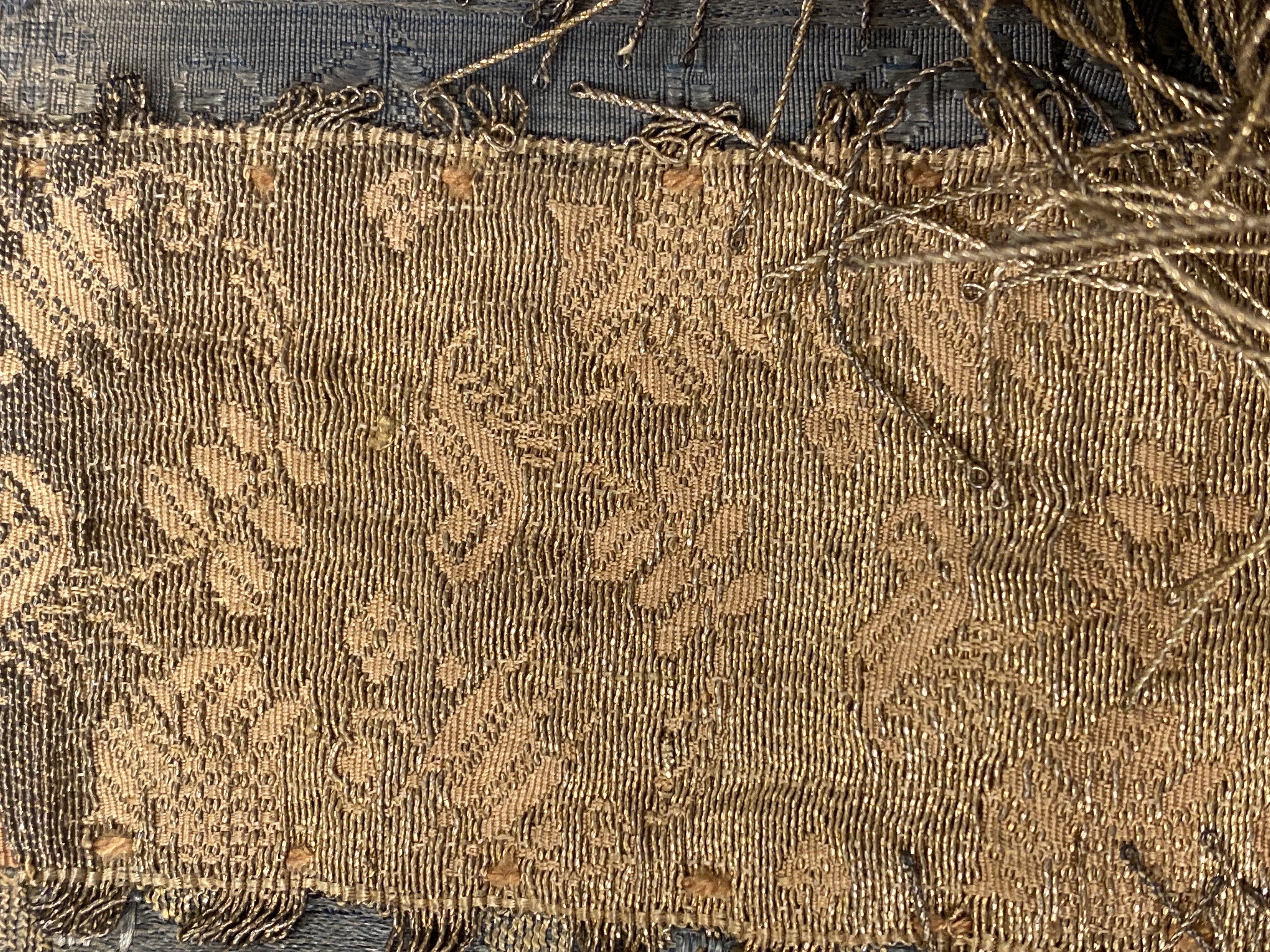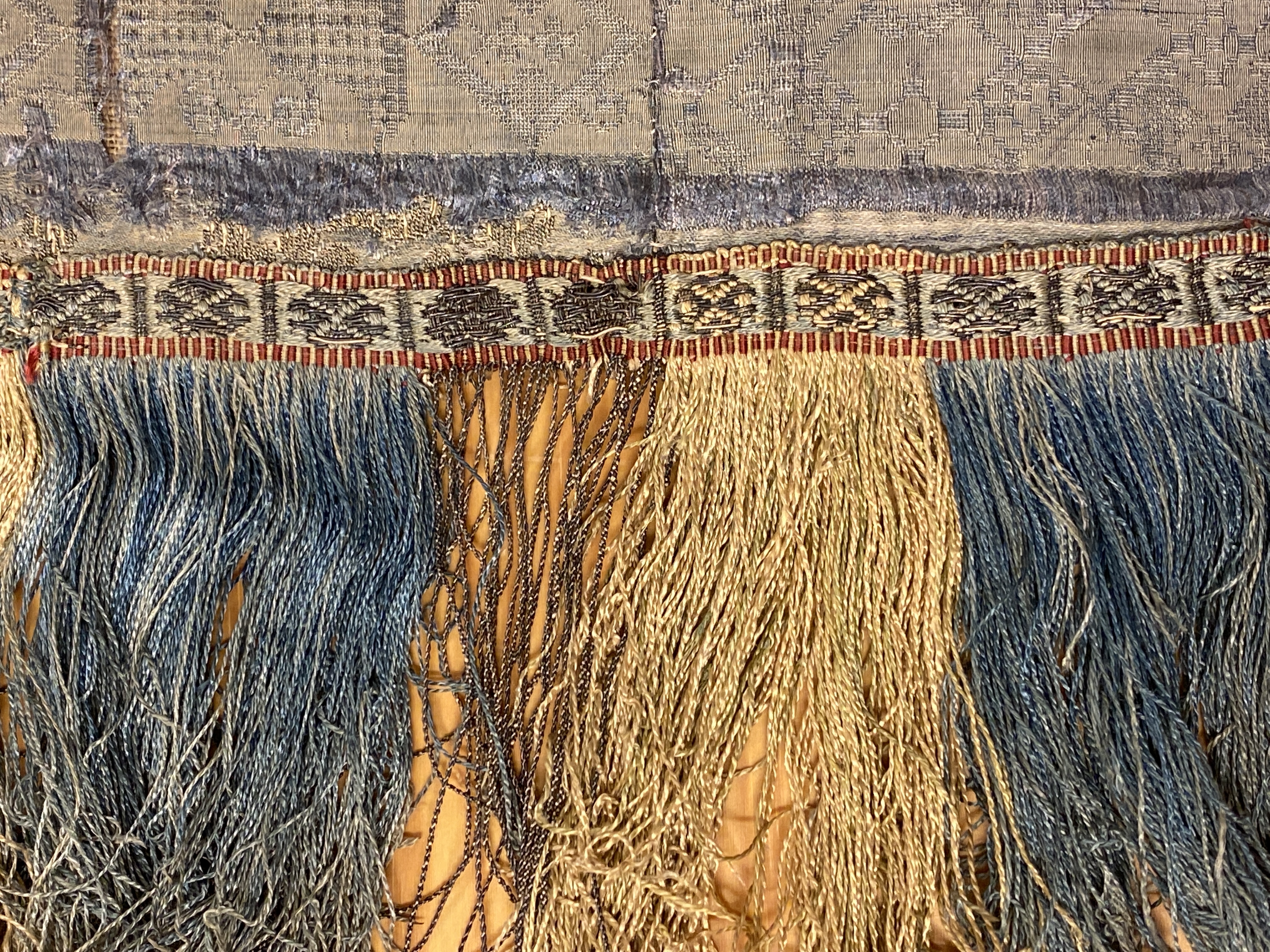 Blå, bleknad, randmönstrad sidenbrokad, applicerad dekor av band och fransar i guld och olikfärgat silke. JVW BMF 1712. Oblekt lärftfoder. Deponerad 1989.