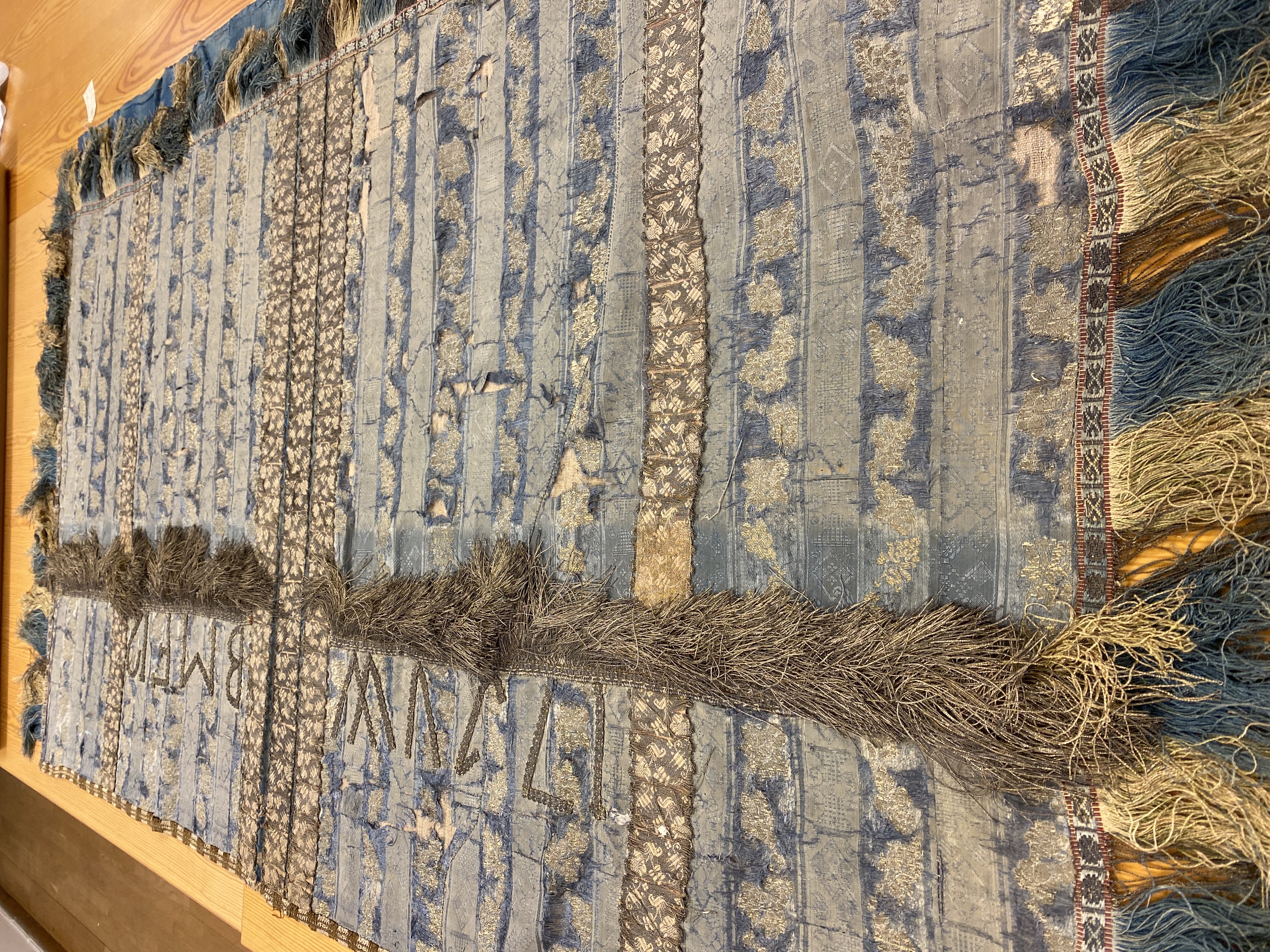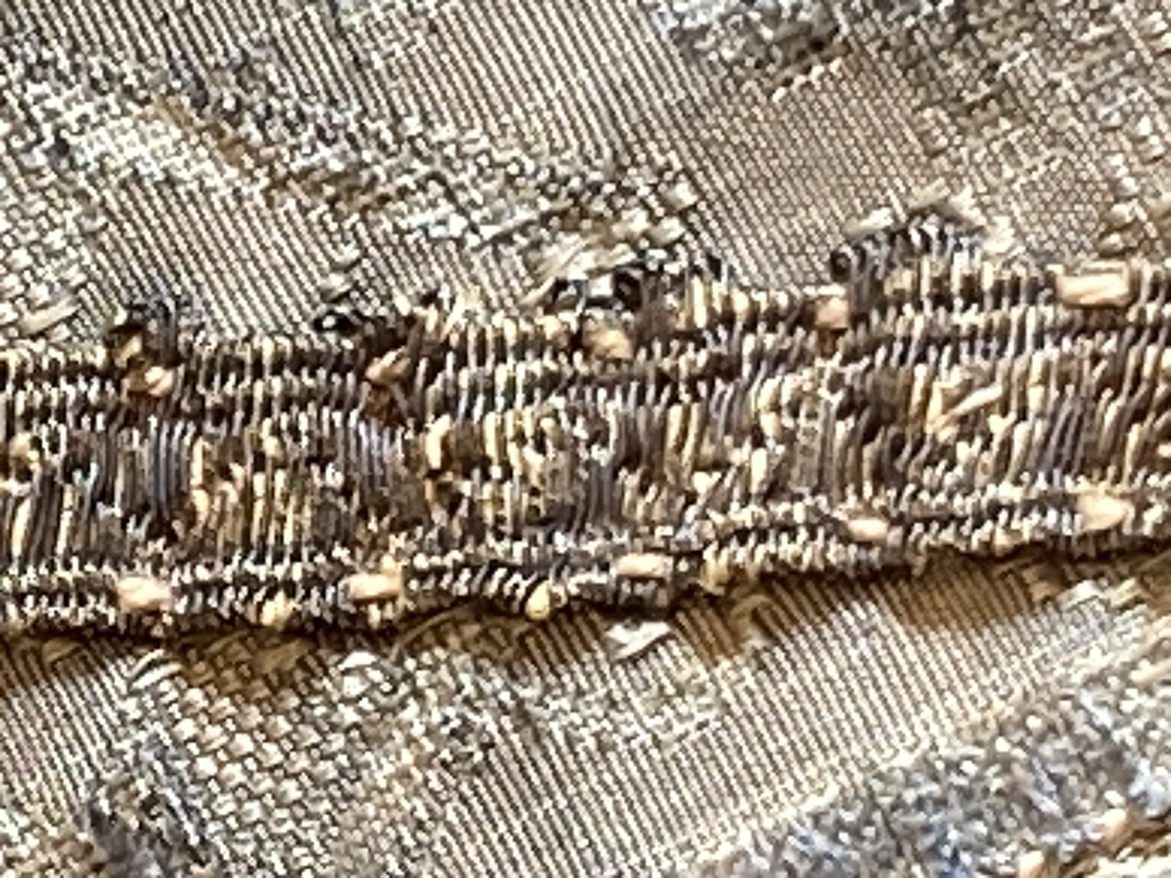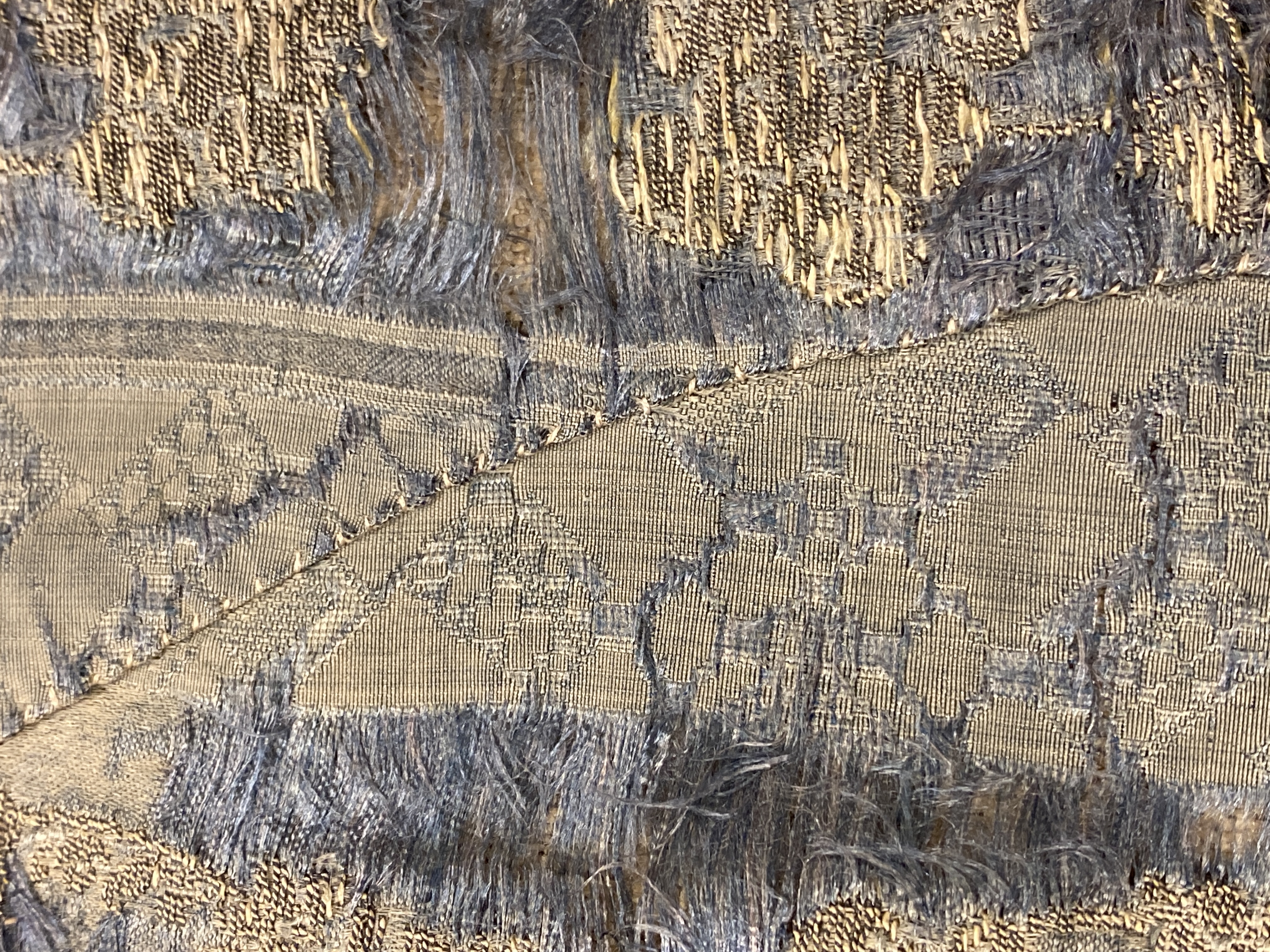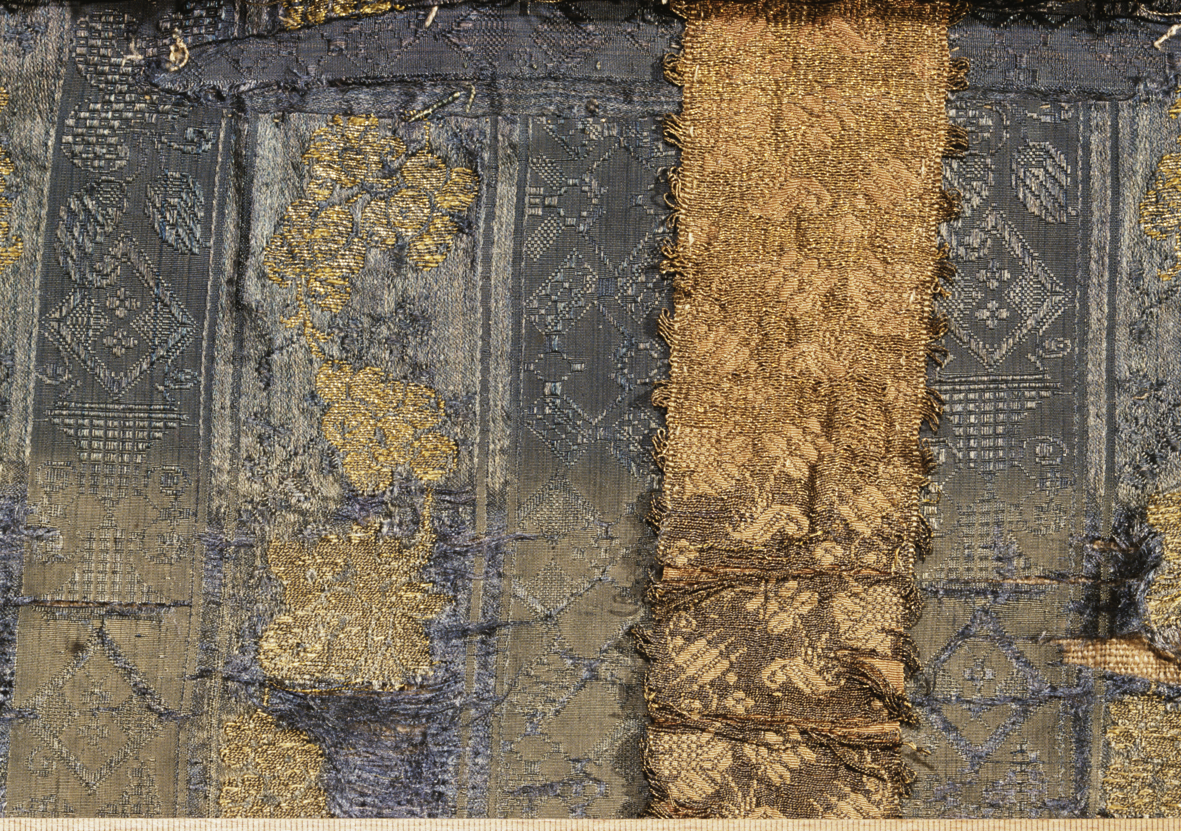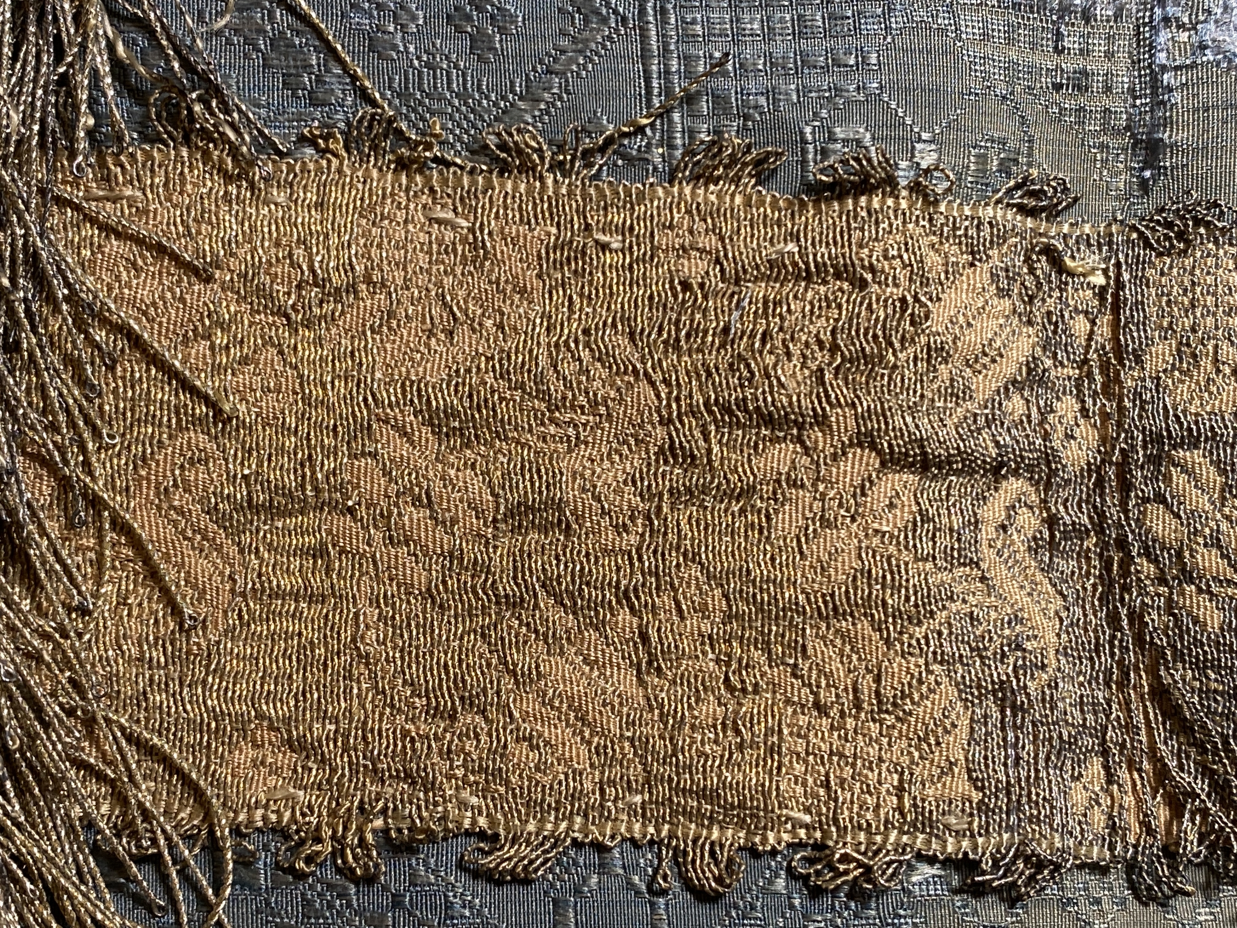 Blå, bleknad, randmönstrad sidenbrokad, applicerad dekor av band och fransar i guld och olikfärgat silke. JVW BMF 1712. Oblekt lärftfoder. Deponerad 1989.