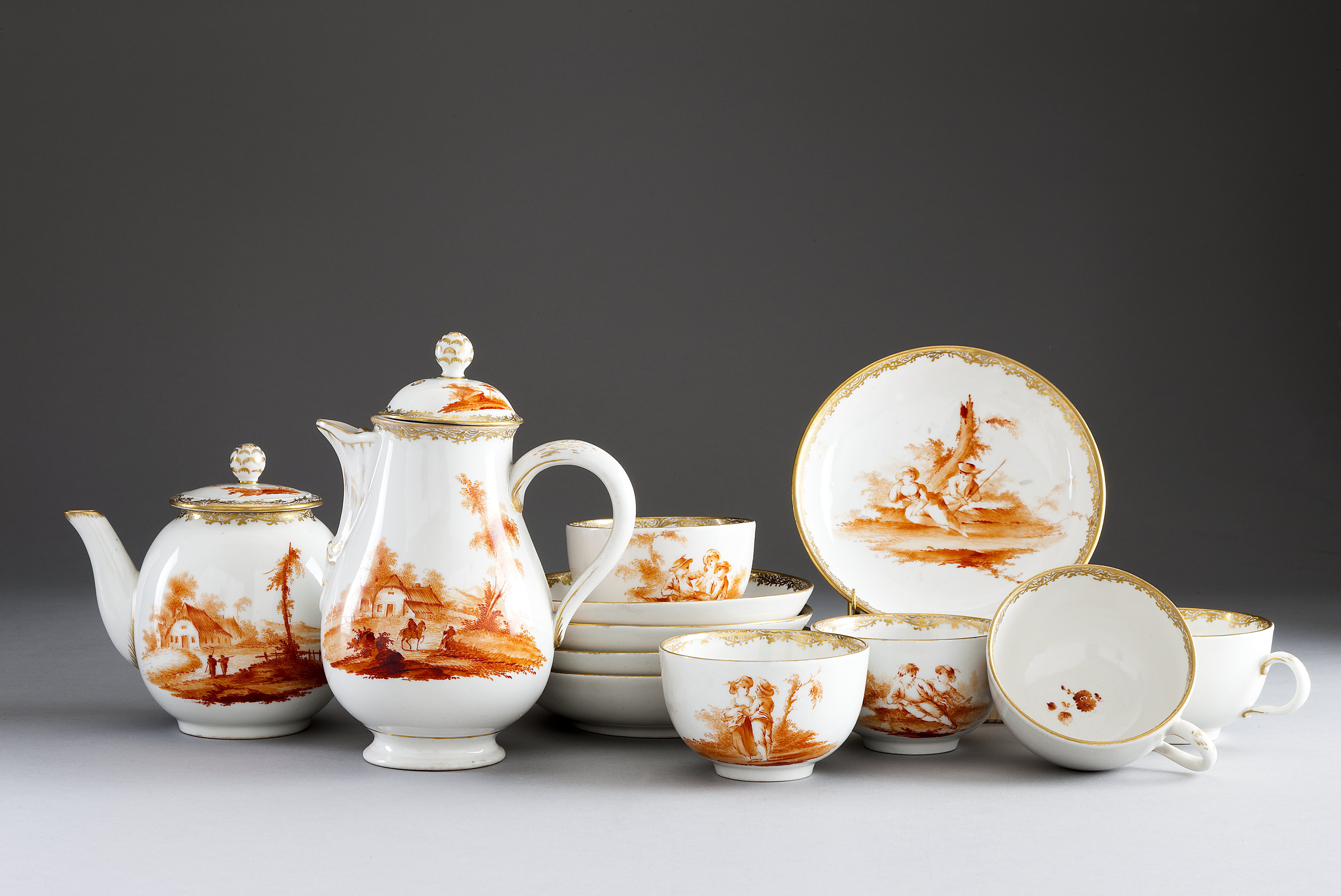 - Bestående af kaffekanna, tekanna, båda med lock, fem koppar och fem fat. Dekor: I rödgul camaïeu på glasyren samt i guld. Gemensamt i form och dekor: Koppar skålformiga, å fotkant; henklar flackstafviga, bågformiga. Fat lågt skålformiga, å fotkant. Å kannorna landskapsbilder, å koppar och fat figurscener. Kring kannornas mynning, lockens kant samt insidan af kopparnas och fatens brädd spets-liknande bårder i guld. Å bottnens utsida i blått under glasyren fabriksmärke: (= ROTHBERG). Kaffekanna: Päronformig, å utsvängd fotkant, mynningen något utsvängd. Pip insvängd, spetsig, nedtill afslutad i ett rokokoornament; öppning hjärtformig. Henkel flackstafvig och bågformig. Rundt pipens öppning samt fotkantens öfre del en guldrand; å pipen sparsam gulddekor, rokokoornamentets konturer förgyllda. Upptill å henkeln samt å dennas fasten sparsam förgyllning. Till vänster om henkeln: En ryttare i skridt åt höger, till höger därom en man med en staf i vänstra handen samt stödd mot en jordvall; längre upp på denna några buskar samt ett högt smalt träd, något böjdt åt vänster. Bortom ryttaren några sammanbyggda hus med halmtak, därbortom träd. Till vänster om det hitre huset rester af ett stängsel; i förgrunden några stenar och buskar. Till höger om henkeln: Till vänster på en upphöjning en vinkelbyggd kyrka med sadeltak af halm; vid frånsidan ett torn med spetsig spira, afslutad i ett kors. Bortom kyrkan träd och buskar, till höger om densamma ett högt smalt träd samt låga buskar. I bakgrunden till höger en borgruin med runda torn, därframför ett vatten; å hitre stranden ett stängsel. Å bottnens utsida vid fotkanten instämpladt: Lock: Kupigt, med utsvängd kant samt inåtfallande sarg; knopp af tallkottform samt på låg hals; därinvid ett rundt lufthål. Knoppen med dekor i guld som en kotte; kring halsens nedre del en rand, rundt lufthålet en smal dylik med små tagglika utskott. Å ena sidan om knoppen: Ett hus med sadeltak och gafveln snedt framåt vänster, på båda sidor omgifvet af träd och buskar; längst till vänster ett högt träd, något lutadt åt vänster. Å andra sidan: En stor sten, bakom denna buskar; längst till höger ett åt detta håll lutadt träd, synbarligen en gran. Höjd: 16 cm.; utan lock, höjd: 12.7 cm.; diameter: 8.7 cm. Lock, höjd: 4 cm.; diameter: 5.4 cm. Anm. Å undersidan af lockets kant en flisa urslagen. T ekanna: Bukig, med snedt uppstående mynningskant samt å fotkant. Pip svagt S-formad, afsmalnande uppåt; i kannan vid pipens fäste fyra silhål. Henkel flackstafvig, båg-formig. Rundt pipens mynning och nedre delen af dess faste längdgående korta ränder i guld. Å henkelns fästen dylik dekor, dessutom upptill å henkelns utsida en tredelad båge af längdgående korta ränder; därnedanför en grupp af afbrutna dylika ränder. Till vänster om henkeln: I förgrunden två män, vända bortåt, stående på en upphöjning framför en landtgård; männen med ryggbörda och staf. Till höger om männen en trädstam med löfverk, nedtill vid trädstammen ett stängsel. Gården med tre synliga byggnader, den i midten närmast och med gafveln framåt, samtliga med halmtak; bortom husen träd, buskar och bergshöjder. Till höger om henkeln: I förgrunden till vänster på en upphöjning två otydliga figurer, vända bortåt, den högra sittande, båda med staf. Till vänster därom en af-bruten trädstam med löfverk. I mellanplanet bortom en slättmark, hvarå en väg, ett lågt bredt hus med sadeltak och gafveln hitåt, å vänstra takfallet en hög skorsten; till vänster och bortom huset träd och buskar. Å bottnens utsida vid fotkanten instämpladt märke som å kaffekannan. Lock: Svagt kupigt, nära kanten en smal list, sarg inåtfallande. Knopp tallkottformig, å låg hals. Knoppen med dekor i guld som en kotte; kring halsen en rand. Å ena sidan om knoppen: Till vänster en sten framför en åt vänster lutad buske, till höger ett träd; däremellan i bakgrunden en bergshöjd. Å andra sidan: Till höger en sten jämte en buske, längst till höger en åt samma håll lutad gles gran. Höjd: 11.4 cm.; utan lock, höjd: 8.9 cm.; diameter: 8.7 cm. Lock, höjd: 3.1 cm.; diameter: 6 cm. Koppar: Å bottnens insida ett eller två ströblomster, liknande prästkragar; å kopp 5 en ros. Å bottnens utsida (utom å kopp 5) instämpladt eller ristadt: Höjd: 4.6—4.8 cm.; diameter: 7.6—7.8 cm. Upptill å henkeln samt å dennas fasten sparsam förgyllning. Å den henkeln motsatta sidan: Å kopp 1: Ett stående par, hållande om hvarandra; till vänster flickan, i bredbrättad hatt samt djupt urringad klädning med halflånga ärmar, till höger ynglingen, vänd åt vänster, i lågkullig hatt, kort rock samt knäbyxor. I bakgrunden buskar samt en trädstam till höger. Å kopp 2: Tre sittande ynglingar i bredbrättade hattar, uppknäppta rockar, ljusa skjortor samt knäbyxor, den i midtexl med endast öfverkroppen synlig. Längst till vänster en buske och ett träd, längst till höger en buske. Å kopp 3: Tre sittande figurer; till vänster en yngling, hufvudet vändt åt höger, vänstra armen sträckt åt vänster, handen pekande åt samma håll, i bredbrättad hatt, uppknäppt rock och knäbyxor; i midten en flicka, vänd åt vänster, i hatt och urringad klädning med halflånga ärmar; till höger en yngling, vänd bortåt, endast till hälften synlig samt i bredbrättad lågkullig hatt. Längst till vänster ett träd, längst till höger en buske. Å kopp 4: Två sittande figurer; en flicka, lutande sig åt vänster, i hatt och urringad klädning med halflånga ärmar; bakom henne till höger en yngling, synlig till hälften, ansiktet vändt åt vänster, i hatt med fjäder samt rock, uppknäppt vid halsen. Till vänster och höger buskar, till höger dessutom en afbruten trädstam. Å kopp 5: Två sittande figurer; en yngling, lutande sig åt vänster, hufvudet vändt 