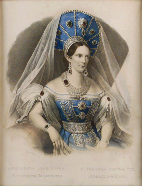 Litografin delvis handkolorerad (enl. Ulf Leijon 1983-01-10) , det litografiska trycket är vid produktionen uppfodrat på ett stödpapper av sämre kvalitet. Knäbild , sittande. En face något höger. Blå klänning med silverbroderier. Hög solfjädersformad huvudbonad. Vit tunn slöja som faller ned från huvudbonaden. Inskrift "ALEXANDRA FEODOROVNA imperatrice de Russie". Förgylld profilerad ram. Ramlistens bredd 90 mm.