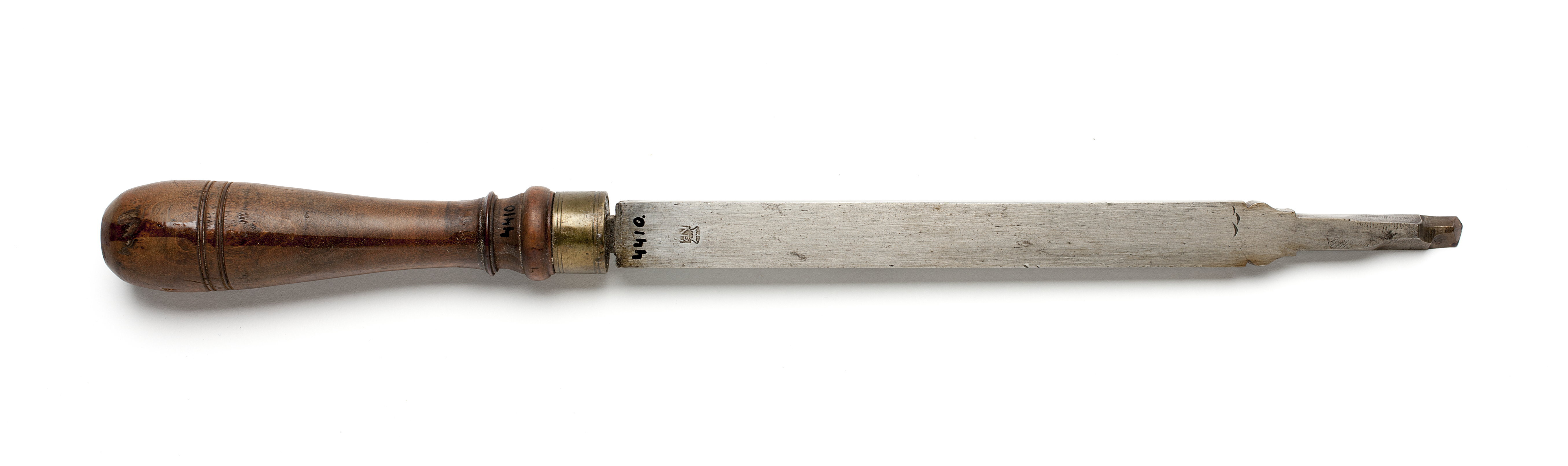 Klinga med rektangulär genomskärning, via profilering på två sidor övergående i smalare ände. Stämplat på klingan: "IK" under krona, Johan Kesemaker, Stockholm, "P" (proberstämpel) och "NB" under krona. Eggen formad som trubbig vinkel med en kortare och en längre sida. Stämplat på skaftet: "NB". Svarvat skaft av päronträ, med två vulster nedtill ("rydboholmstyp"). Mässingsring.