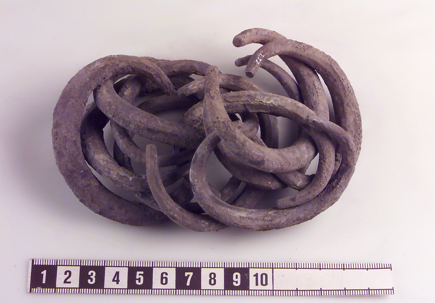 Komposit bestående av 11 armbyglar av svagt mångkantig ten med avsmalnande ändar, löst sammanlänkade med varandra. Kraftigt korroderat ytskikt på samtliga armbyglar. Rester av stämpeldekor (samtliga?) bestående av bl. a trianglar.