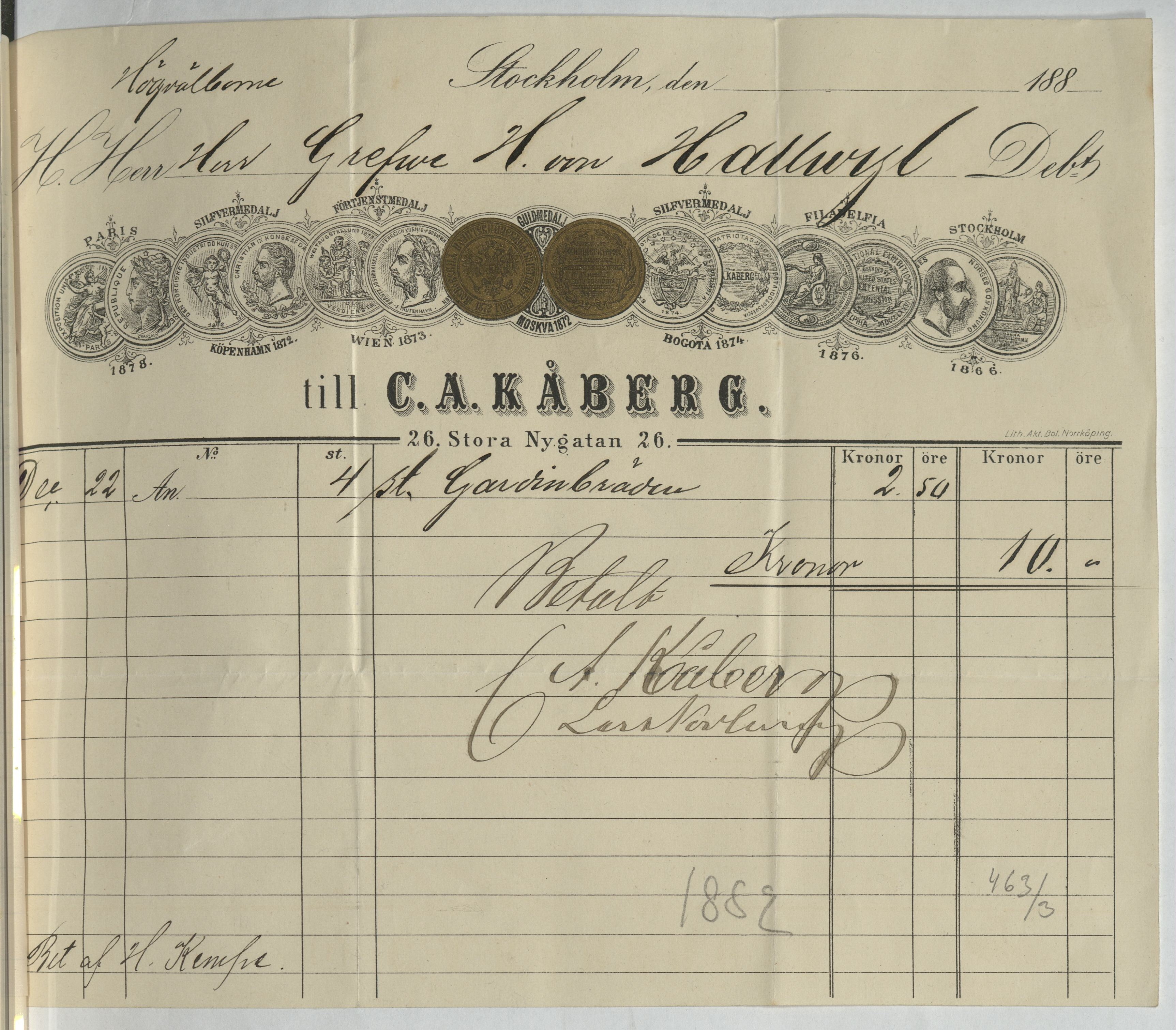 Kvitto från C. A. Kåberg. Gällande inköp av fyra stycken gardinbrädor. Stockholm, 1882.