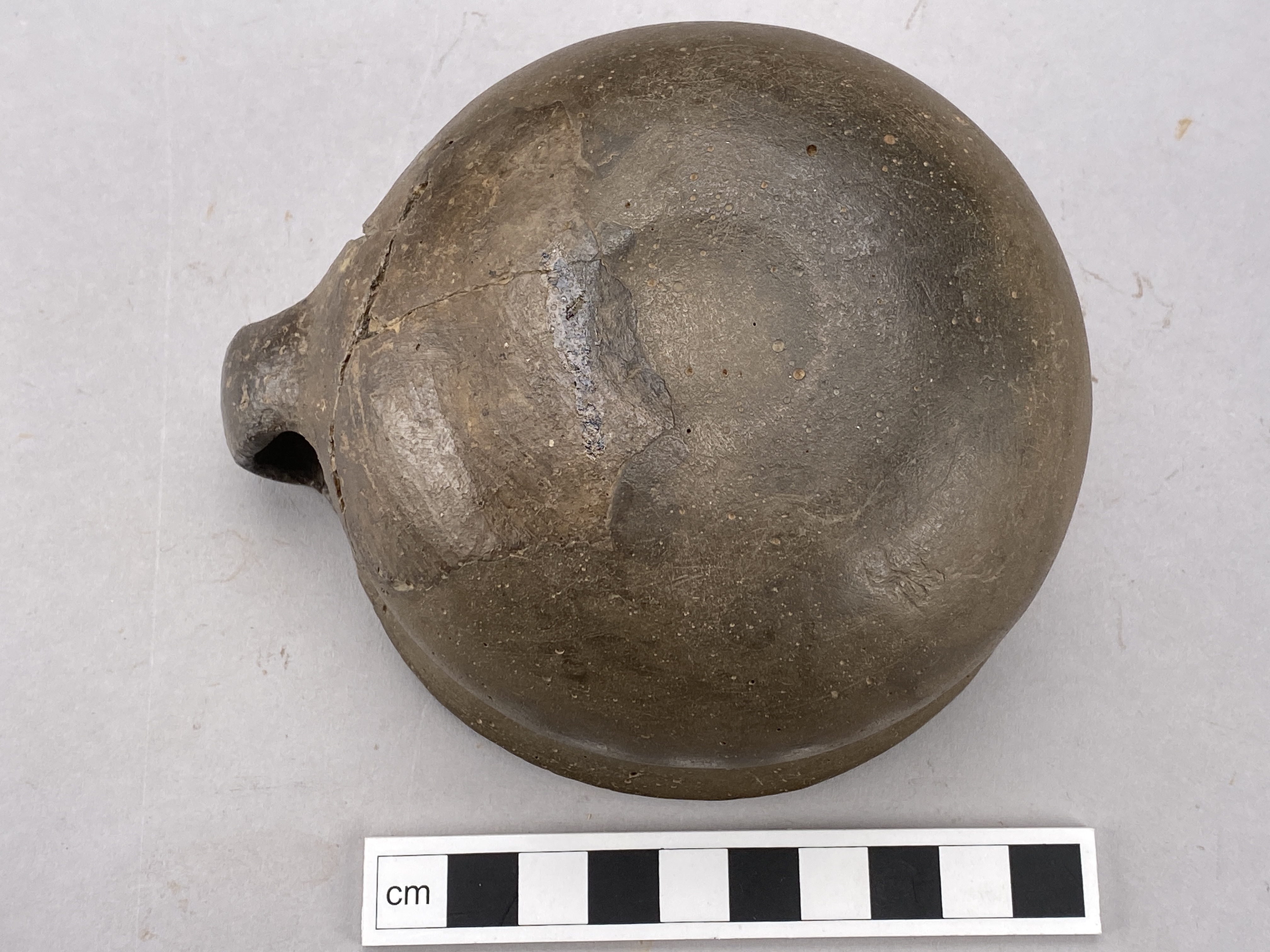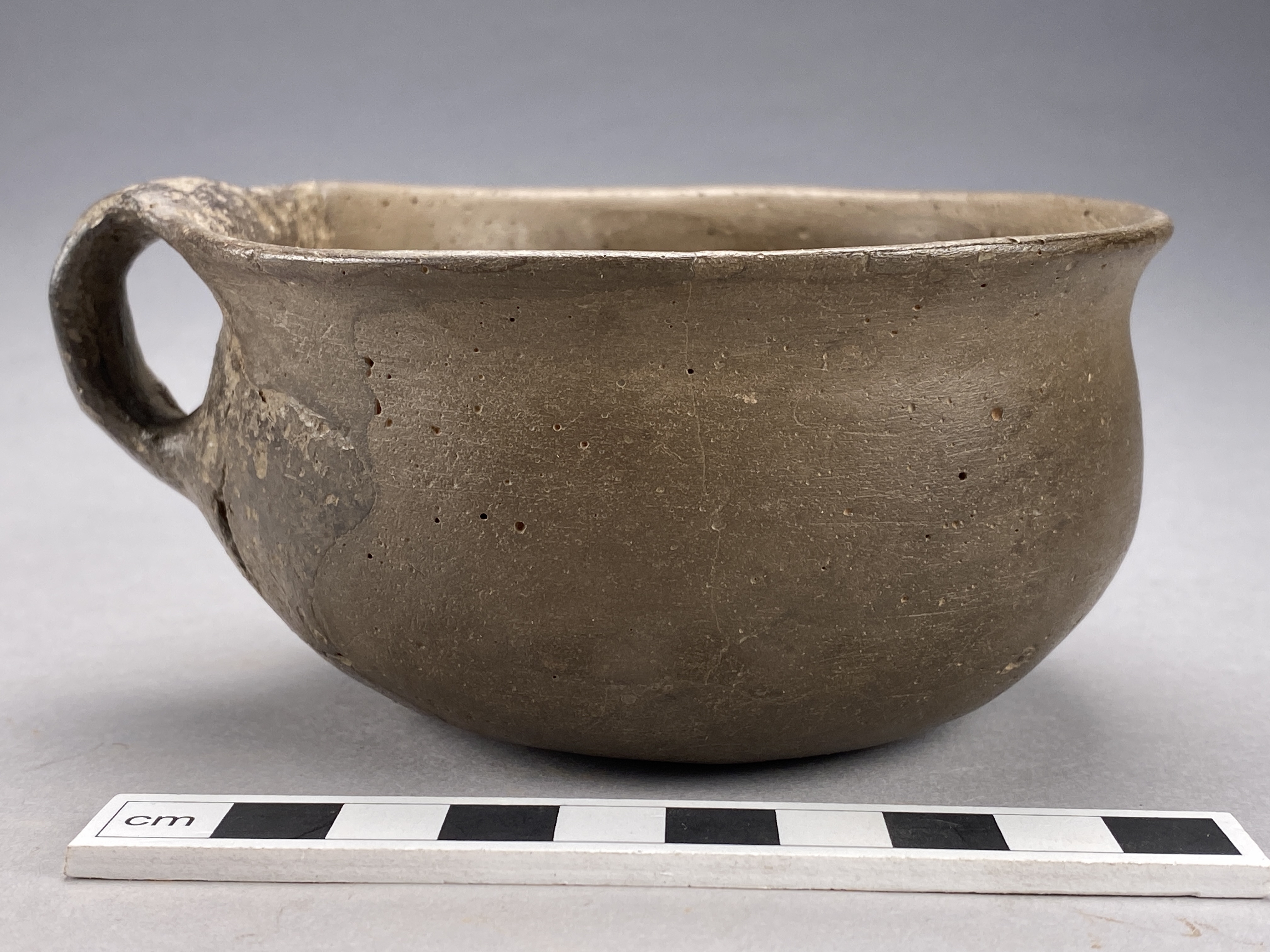 Låg skål med bandformigt öra. reducerat bränt. mynning, hals, skuldra, buk, botten och konkav botten. Reducerat bränt