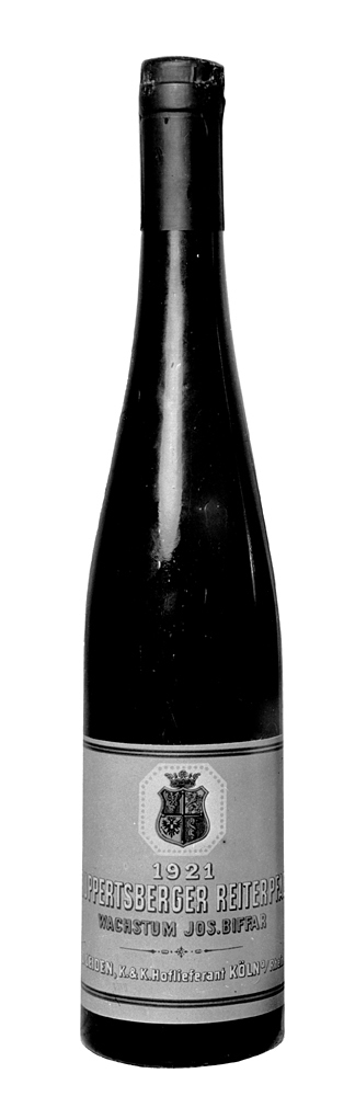 RUPPERTSBERGER REITERPFAD 1921, en helbutelj Butelj av mörkbrunt glas. Kägelformig, kring vars mynning en bandliknande utsvällning (s. k. stärkring); bottnen skålig. Etikett gul, på denna text och firmanamn i vitt jämte text i guld ("Wachstum JOS. BIFFAR"), däröver en konturerad fydelad vapensköld i färger samt under krona mot vit botten, nederst i vitt: "D. LEIDEN, K. & K. Hoflieferant, Köln a/Rhein". Kapsyl av förtent bly, svartfärgad, ovanpå varumärke och text i relief. Höjd: 35,5 cm.; diameter: 7,3 cm. Inköpt av Wilhelmina von Hallwyl den 8 November 1929 hos AB Stockholmssystemet.
