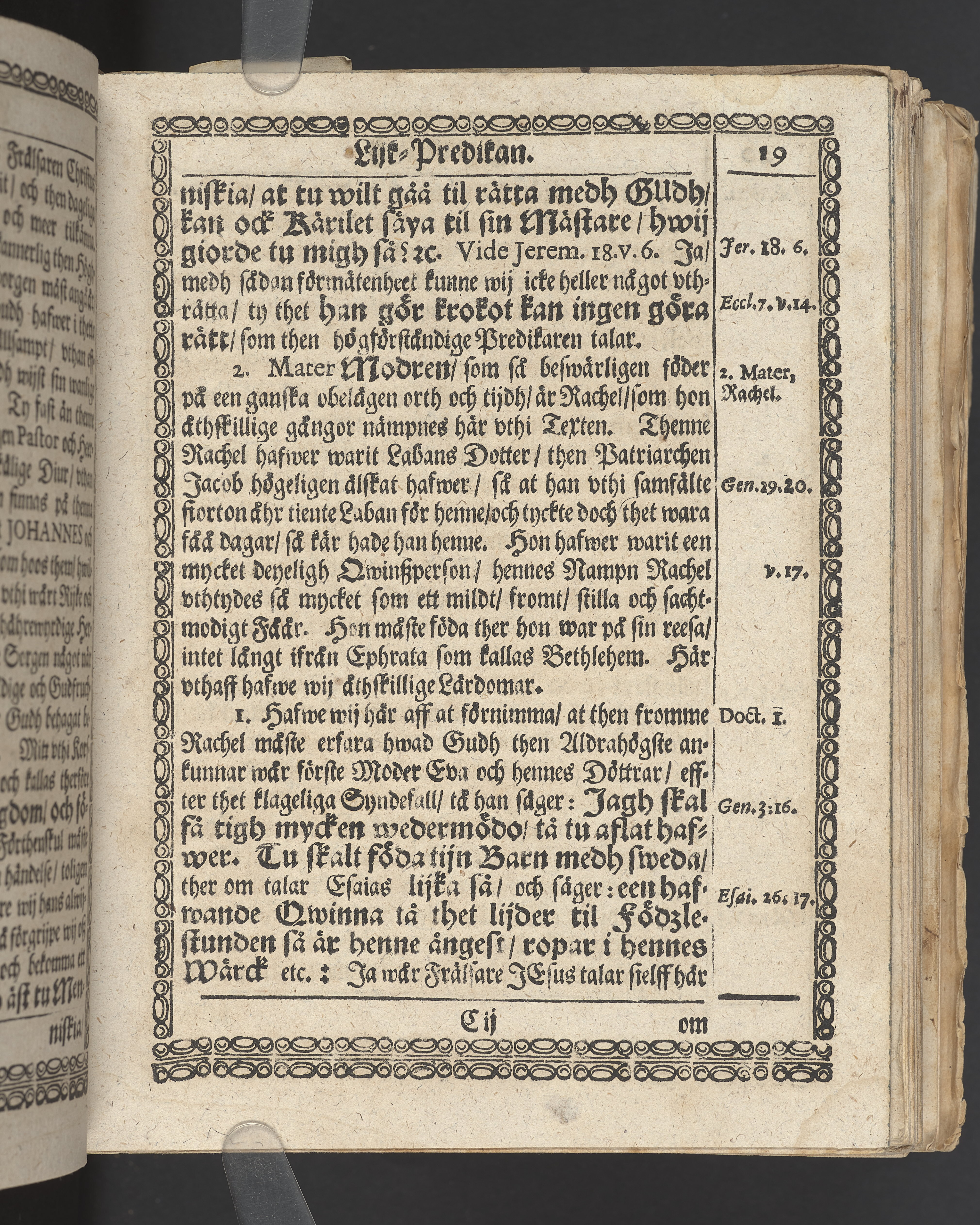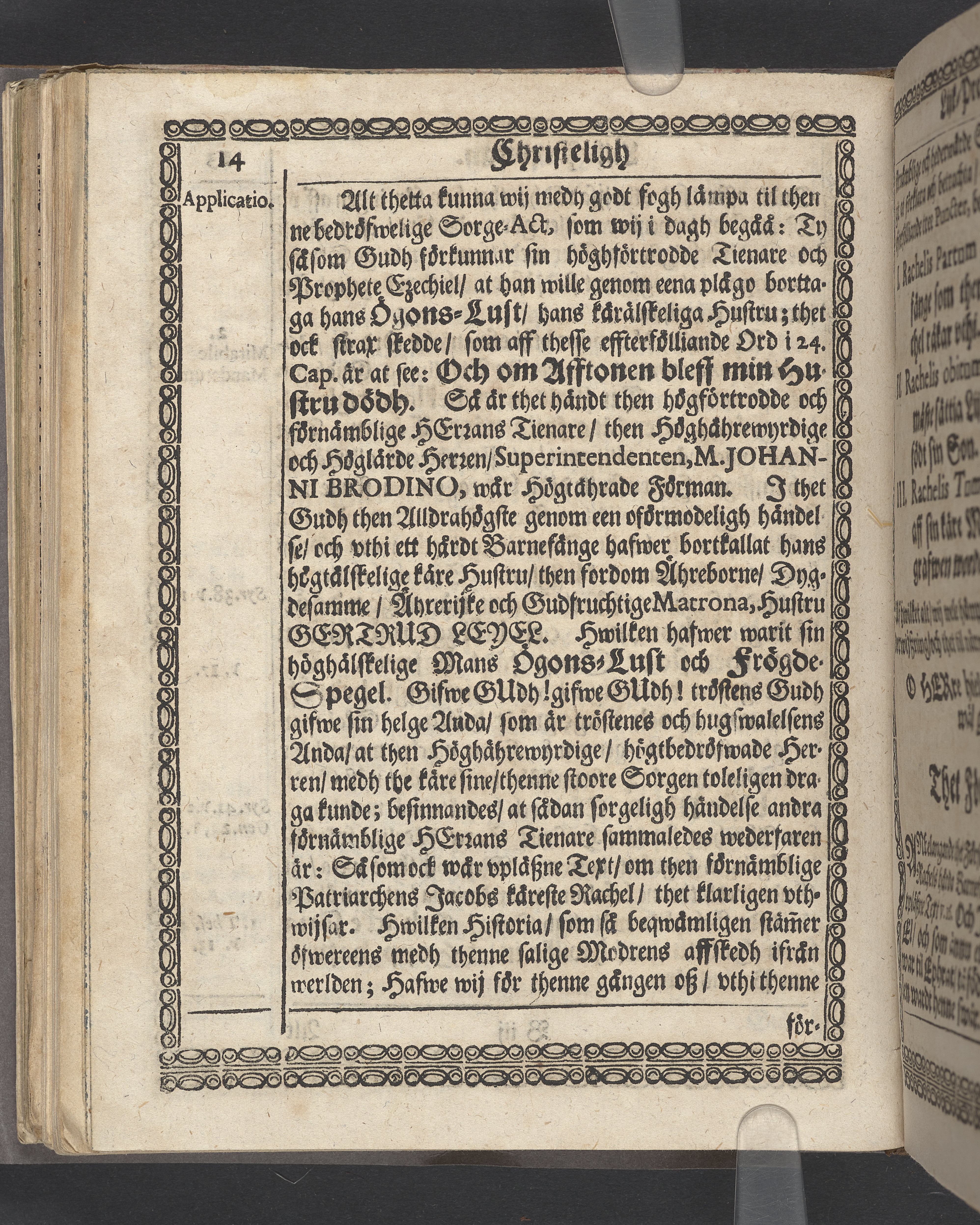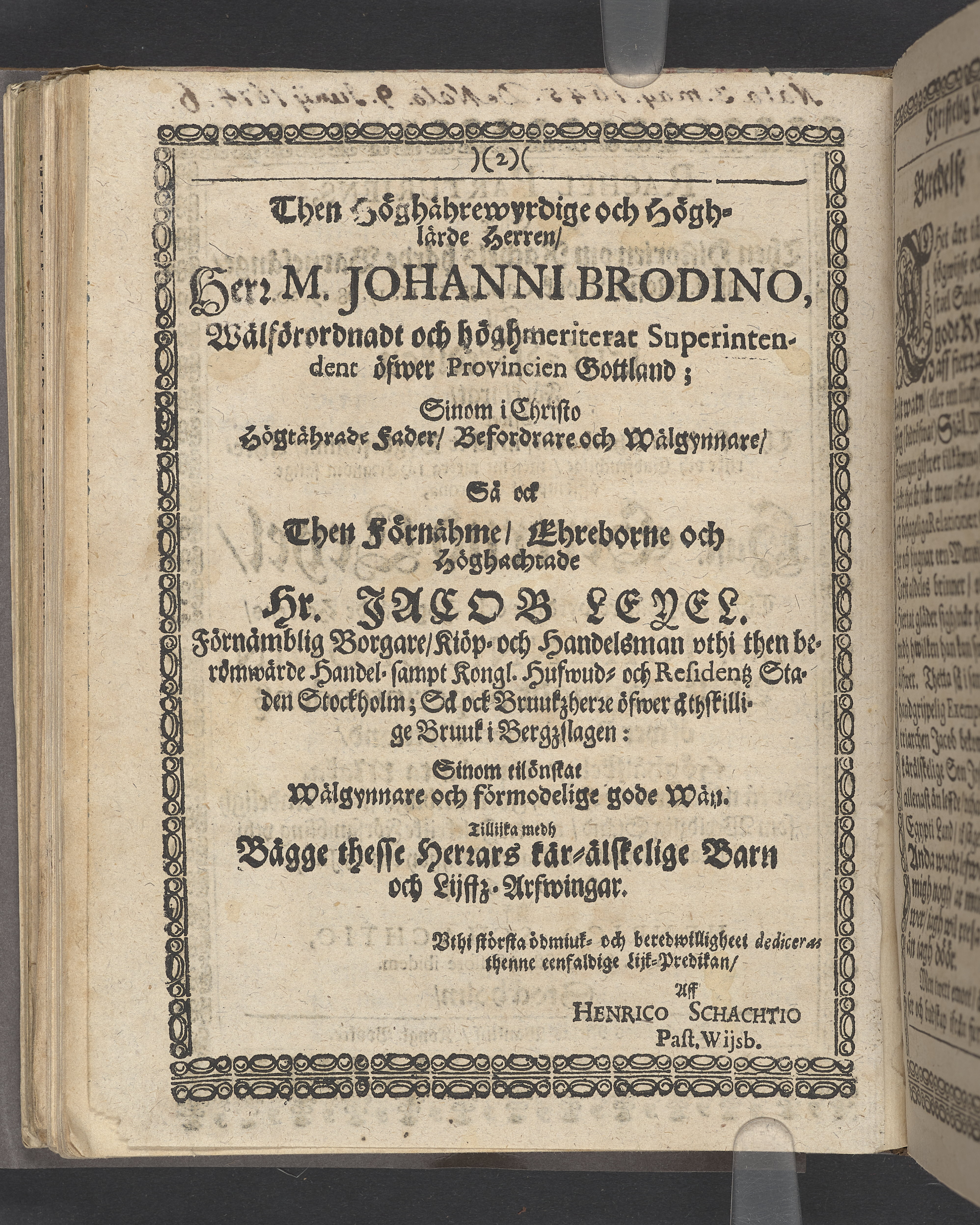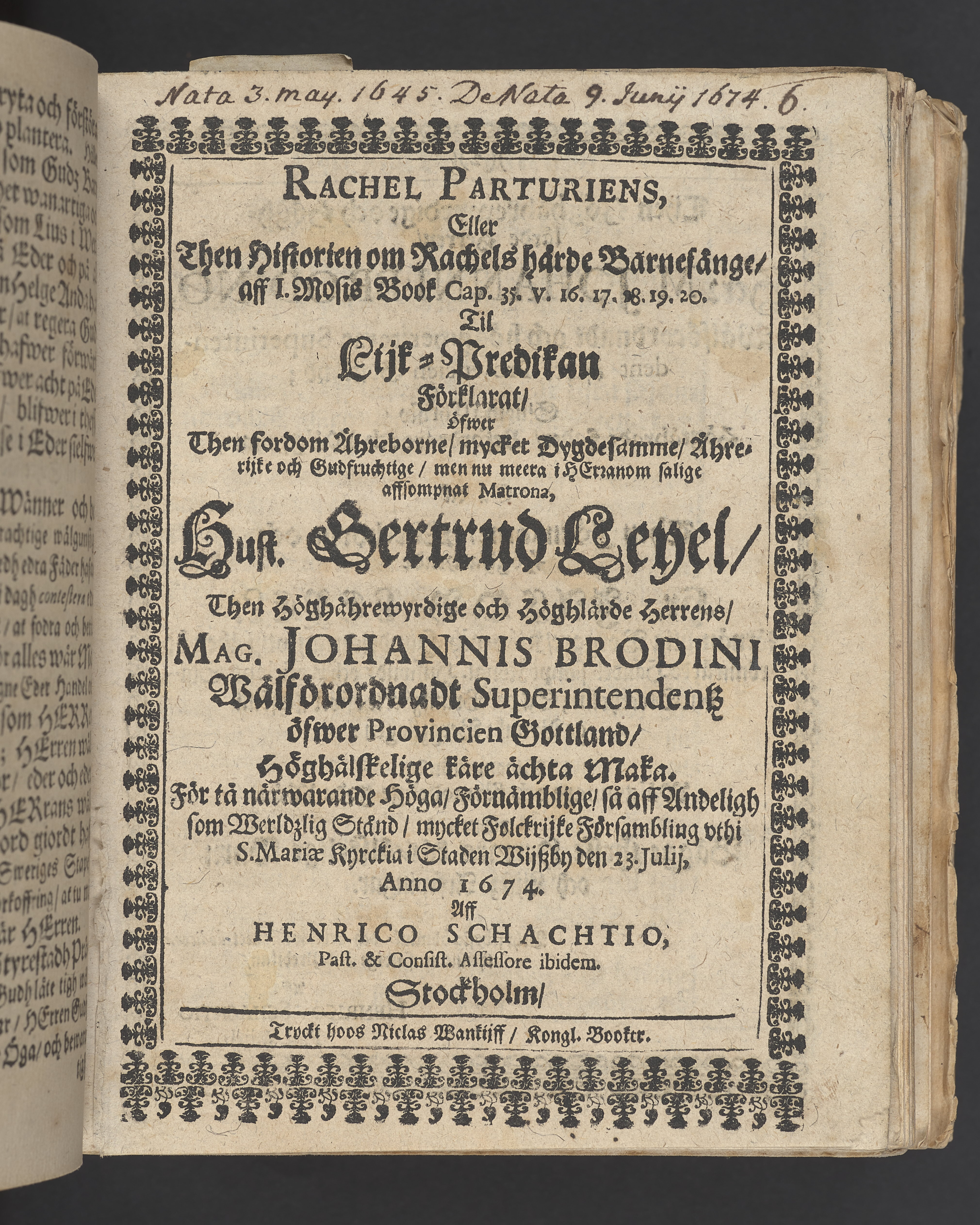 Rachel parturiens, eller then historien om Rachels hårde barnefånge ... til lijk-predikan förklarat, öfwer ... Gertrud Leyel ... Mag. Johannis Brodini wälförordnadt superintendentz öfwer provincien Gottland, höghälskelige käre ächta maka ... vthi S. Mariæ kyrckia i staden Wijszby den 23. julij, anno 1674. Aff Henrico Schachtio ... Stockholm, tryckt hoos Niclas Wankijff, kongl. booktr.