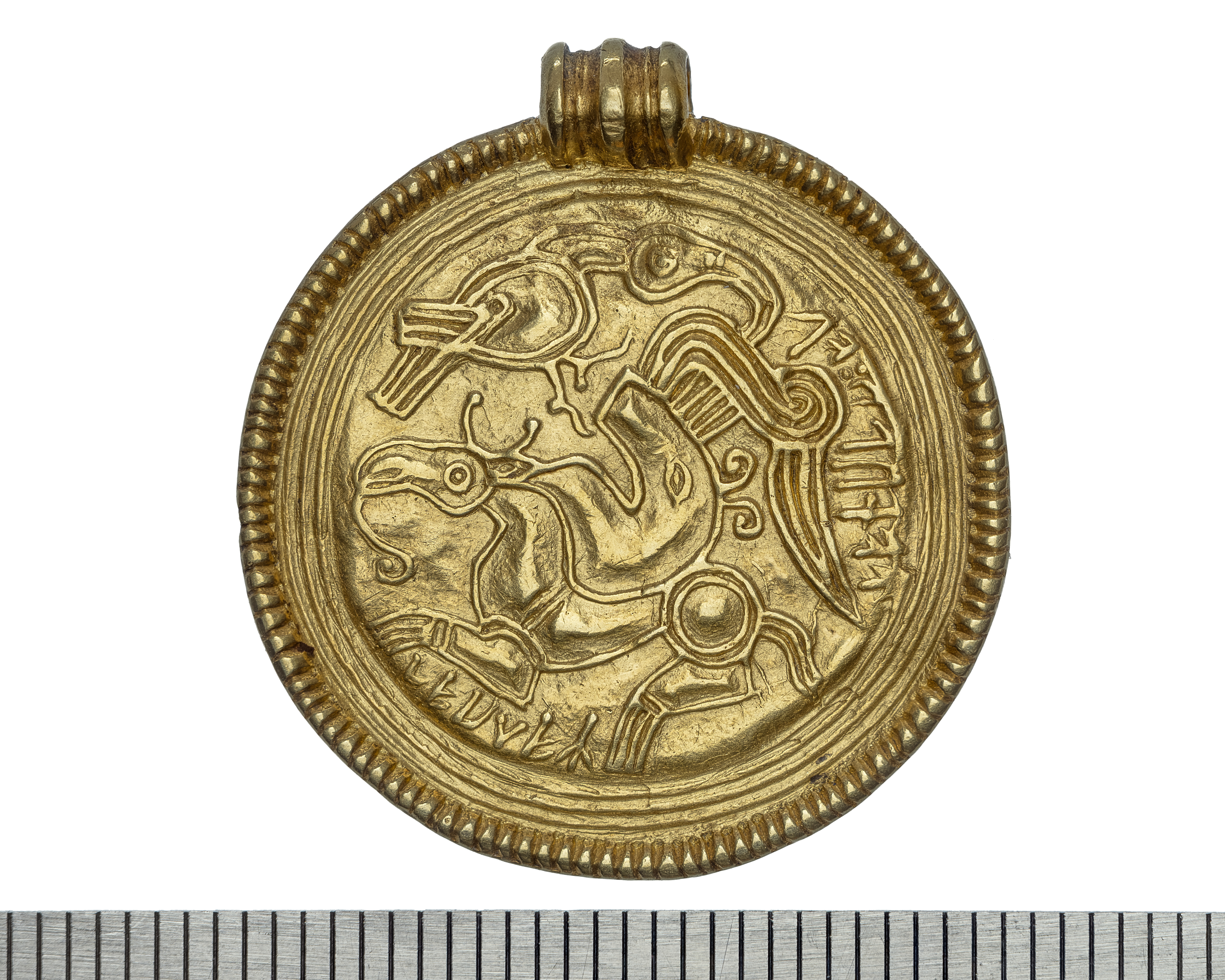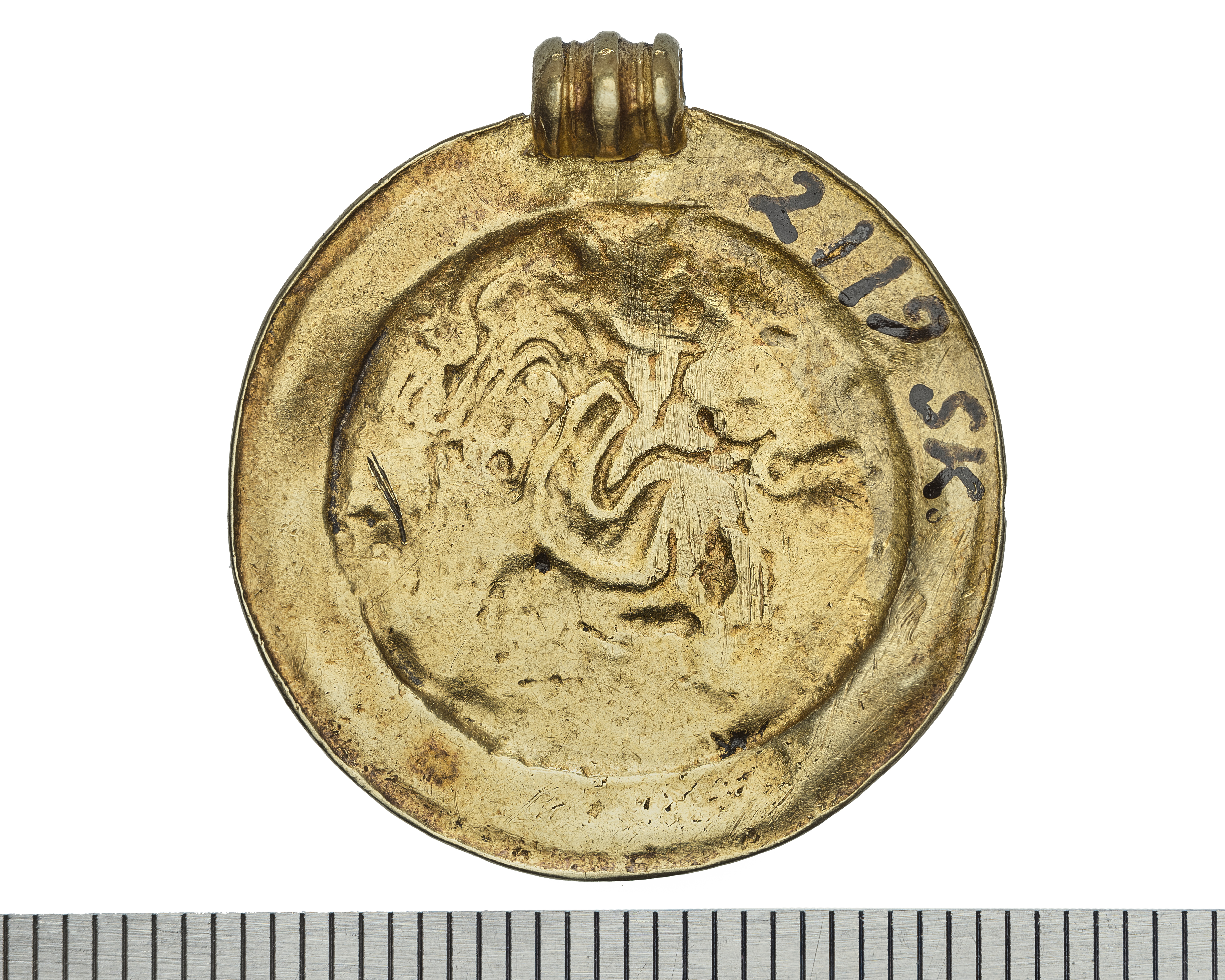 C-brakteat med huvud på häst. svastika framför ansiktet. dubbla bårder runt motivet. Pärlstav runt och ögla