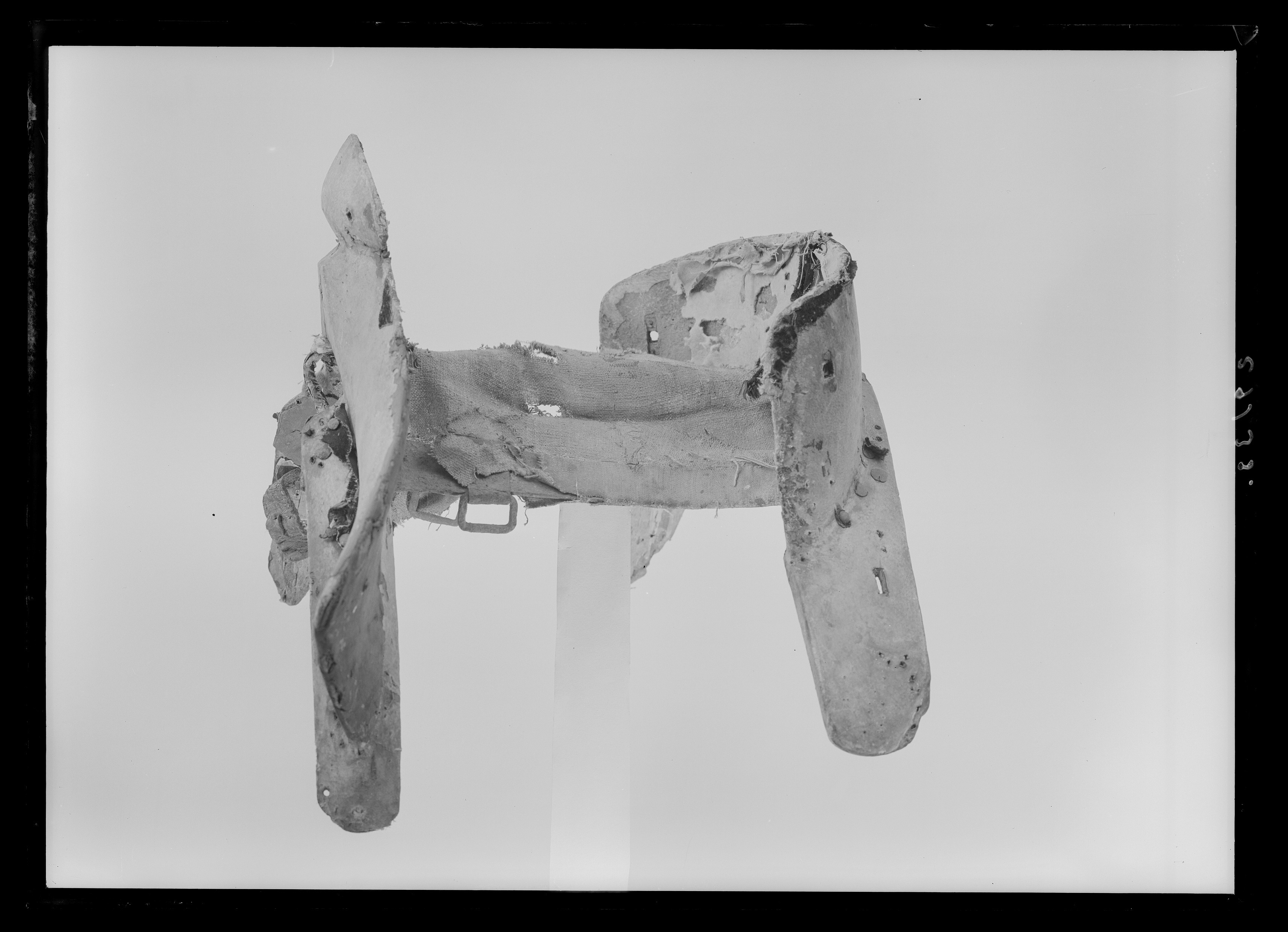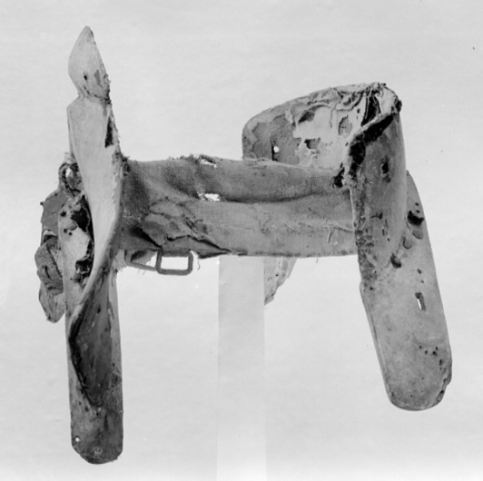 Bom och stomme till bomsadel, klädd med tunt skinn ursprungligen överklädd med svart sammet. Sadelknapp i form av halvcirkelformad skåra.Framför frambommen och bakom bakbommen ett fåtal tännlikor av stål. Framtill två läderstroppar för förbygel.