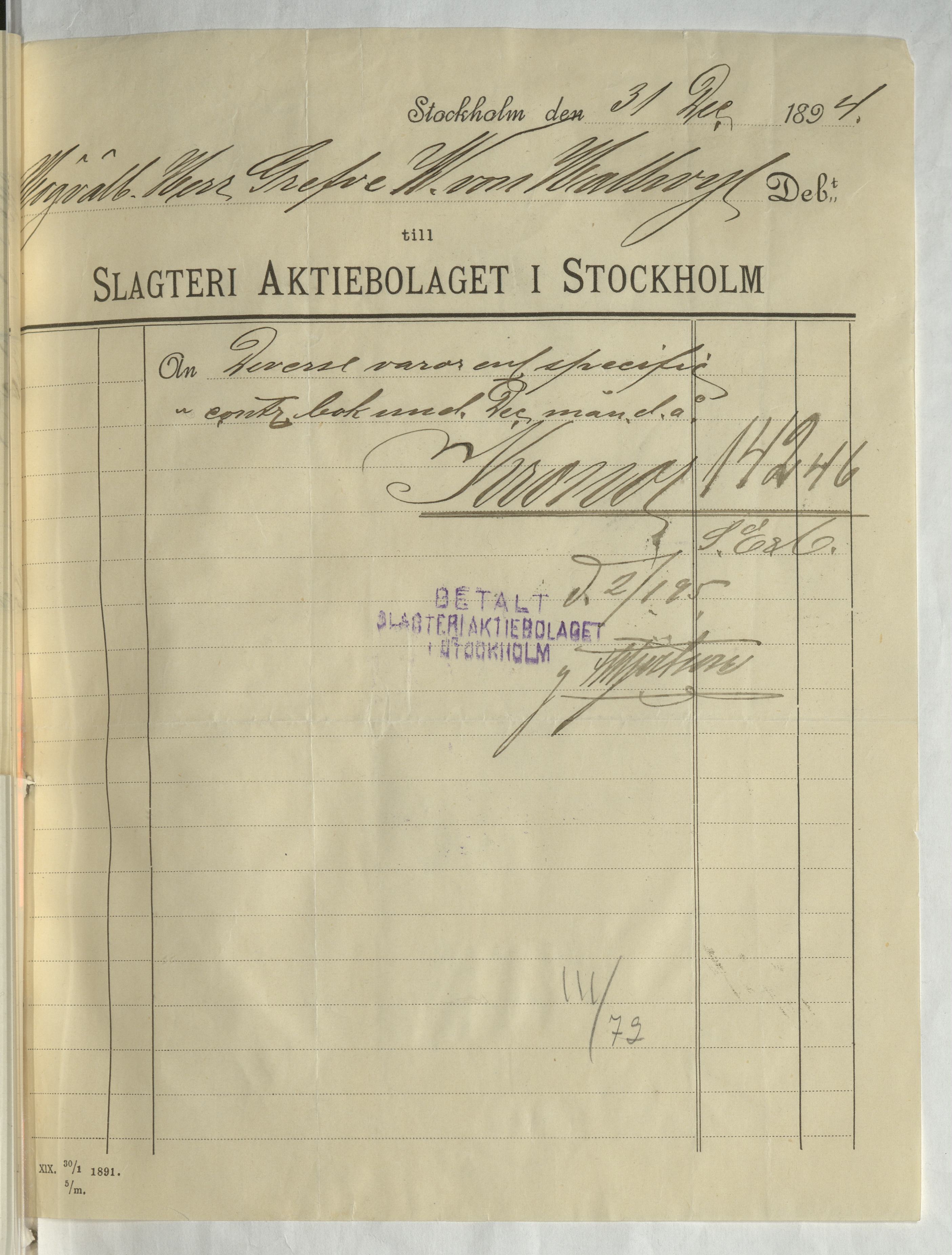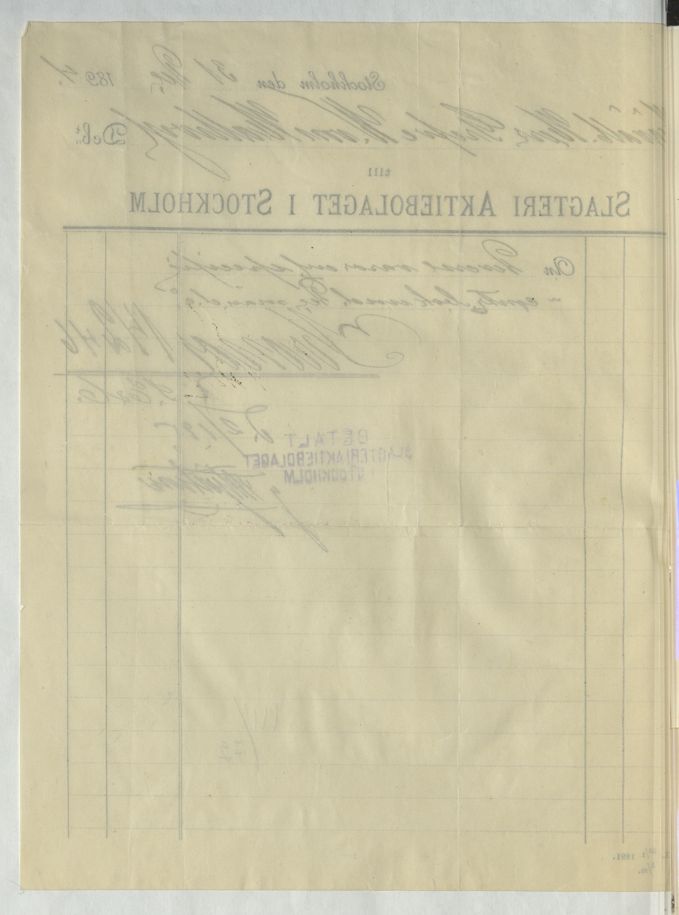 Kvitto från Slagteri Aktiebolaget i Stockholm