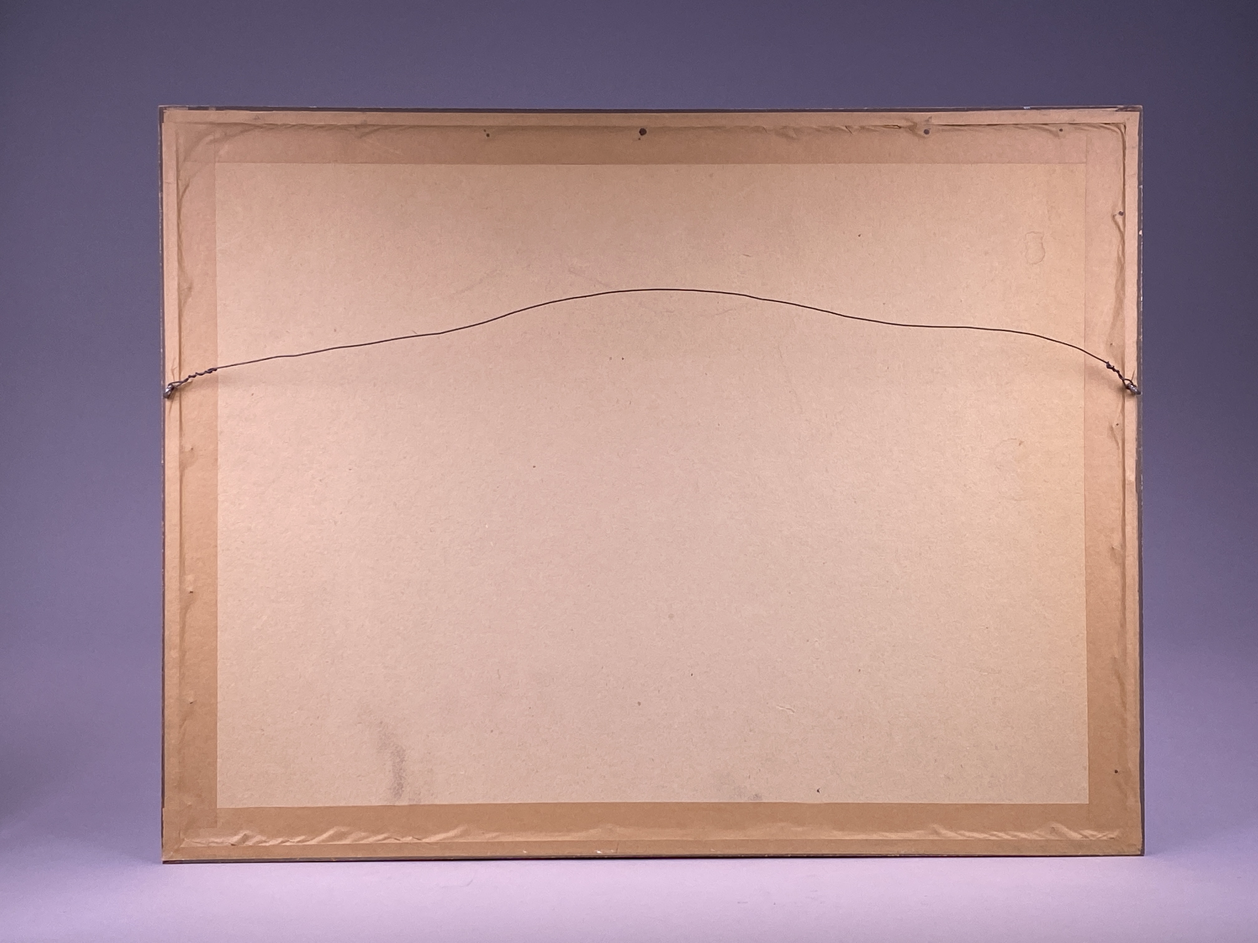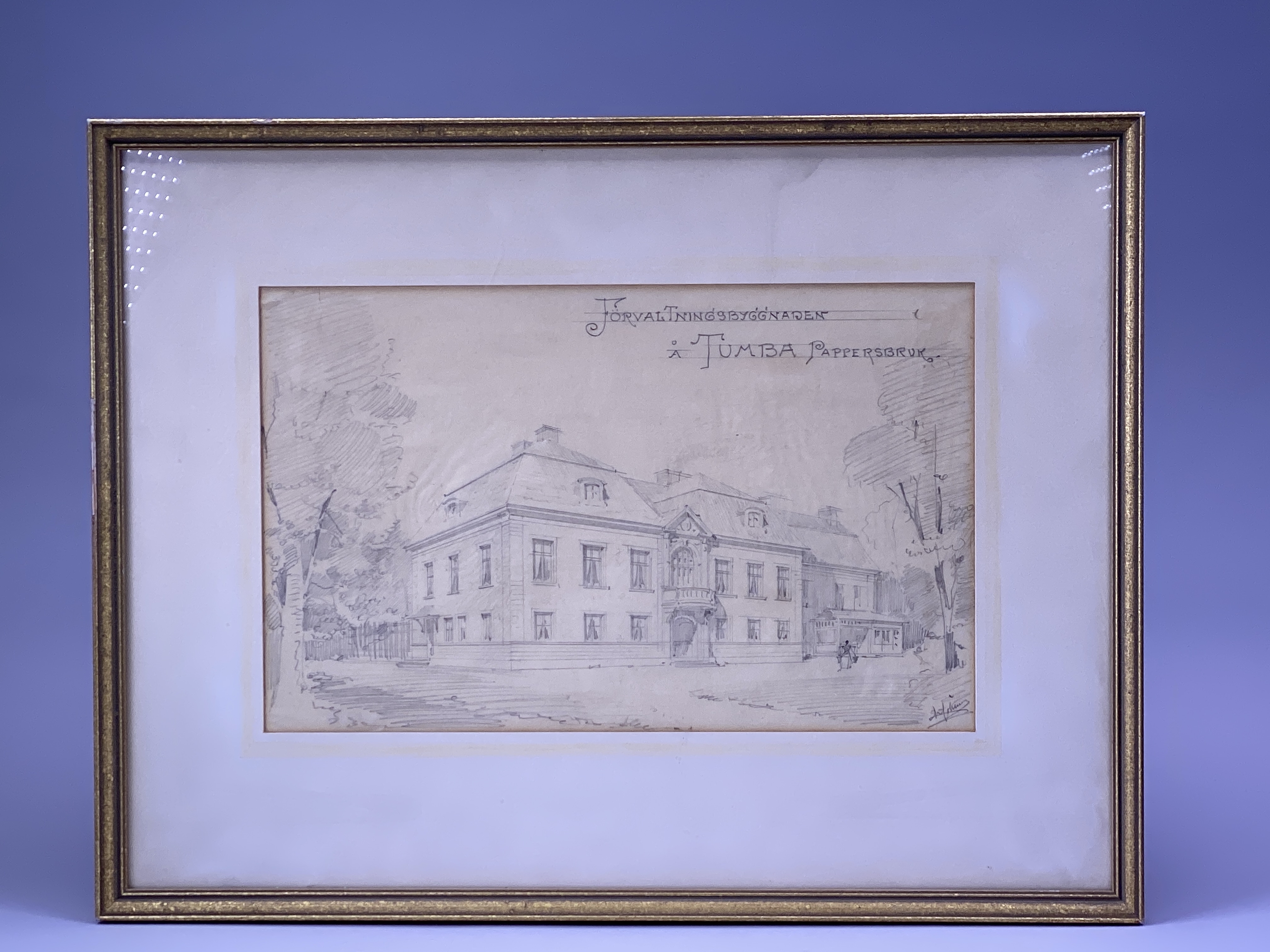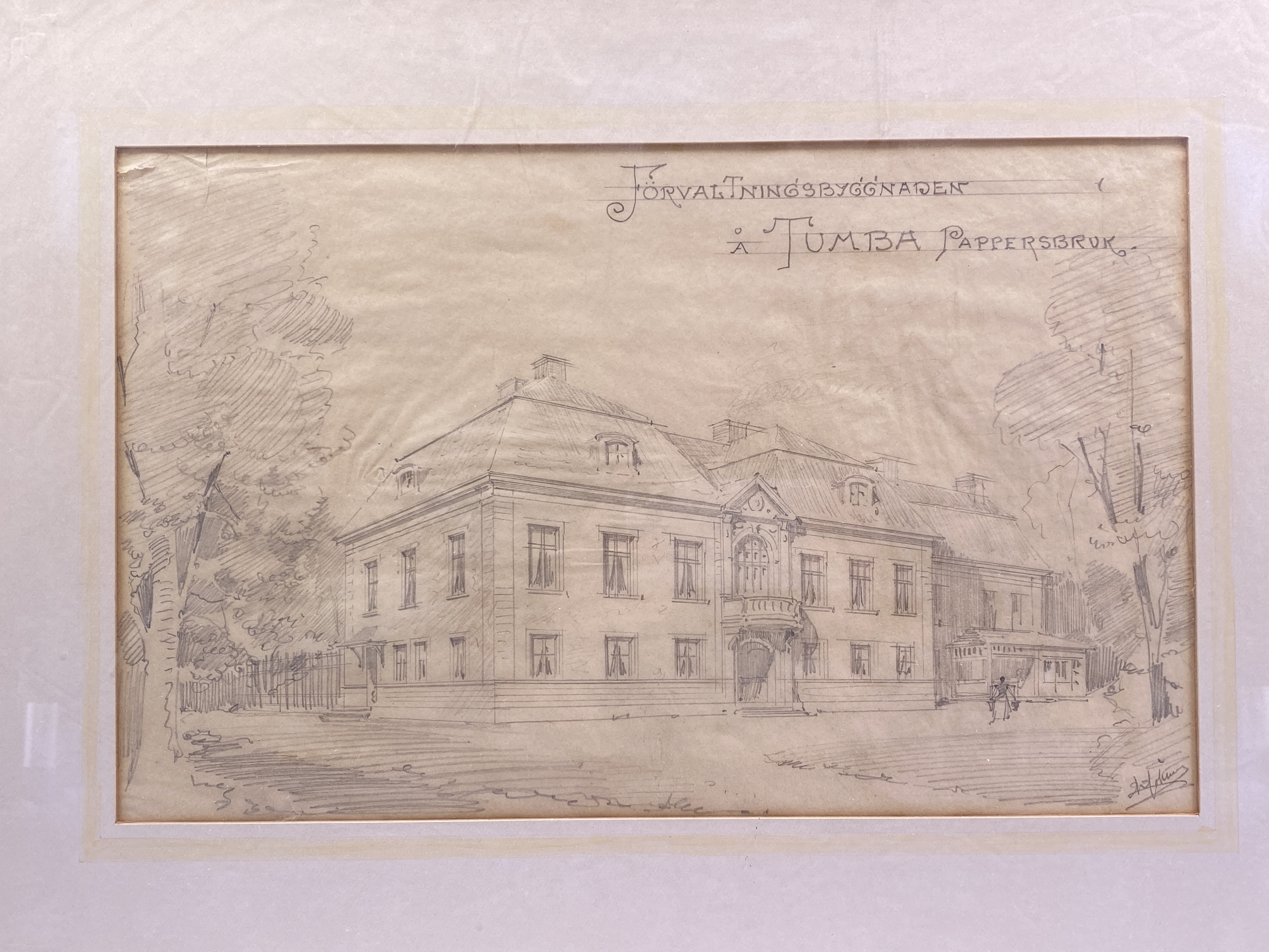Tavla föreställande Förvaltarbostaden vid Tumba bruk. Illustration med blyerts på papper, innanför vit passepartout. Signerad. Ej identifierad. Liggandes rektangulär tavelram med glas. Profilerad träram målad med guldfärg. Baksidan tillverkad i papp med metalltråd för upphängning. Tråden fäst mellan två öglor i metall.