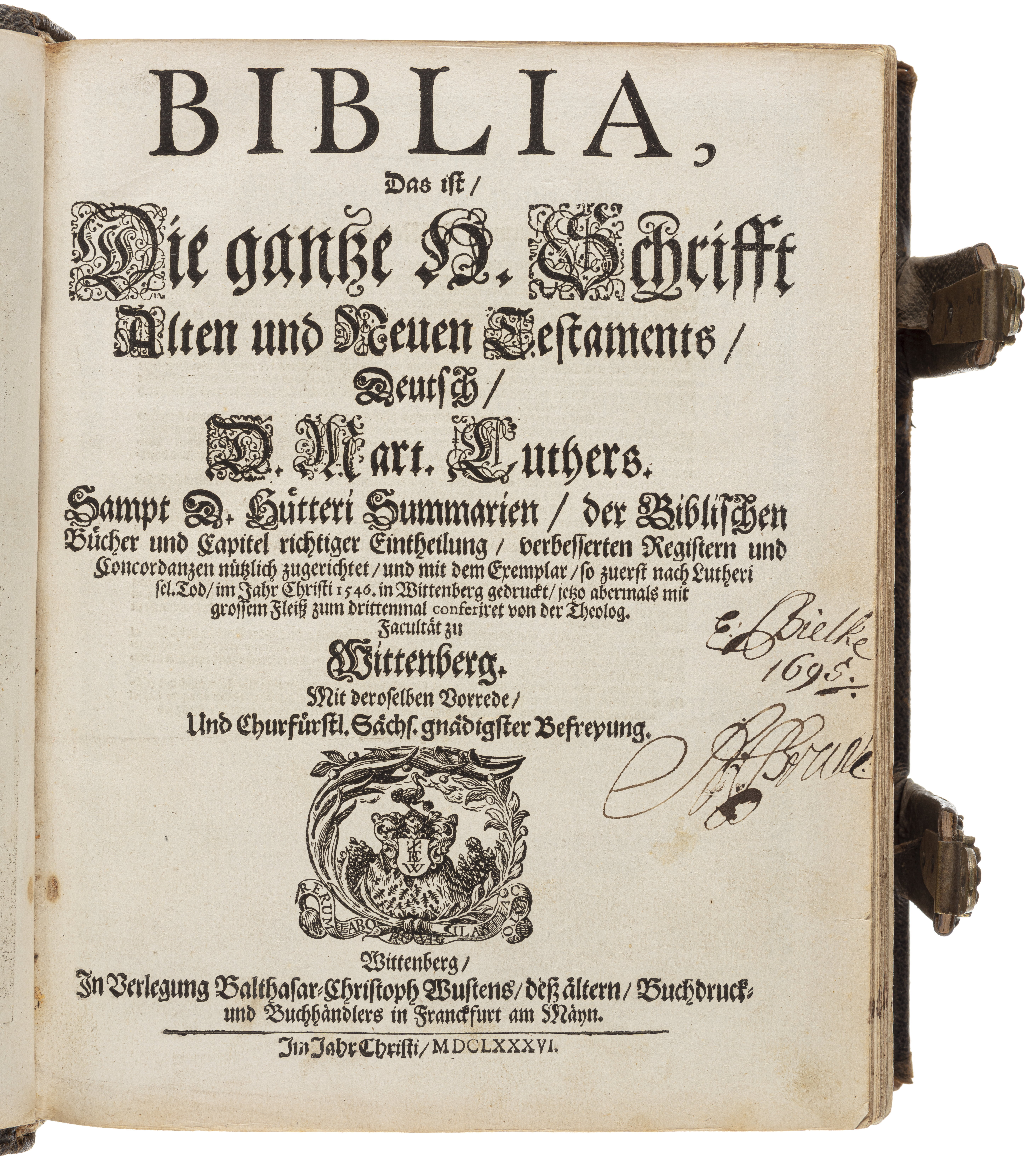 Biblia, das ist, die Gantze Heilige Schrifft Alten und Neuen Testaments, Deutsch, D. Mart. Luthers. Sampt D. Hütteri Summarien...Wittenberg, in Verlegung Balthasar-Christoph Wustens, desz ältern, Buchdruck- und Buchhändlers in Frankfurt am Mayn...MDCLXXXV