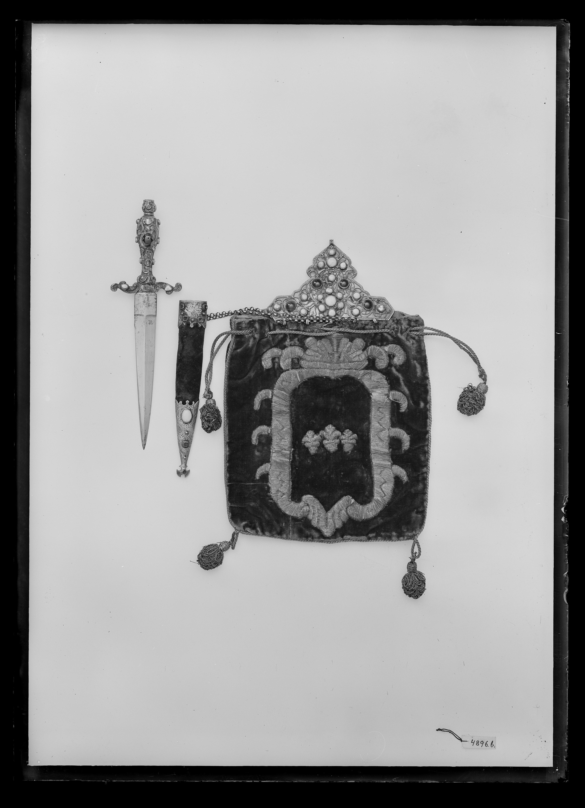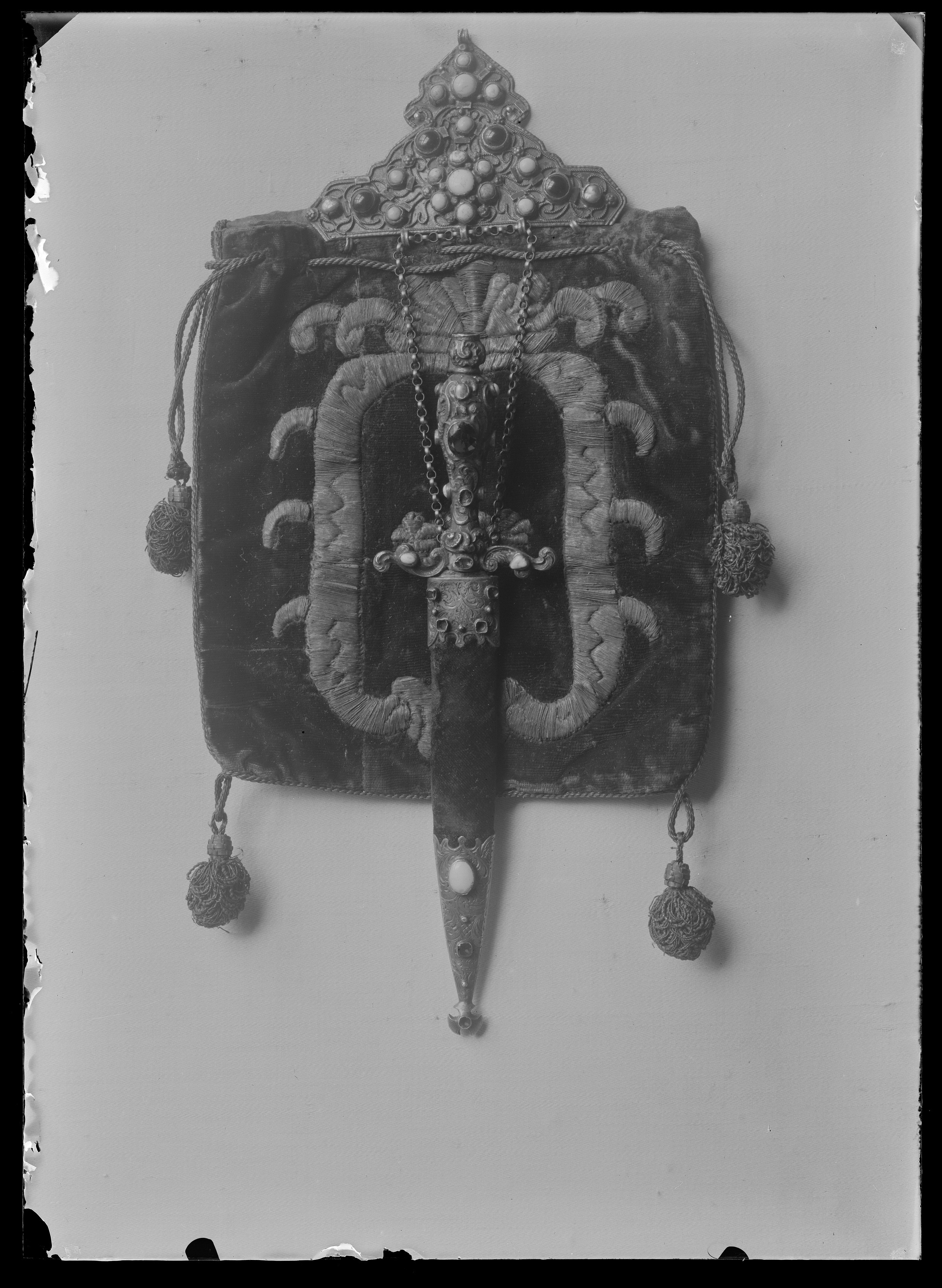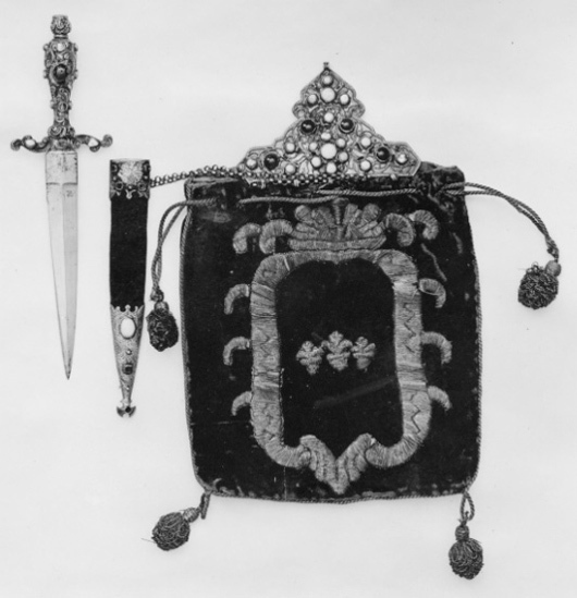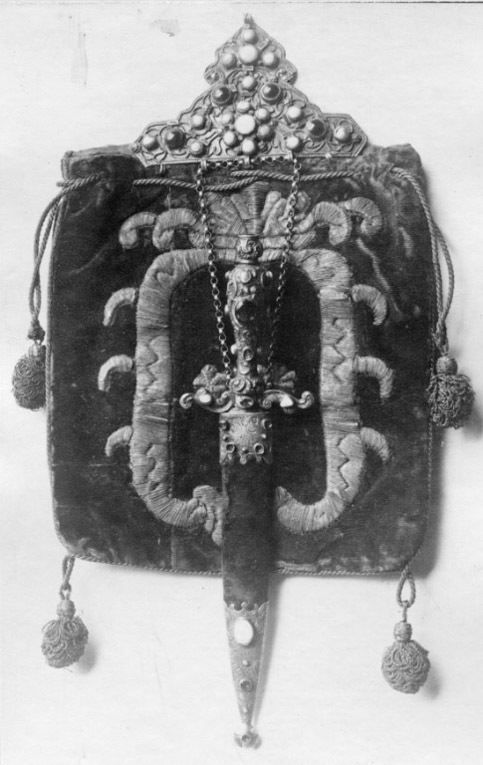 Korsfäste av drivet och ciselerat silver. Stor, hög nitknapp. Kavel utdraget päronformig, besatt med pärlor, turkoser samt två röda stenar. Parerstänger raka med en turkos vid vardera ytteränden. Klinga rak, tvåeggad med mötande skär samt ricasso, l: 14 mm.