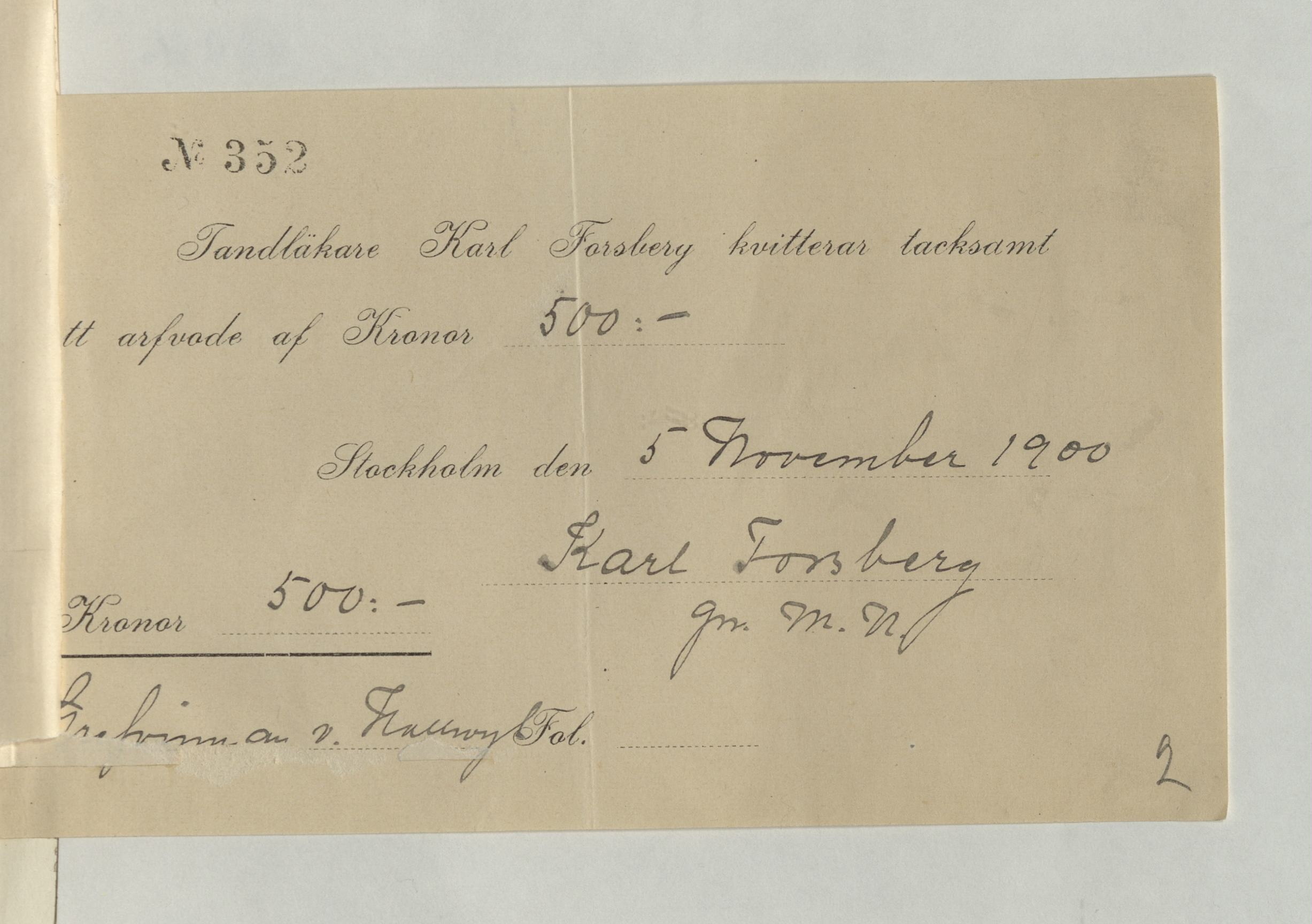 Räkning för tandläkarbesök. Utdrag ur katalogverket: "Karl Forsberg. 1900 — 1922."