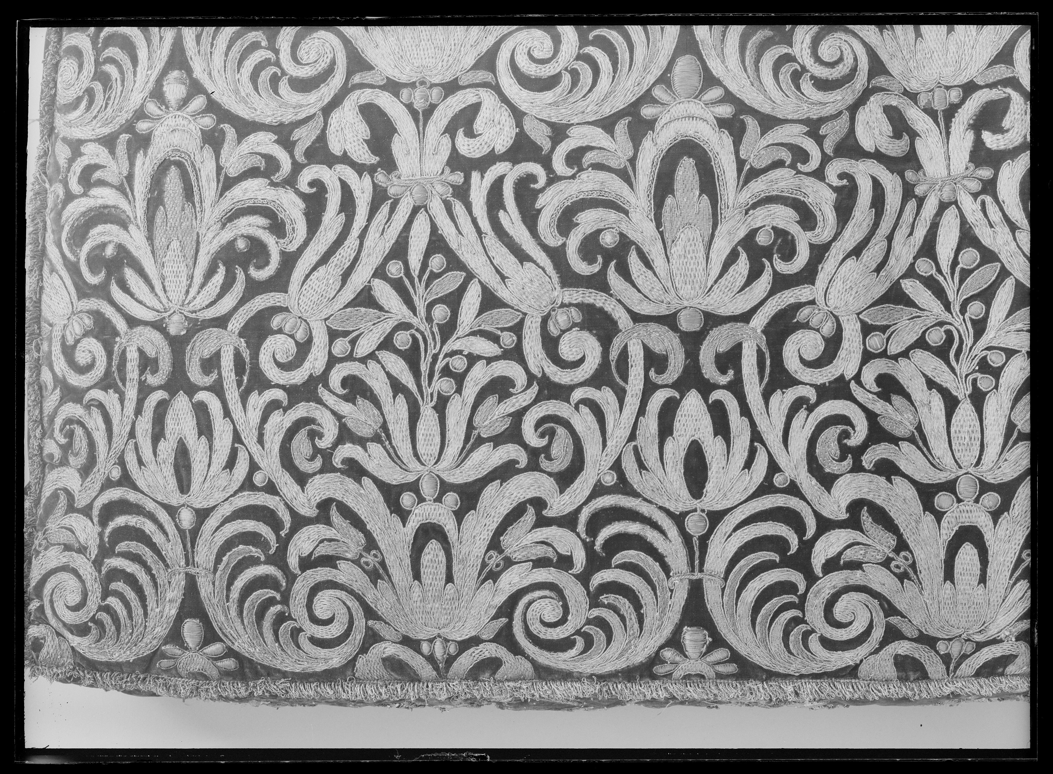 do. do. (Dyna af rödt sammet, enkel, broderad i guld och silfver, perlstickarearbete, samt kantad med silfver och guldfransar; fodret af sars (skadadt)