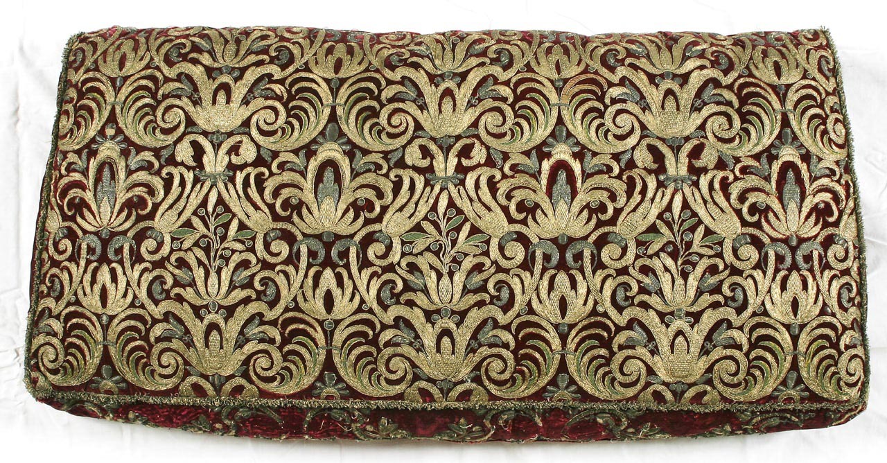 Dyna, rektangulär, med mjuk stoppning. Foder av sars. Överplatta och botten av röd sammet med broderier av silver- och guldtråd och grönt silke i rankor och palmettmönster. Bottnens framsida har broderier i reief, skadade och delvis borta. Desssidostycken avsmalnar till spetsig vinkel bakåt. Kavelfrans av guldtråd runt övre kanten.
