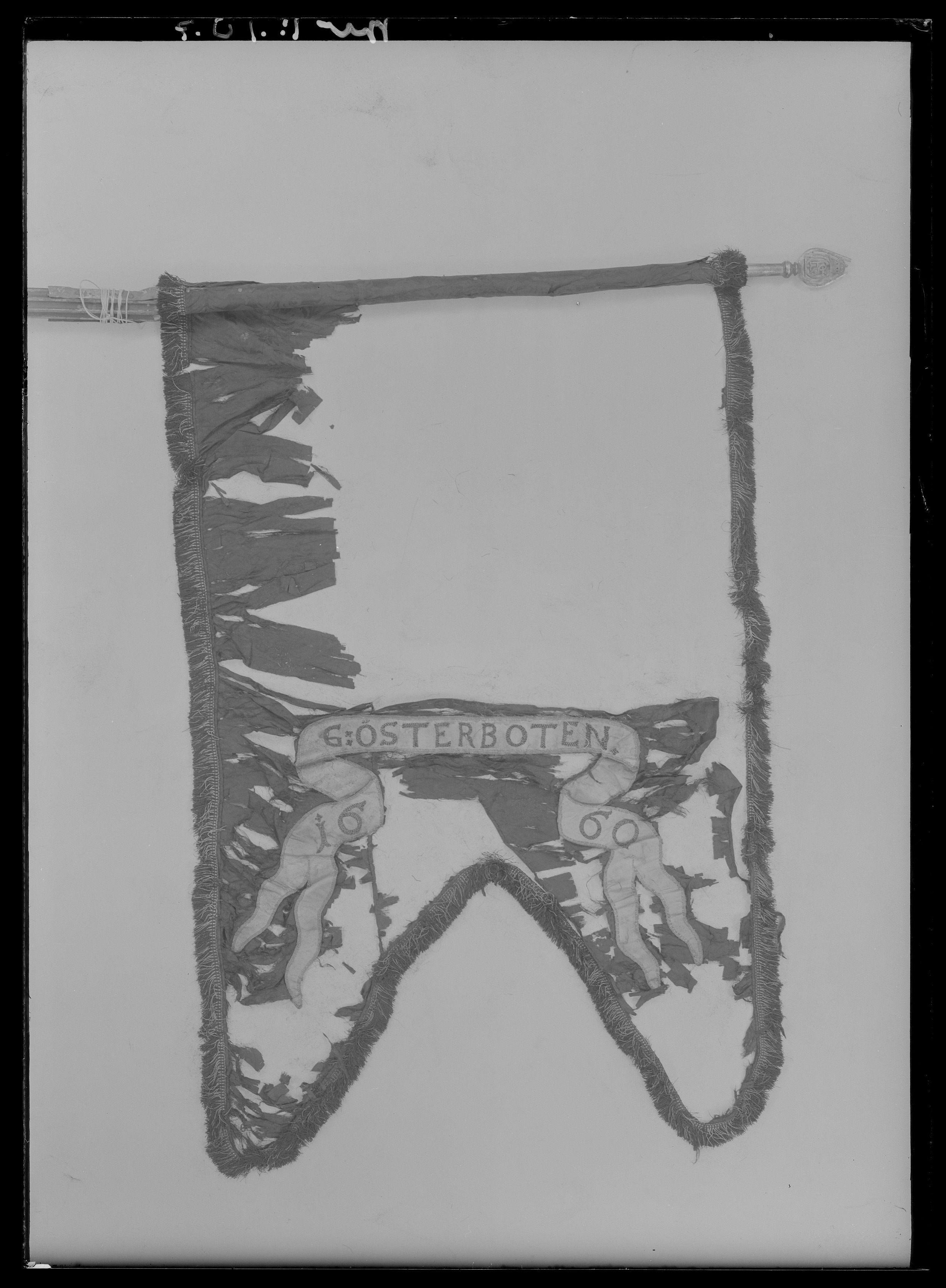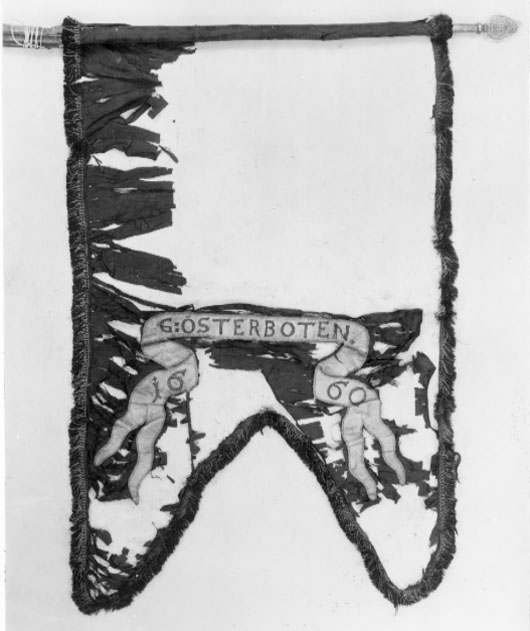 Broderier av Ulrick eller Beranger. Små rester av svart sidendamast. Rester av silkesfrans i svart med guldinslag. Bredd: 35 mm. Språkband av vit sidenatlas med broderad text i svart silke med guldinslag: "G. ÖSTERBOTEN / 1660". Duken lindad ett varv kring stången fäst med spikar med kullriga huvuden. Stång: av svartmålad furu, kannelerad med spår av förgyllning på ribborna. Slätt handgrepp. Holk och spets av förgylld mässing: monogram av C R S under sluten krona. Förgyllda förstärkningsskenor på stångens övre del. Handgreppet: 225 mm Spetsen: 175 mm Total längd: 3660 mm