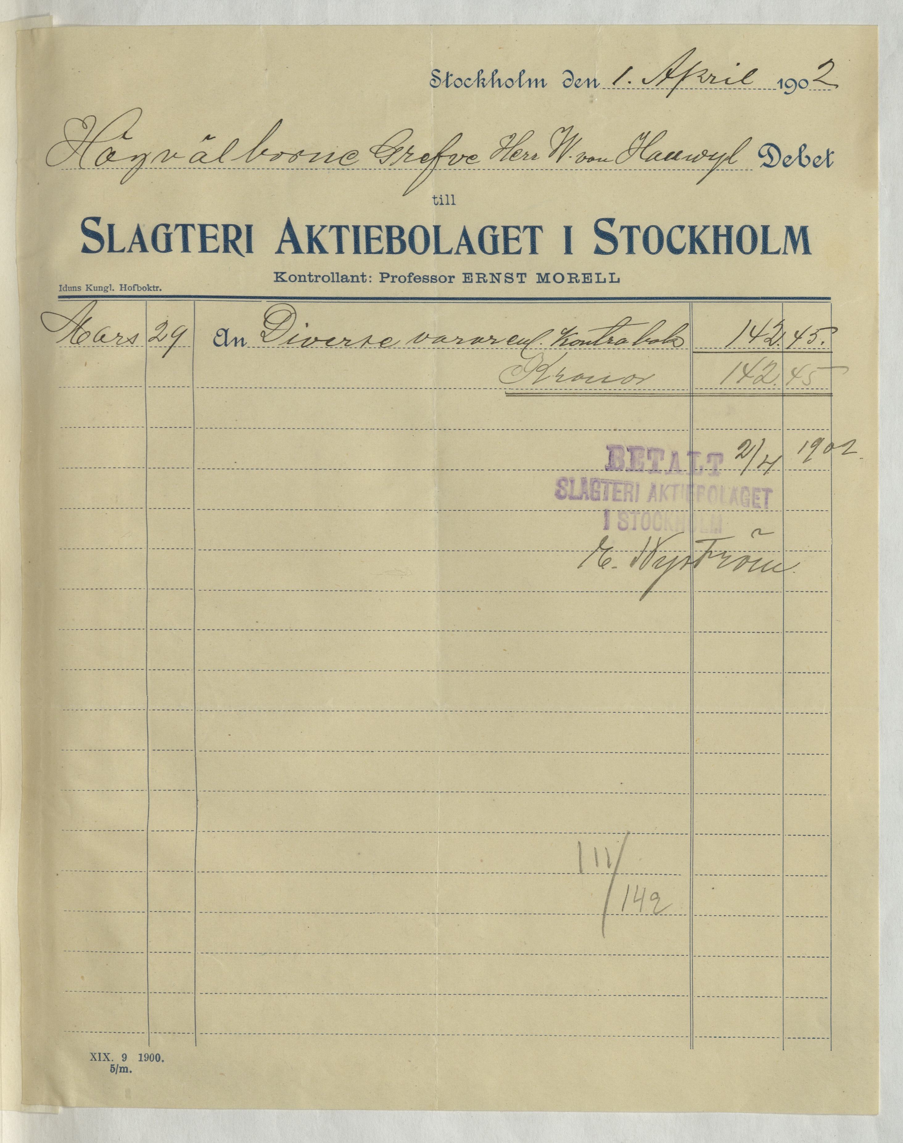 Kvitto från Slagteri Aktiebolaget i Stockholm