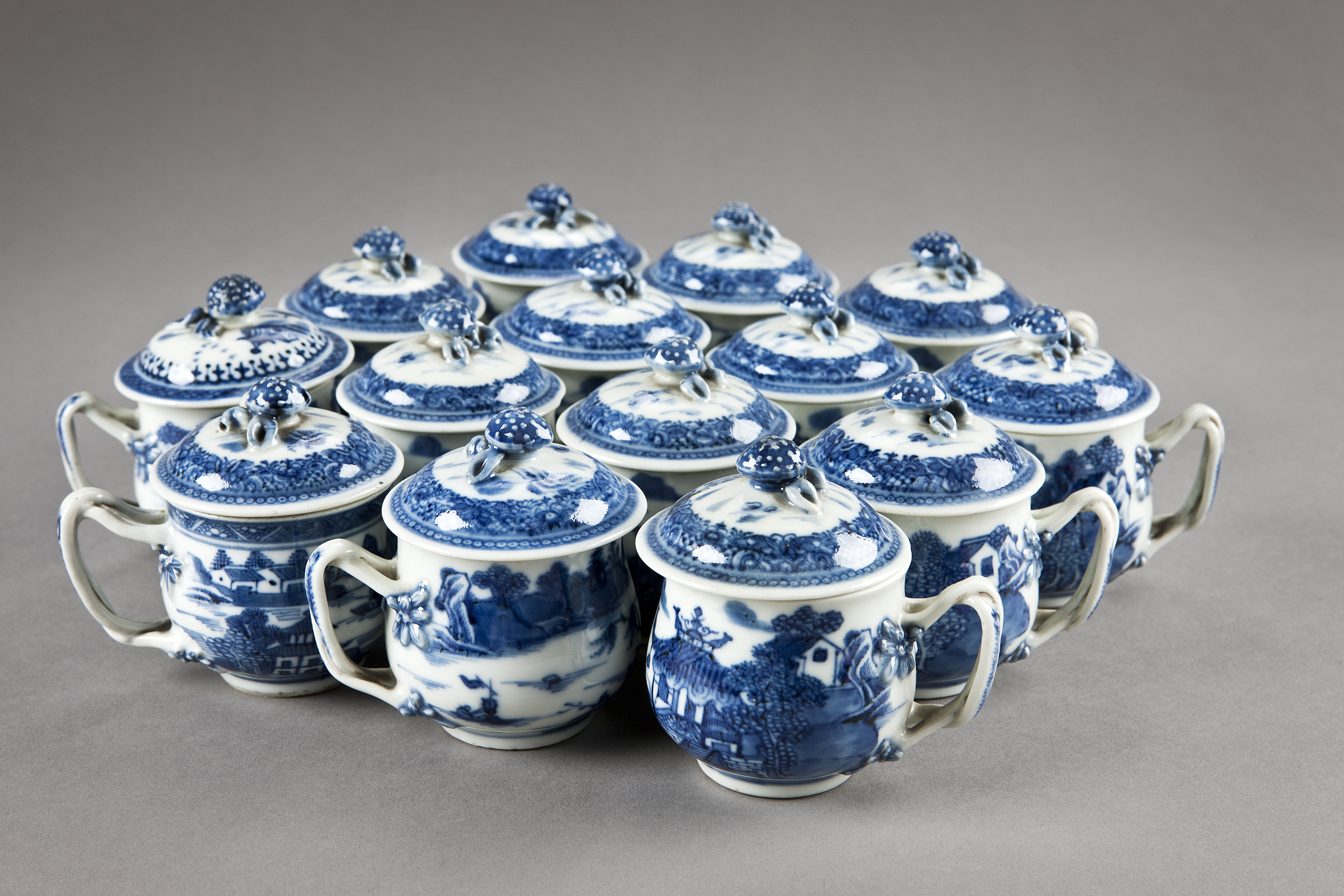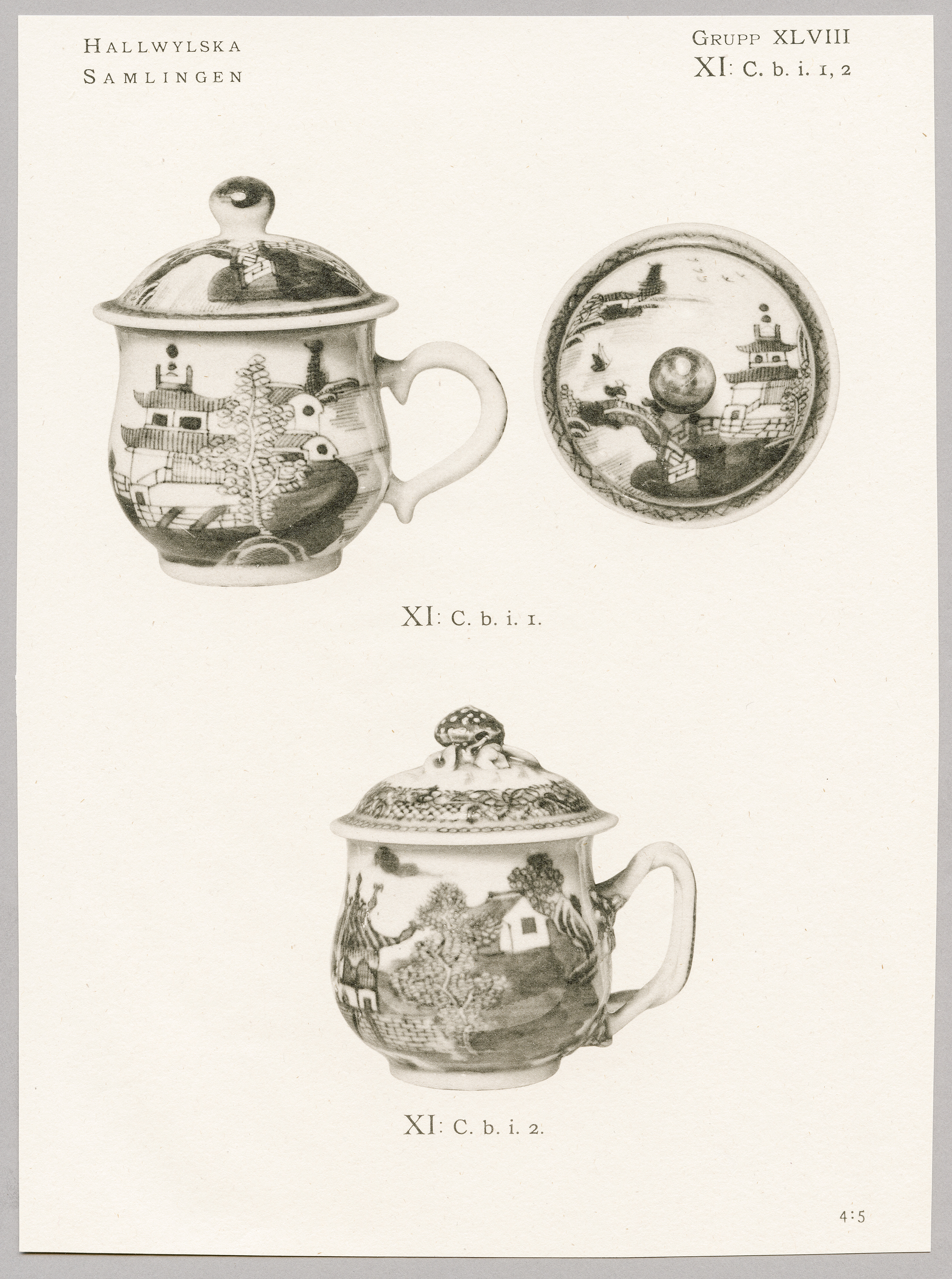 KRÄMKOPP med lock, 14 st. Bukiga med utsvängd brädd, hänkel av två sammanflätade stänger. Lock med flugsvampsliknande knopp. Dekor i blått med på koppens utsida ett flodlandskap med byggnader och människor. På locket en blomsterbård kring brädden, knoppen blå med små vita upphöjningar. Inköpta av Wilhelmina von Hallwyl 1899 hos konsthandlare H Bukowski för 94 kr. Stora uppsättningar av koppar med lock förblir sällan intakta. I det här fallet köptes trettio identiska koppar på Bukowskis 1893 och ytterligare fjorton 1899. Små rundade pytsar av det här slaget fyllde olika funktioner. I England användes de till att servera individuella portioner med vaniljkräm eller grädde till desserten, medan de vid Mariebergsfabriken i Sverige kallades »gelékoppar«. I Frankrike kallades de »pot à jus« och användes till att servera varma juicer eller soppor, såsom buljong eller consommé. Pytsar med handtag var särskilt lämpliga för det senare. Sådana här koppar med lock tillverkades vid fabriker över hela Europa och de kinesiska exportexemplaren var kopior av dessa. Qing dynasty: set of 14 cups c.1760-70: set of 30 cups c.1790-1800 Such large sets of cups with lids do not often survive. In this case, thirty identical cups were bought at Bukowskis in 1893, and a further fourteen in 1899. Small, rounded pots of this type were assigned various functions. In England they contained individual portions of custard or cream during the dessert course, whereas at the Marieberg factory in Sweden they were know as “jelly cups”. In France they were called “pot à jus” and were used to serve hot juices or soups such as bouillon or consommé. Pots with handles would be especially suitable for the latter purpose. Such lidded cups were made at factories all over Europe, and Chinese export examples were copied from them.