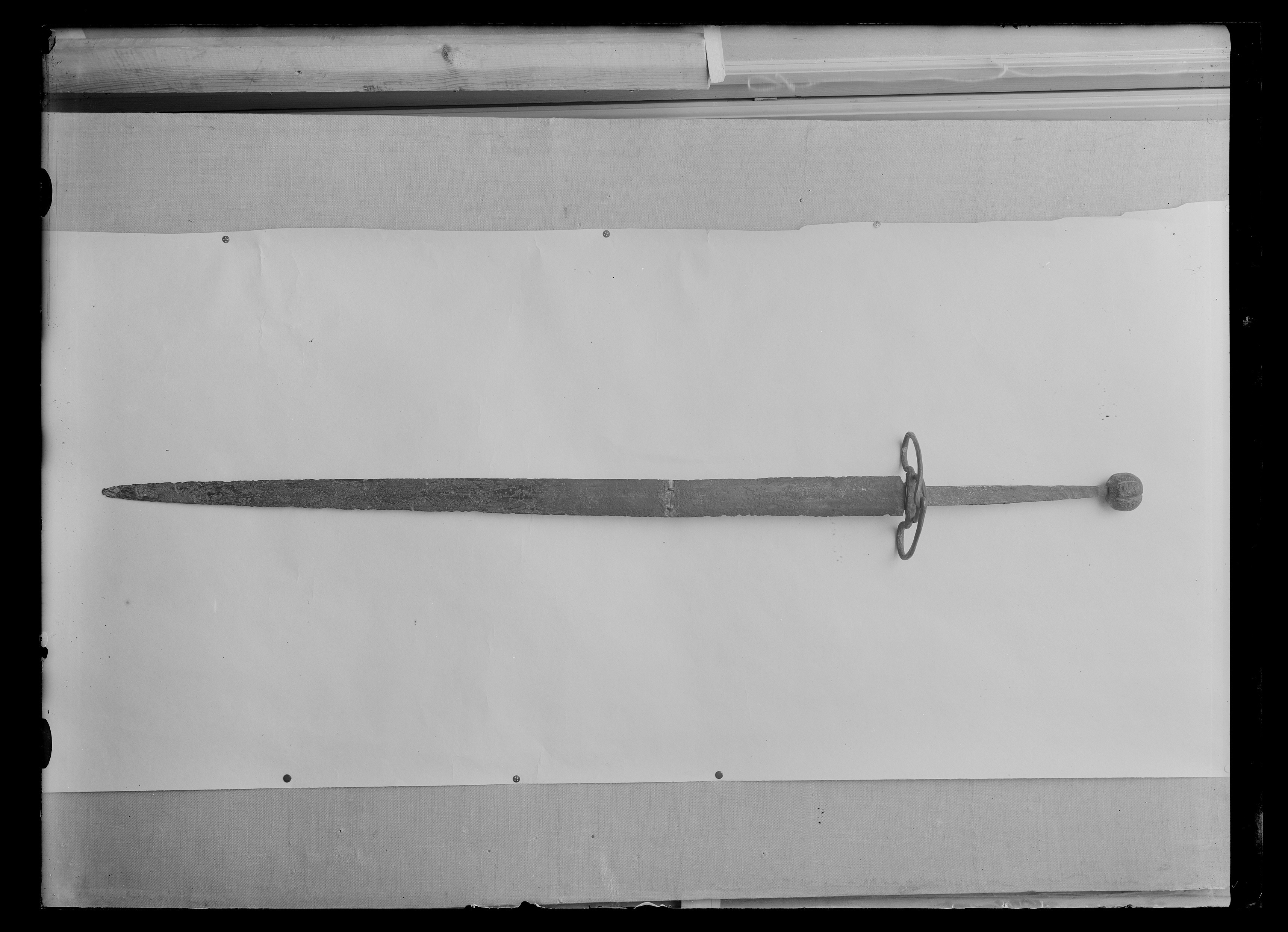 Fäste av stål (kavel saknas). Knapp klotformig med åtta vertikala räfflor, fyra breda, fyra smala samt punktfördjupningar. På knappen rester av tennbeläggning. Pareranordningen består av en tämligen smal ten, smidd till ett kringelliknande handskydd med den bågformiga delen utdragen åt klingans utsida Klinga rak, tvåeggad och med svagt markerade, längsgående hålkälar. Klingan tvärt sönderbruten 229 mm från basen, delarna där ihopfogade medelst två sinkor och mässingslödning. På utsidan 7 st sinkor. På insidans starka del två inslagna stämplar, närmast basen ett ulvmärke (Passau, här ej tillverkningsort, endast som föregiven kvalitetsbeteckning). Tånge platt, med utdraget, rektangulärt tvärsnitt.