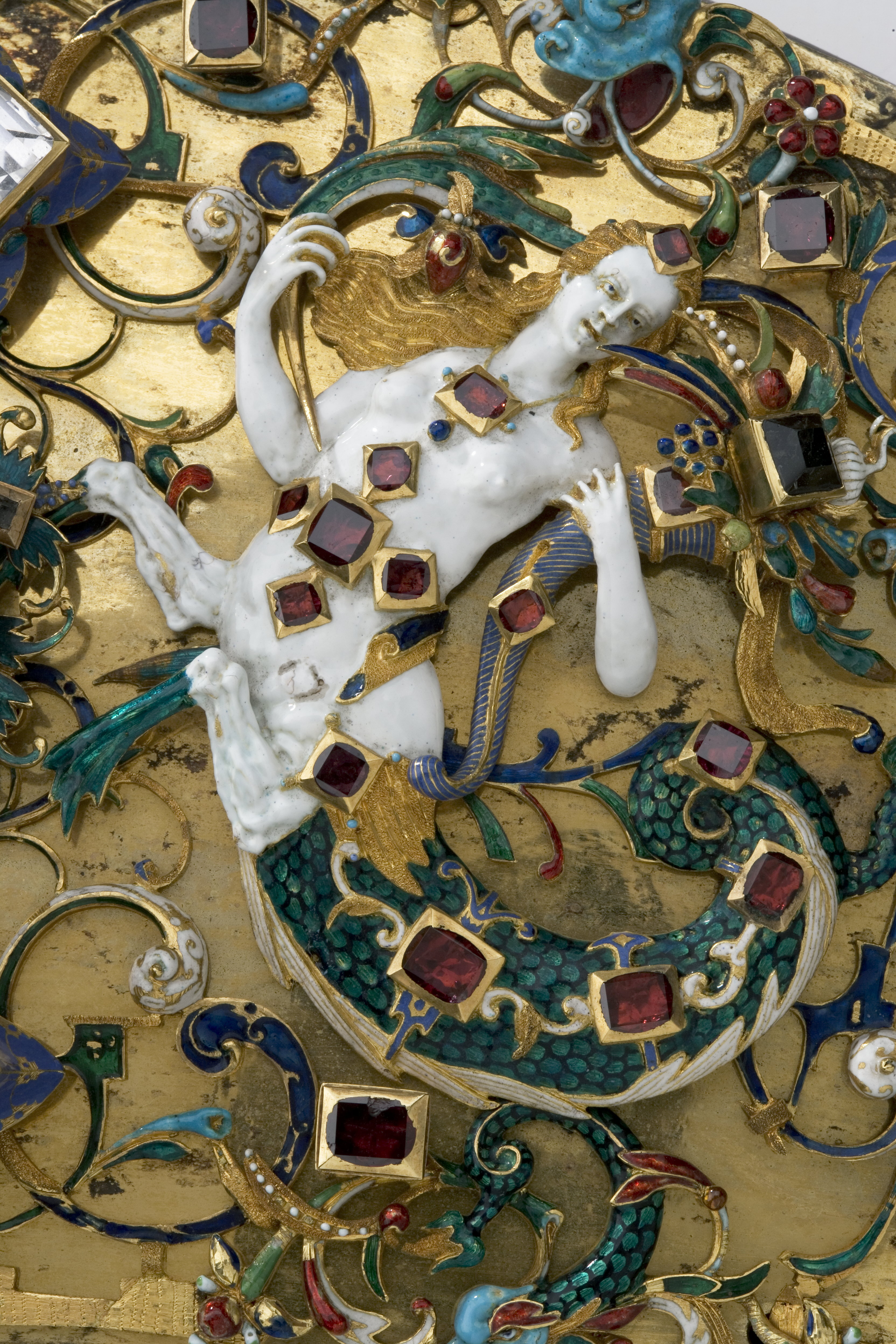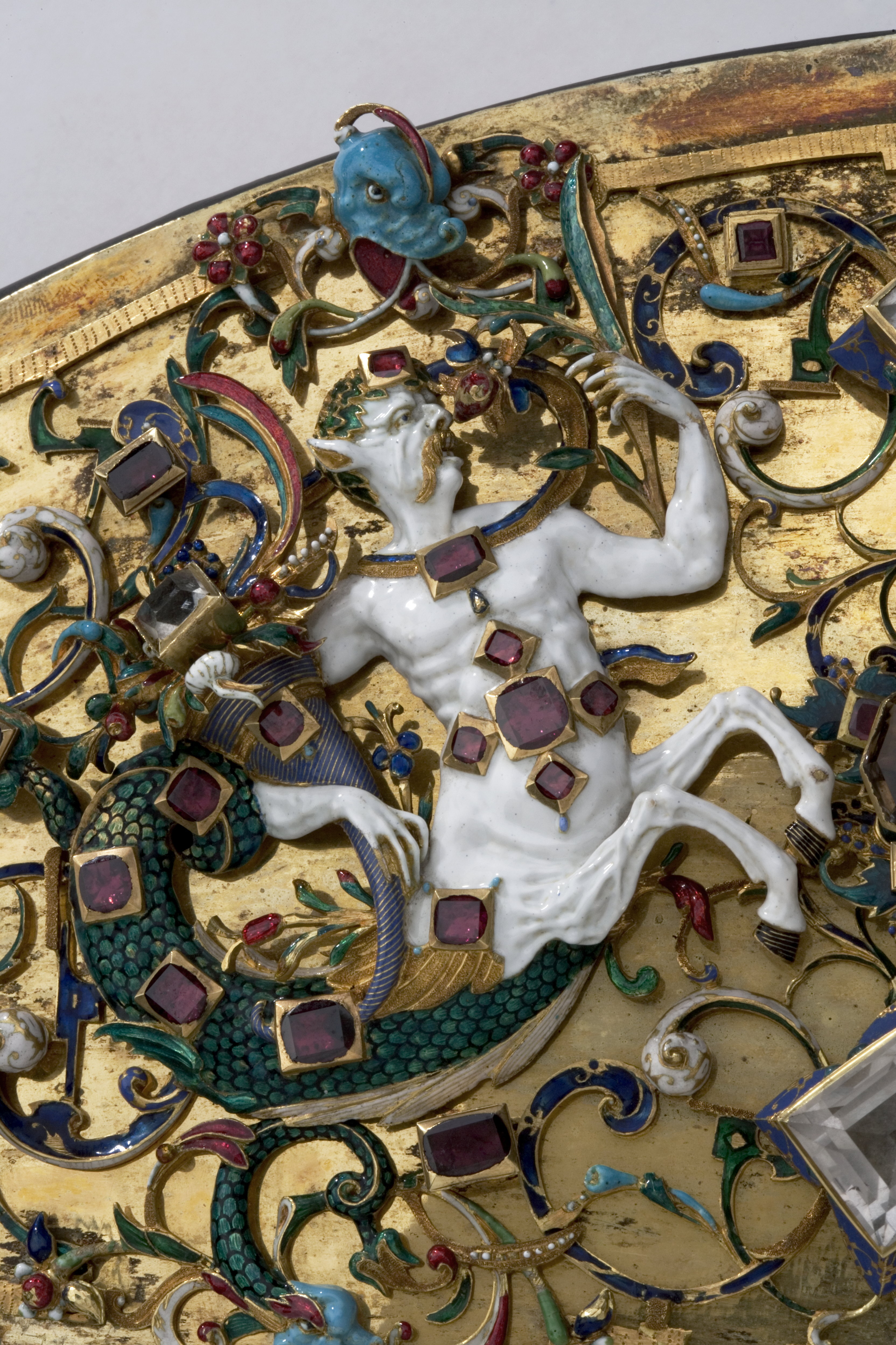 Månformig, på framsidan förgylld silverplåt med påskruvade symmetriska, yttäckande, genombrutna ornament av guld och röd, grön, mörkblå, vit och brun emalj. I mitten vase över två korslagda, grönemaljerade palmkvistar, omgivna av två delvis brunemaljerade lejon, dessutom två krönta trofégrupper, en manlig och en kvinnlig triton med ymnighetshorn, växtdekor med inflätade delfiner och groteska huvuden.