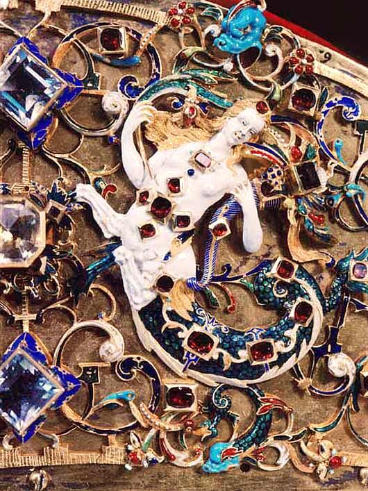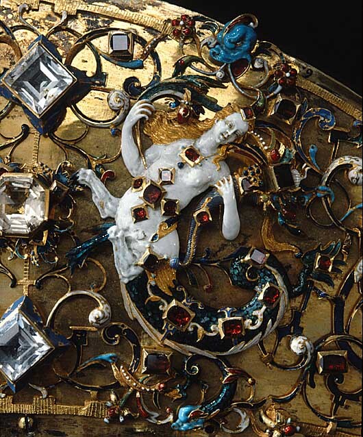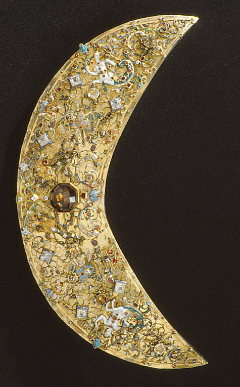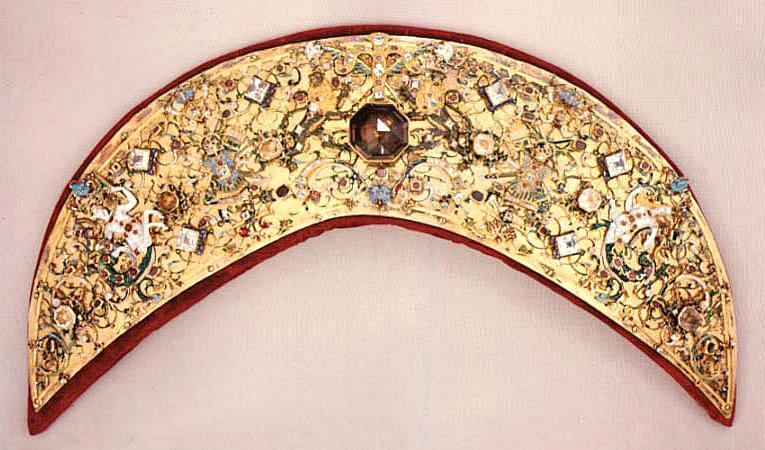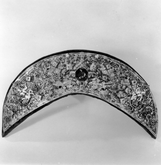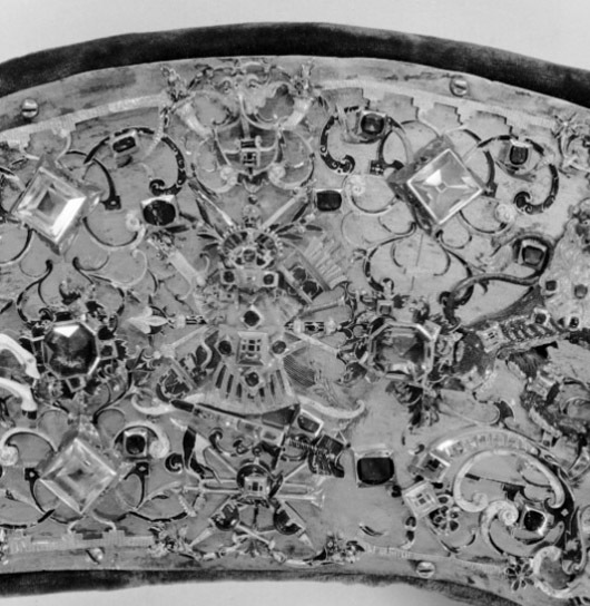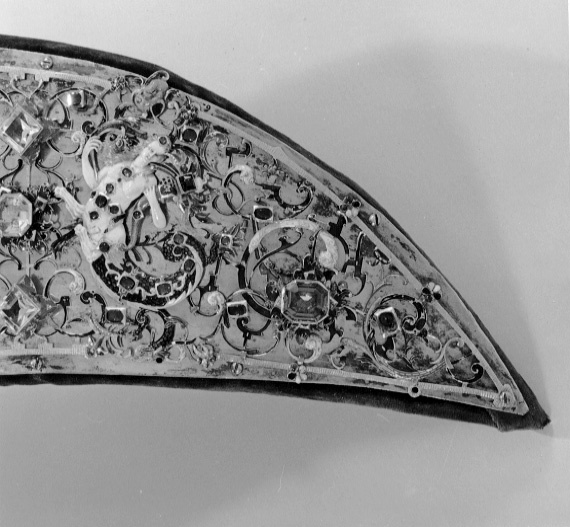 Sadelbeslag, bakbomsplåt, tillverkad av guldsmeden Ruprecht Miller, Stockholm ca 1618. Beställda av Karl IX, men inlämnade till skattkammaren först 1631 av Millers änka.