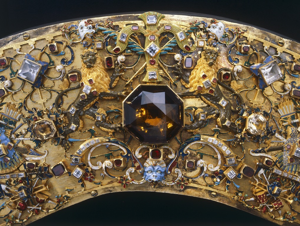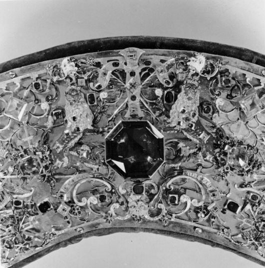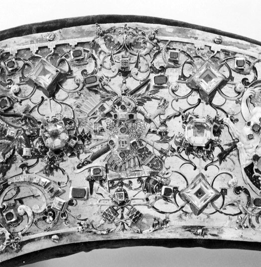 1 Baksadelbomsplåt af förgyldt silfwer med der på pålagdt Guld samt med infattade 1 större skuren röktopas, 6 stora topaser, 93), 6 större hwita stenar, 63 mindre dito dito och 102 mindre röda dito samt widare prydd med 2ne emaljerade hwita tritoner, 2ne gröngrå lejon, en af hwardera sorten på hwardera sidan och med en Wase midtpå. Denna plåt har hört till Konungens Kröningssadel . Aldeles Complette