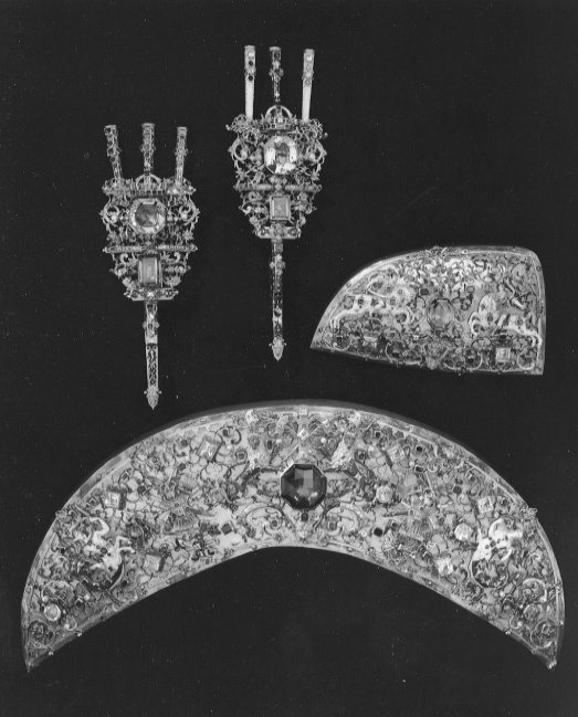Halfva Framdelen af enSadelPuta, rikt besatt med Taffel stenar, Granater, Rubiner och en stor Topas samt för öfrigt emailleradt Löfverk af Guld; sjelfva plåten förgylld med 2ne emaillerade Hästar med Ryttare. Den andra halfva Sadelputan skall finnas uti Kongl. RänteKammaren. År 1803 befanns in alles 1 stor Topas och 44 större och m indre diverse Stenar.