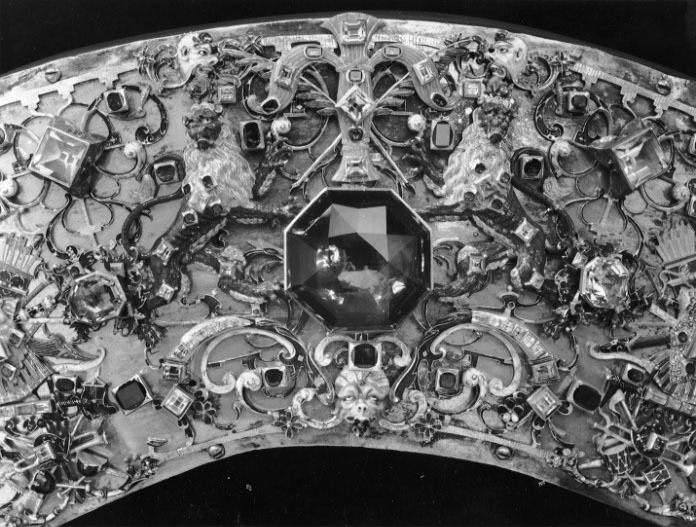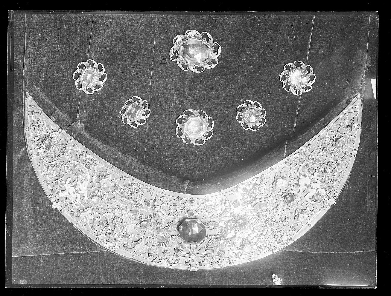 Alltsammans besatt med halvädelstenar, de större har egna från baksidan fastskruvade fattningar. I mitten en stor, mörkbrun, fasettslipad åttkantig rödkvarts, b: ca 44 mm, dessutom 6 mindre, brun-gula fasettslipade åttkantiga stenar (citriner?), b: 15 mm, 63 mindre ofärgade stenar i olika storlek, fyrkantiga, taffelslipade (bergkristaller), samt 103 taffelslipade granater (böhmiska almandiner ?), tillsammans 179 stenar.