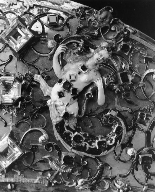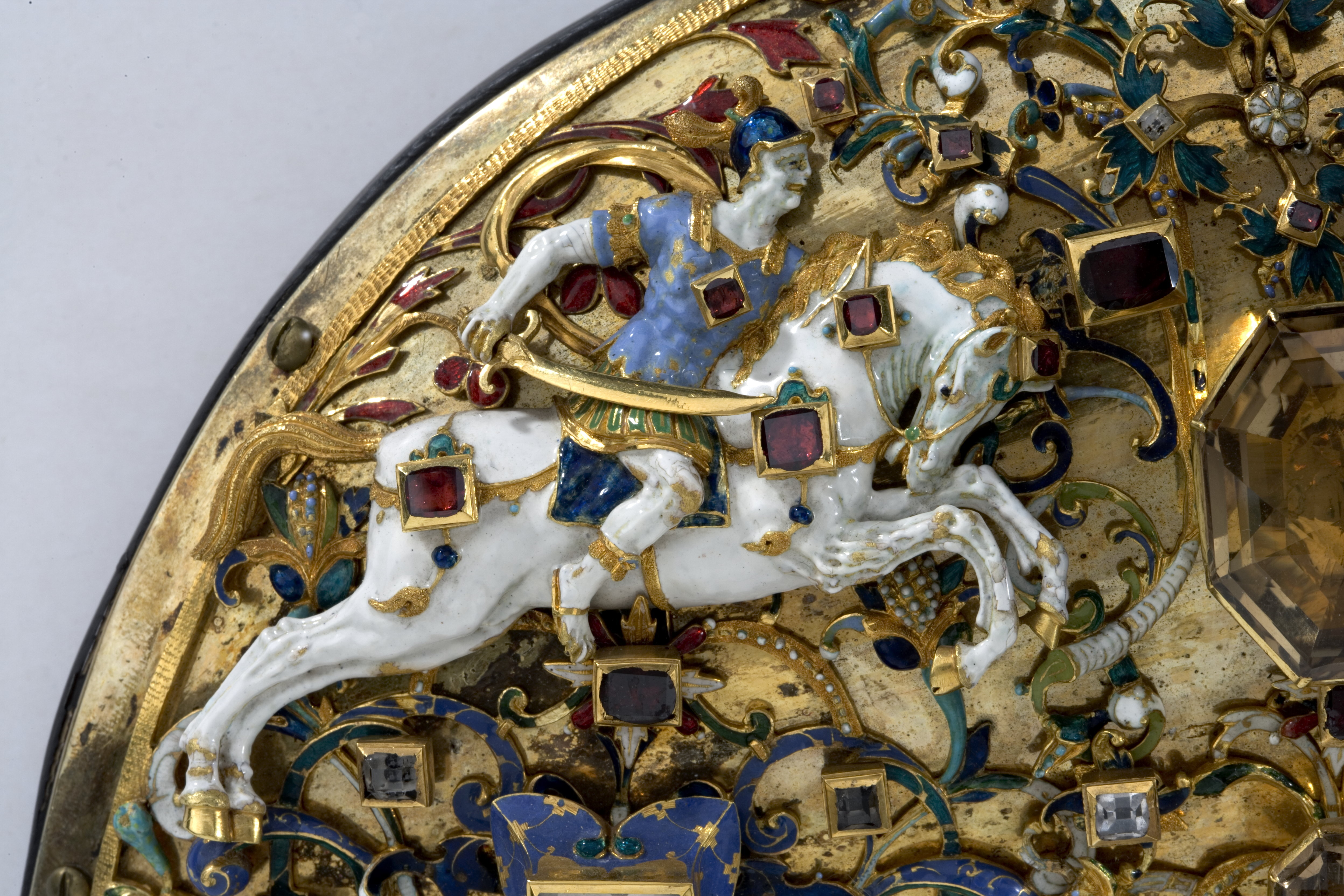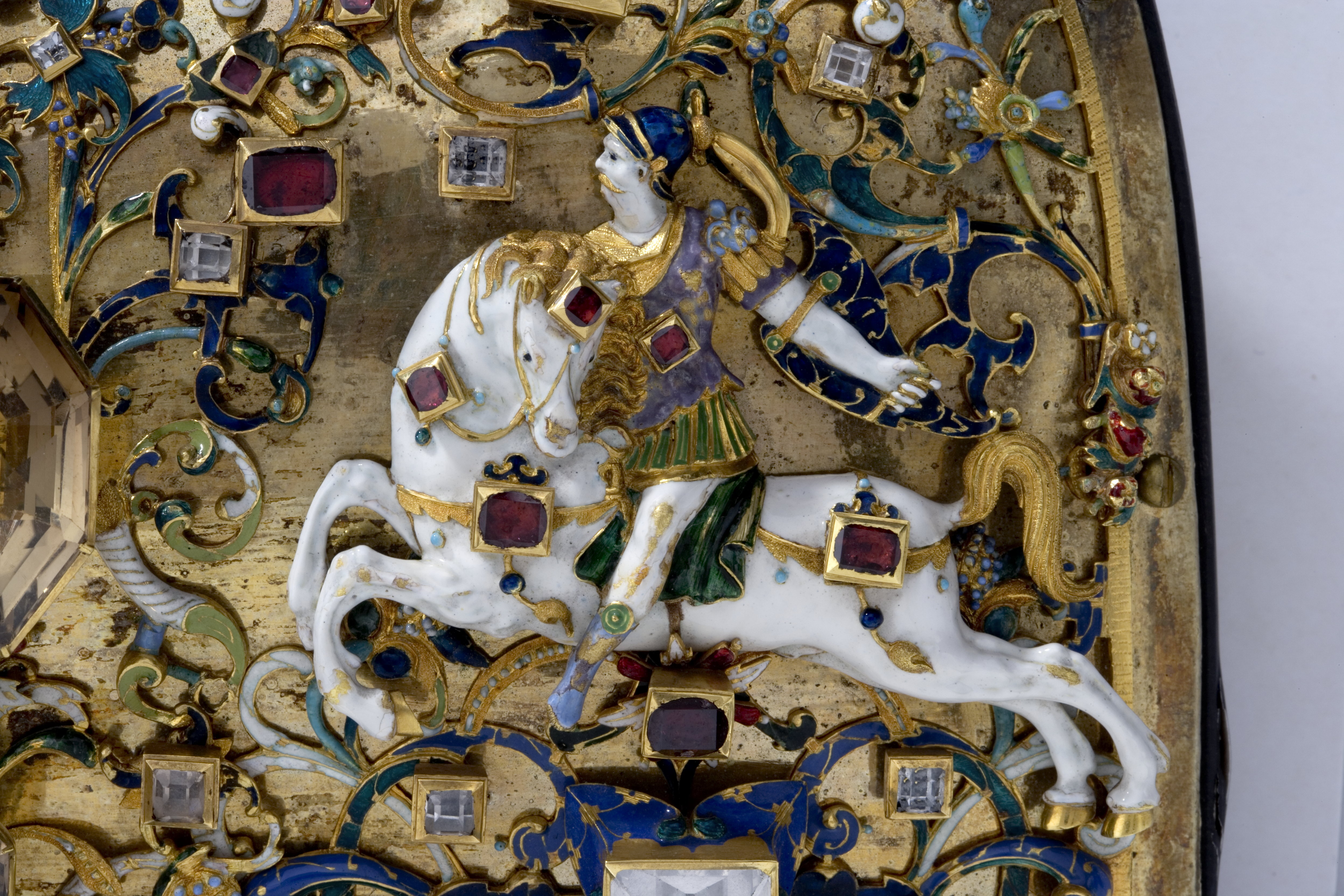 Halwa framdelen af en Sadel puta, rikt beatt med Taffelstenar, granater, Rubiner och en stor Topas, Samt för öfrigt Emailleradt Löfwärk af guld, Sjelfwa Plåten förgyld med 2ne Emaillerade Hästar med Ryttare.