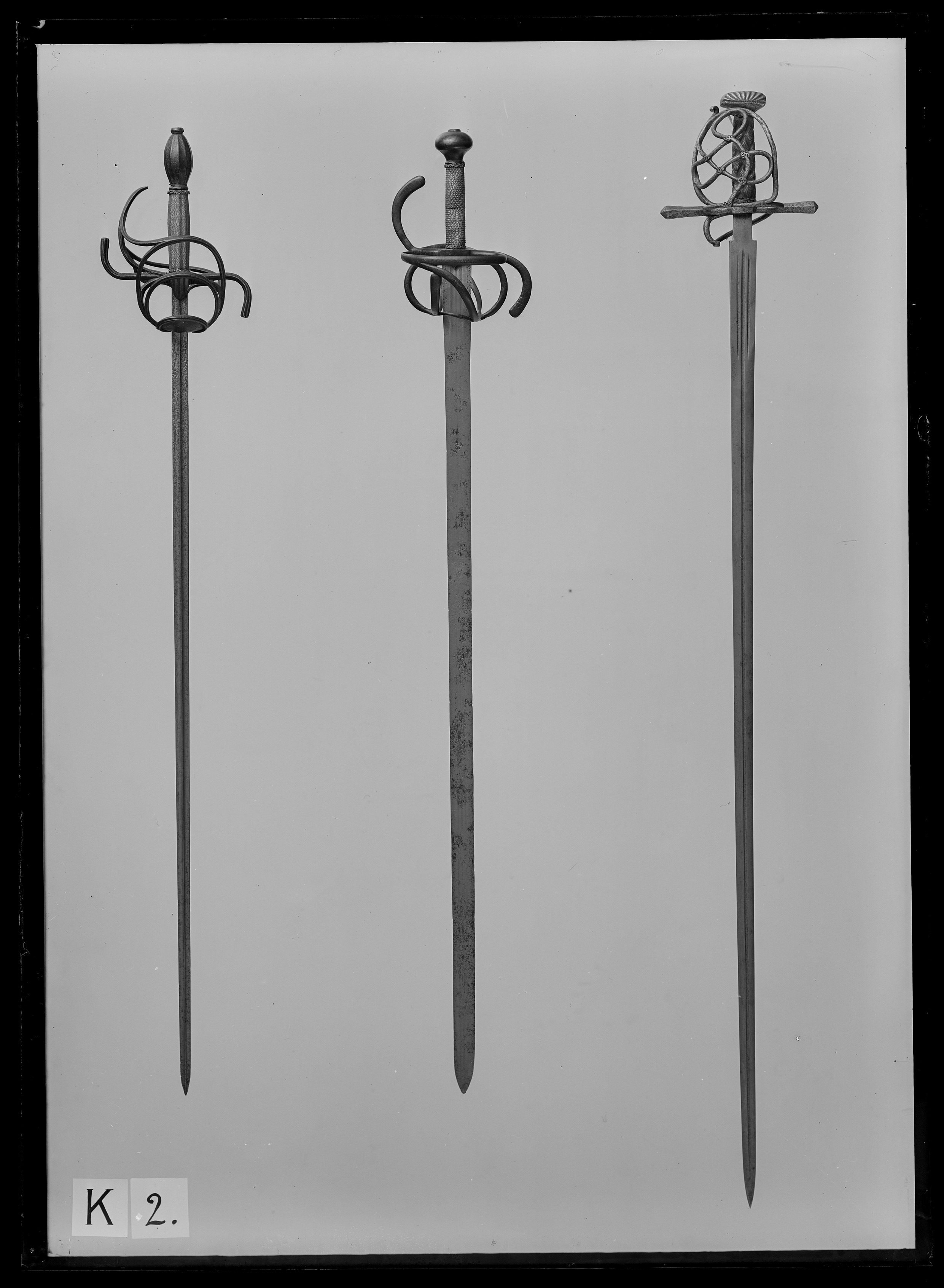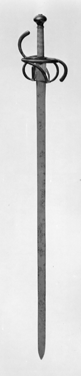Bygelfäste av svärtat, slätt stål. Knapp tryckt päronformig. Pareranordning bestående av långa, till ett S formade parerstänger, dessutom på utsidan en stor, oval kryssbygel, från vars undersida en sidobygel utgår snett bakåt-nedåt till nederdelen av den bakre av de båda stora fingerbyglarna. Från nederdelen av den främre fingerbygeln utgår rakt uppåt en böjd fingerkrok, mellan fingerbyglarna en bågformig spång. På insidan vid främre parerstångens inre del en framåt-bakåtböjd kryssbygel, som bakåt förgrenar sig i tre böjda spänger, anslutande till fingerbyglarnas nederdelar, den främre till den främre, de två bakre till den bakre fingerbygeln. Kavellindning av två parter tvinnad ståltråd, upptill och nedtill en krans av flätad ståltråd (kavellindningen ej ursprunglig). Klinga rak, tvåeggad med ca 57 mm lång ricasso. Utmed klingans hela längd tre längsgående hålkälar längs ricassons sidor en punsad bård av en enkel ranka och punkter. På båda sidor av starka delen inpunsat: I H S, häröver ett kort, längsgående bandornament.
