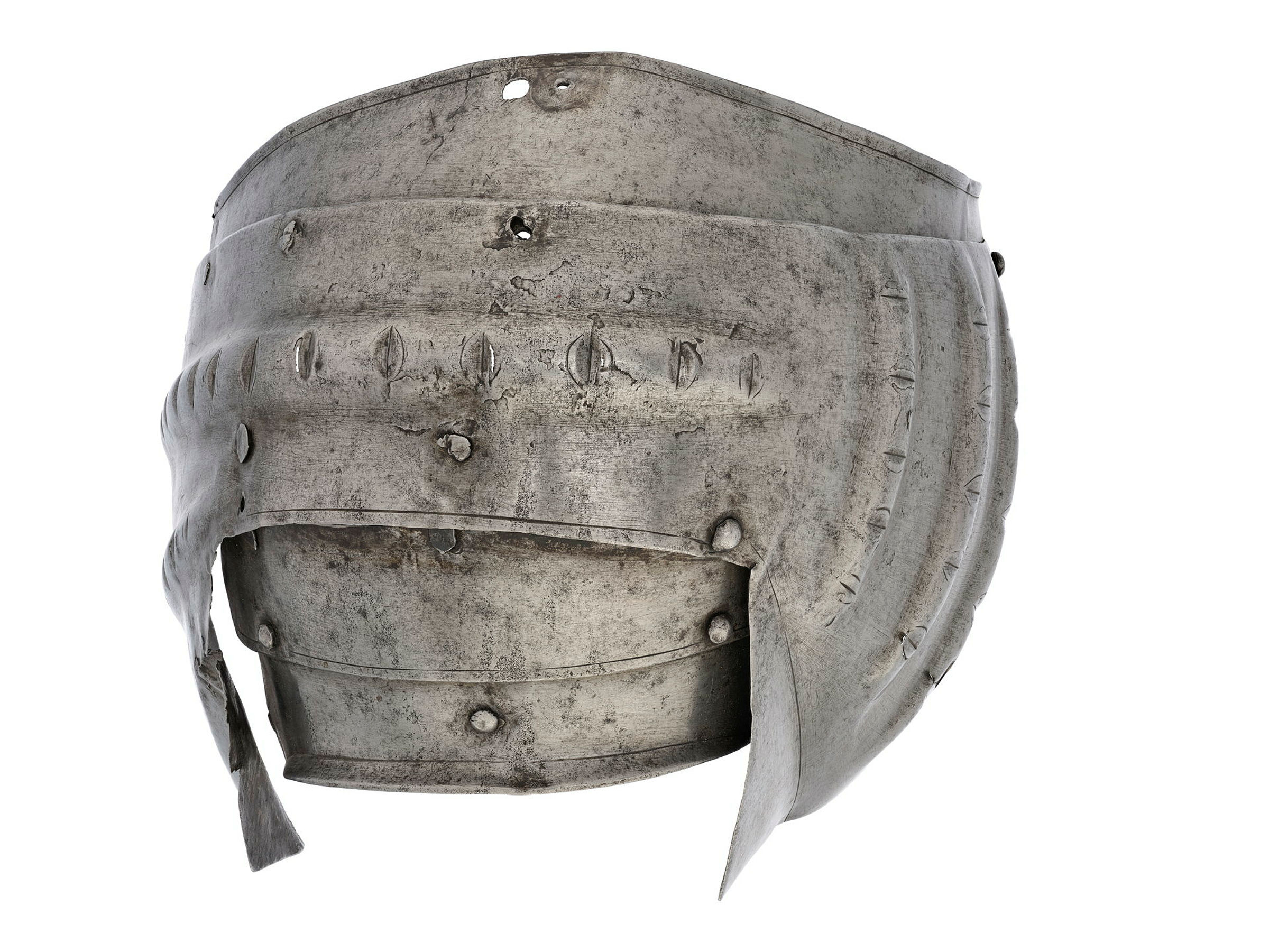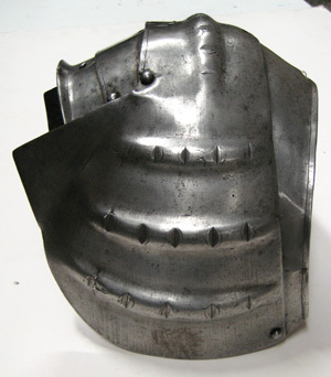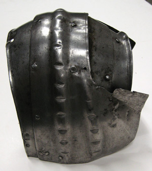 Blank stålplåt bestående av sammanlagt fyra delar. Två större välvda skenor utdragna över skuldra och bröst. Mot utsidan rektangulär urtagning och där två mindre skenor satta omlott. Kanterna släta och enkelt avskurna, inre kant mot bröstet och yttre kant vid axeln omvikta inåt, den senare tjockare och vinklad snett uppåt. Enkelt skuren kantlinje. På största skenans framsida två vertikala slitsade åsar och på baksidan tre horisontella.