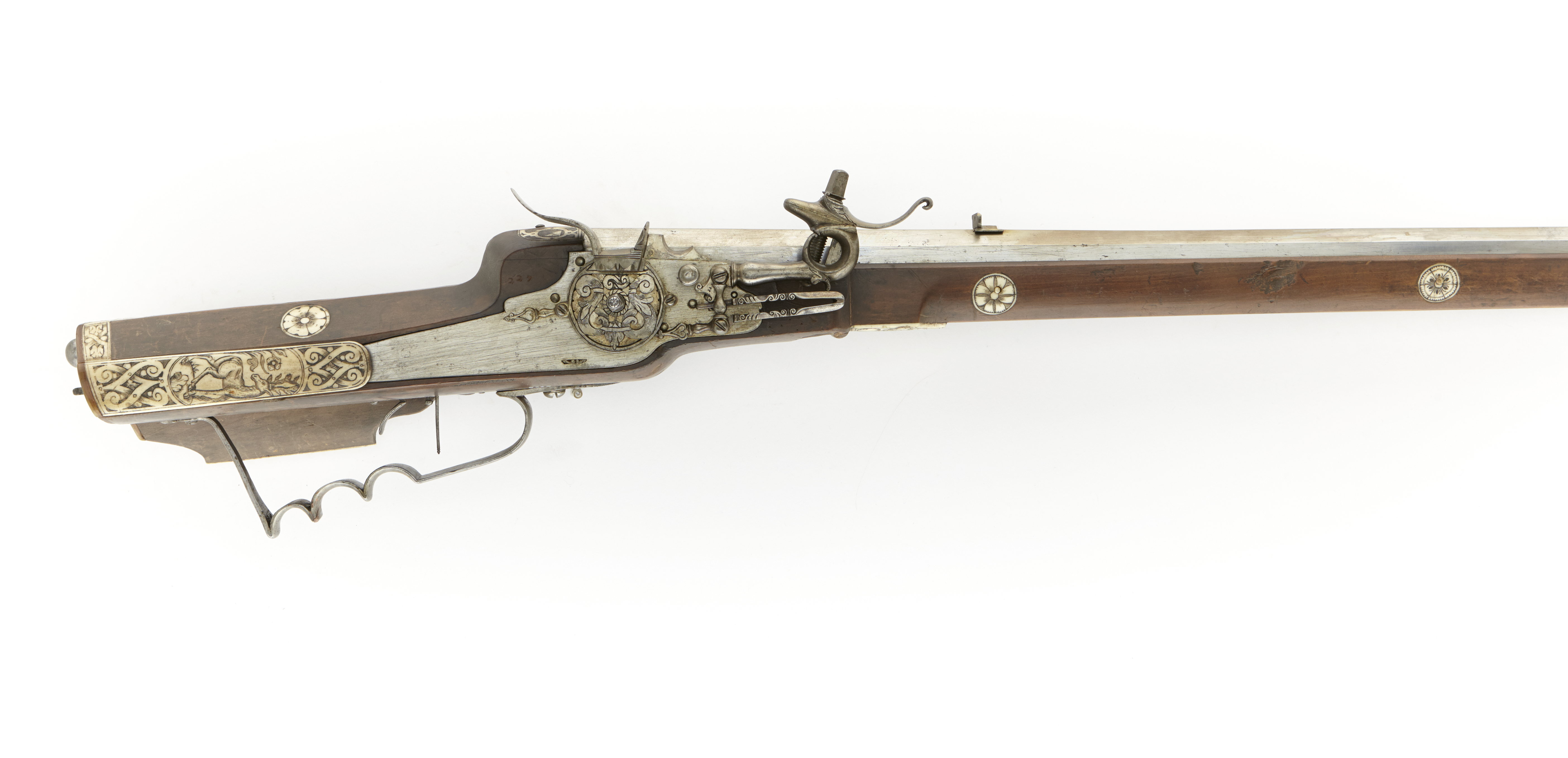 Åttkantig pipa av stål, 8 räfflor. På kammaren stämpel med CL över djurhuvud (Stöckel nr 2241). Ovanför stämpeln inslaget "HALL".Framför siktet inslaget årtal: 1639. Ståndsikte av stål. Stolpkorn av mässing. 3 piphäften. Hjullås. Låsbleck av tysk typ, bakåt avsmalnande genom två fall. Stor, bakåtböjd krutskärm. Hjulet täckt av genombruten kapsel, fastskruvad kl.9 och kl.3. Hane med lös överkäke. Hanhalsen ringformigt genombruten. Hel stock av bok? Tysk kolvtyp. Bakplåt av horn, stödkula av stål.Stocken inlagd med graverat ben. Kolvlådelocket helt av ben, motiv: hjort omgiven av voluter. På kolvryggen räfflat tumgrepp. På benplatta bakom svansskruvbladet, graverat "I.W." (se Stöckel 3659). På anslaget jägare till häst, utskuren ur ben. Två låsskruvar med runda benbrickor. Tre piphäften, varav två ursprungliga av ben. Pipstiften har runda benbrickor. Näsband och rörka av ben. Varbygel med 3 fingerlägen. Avtryckare med snälltryck. Tillbehör: Laddstock med doppsko av ben. Krats. Märkt: 227 ovanför låsblecket, stanstyp 5376. 24 med stora svarta bläcksiffror, på anslaget. Enligt 1648 års Wismarinventarium: "Stoodzsseer medh Ritat arbete på låssen.../1/ N: 24". 1710 års inventarium p. 15, rum II, "84-227-1 Studzare blanck pijpa Hall på, och årtal 1639. Hiulåås med genombruten puckla beensat ståck på anslaget 1 Karl till Häst och lägger an med bösan. -8-".