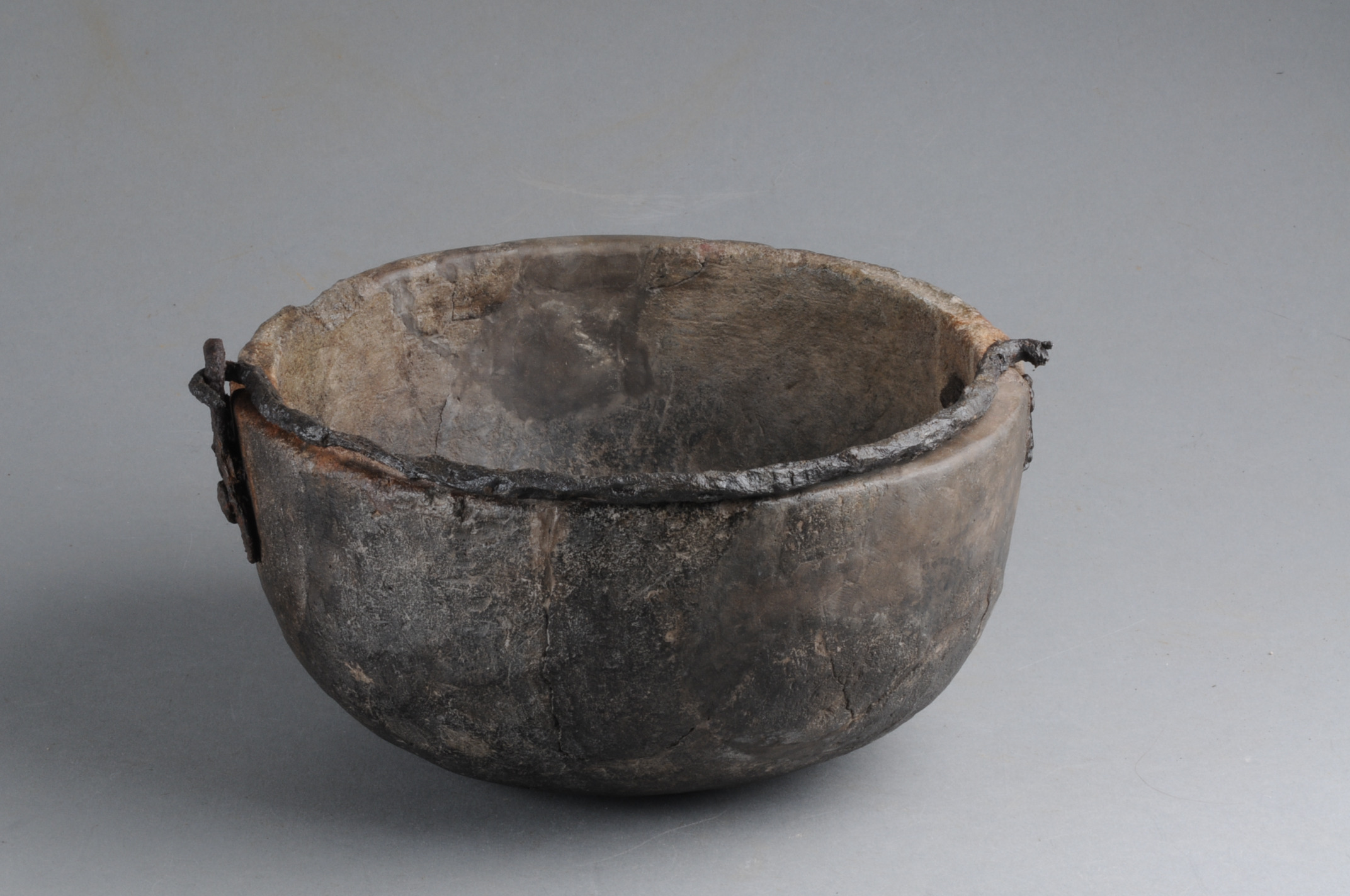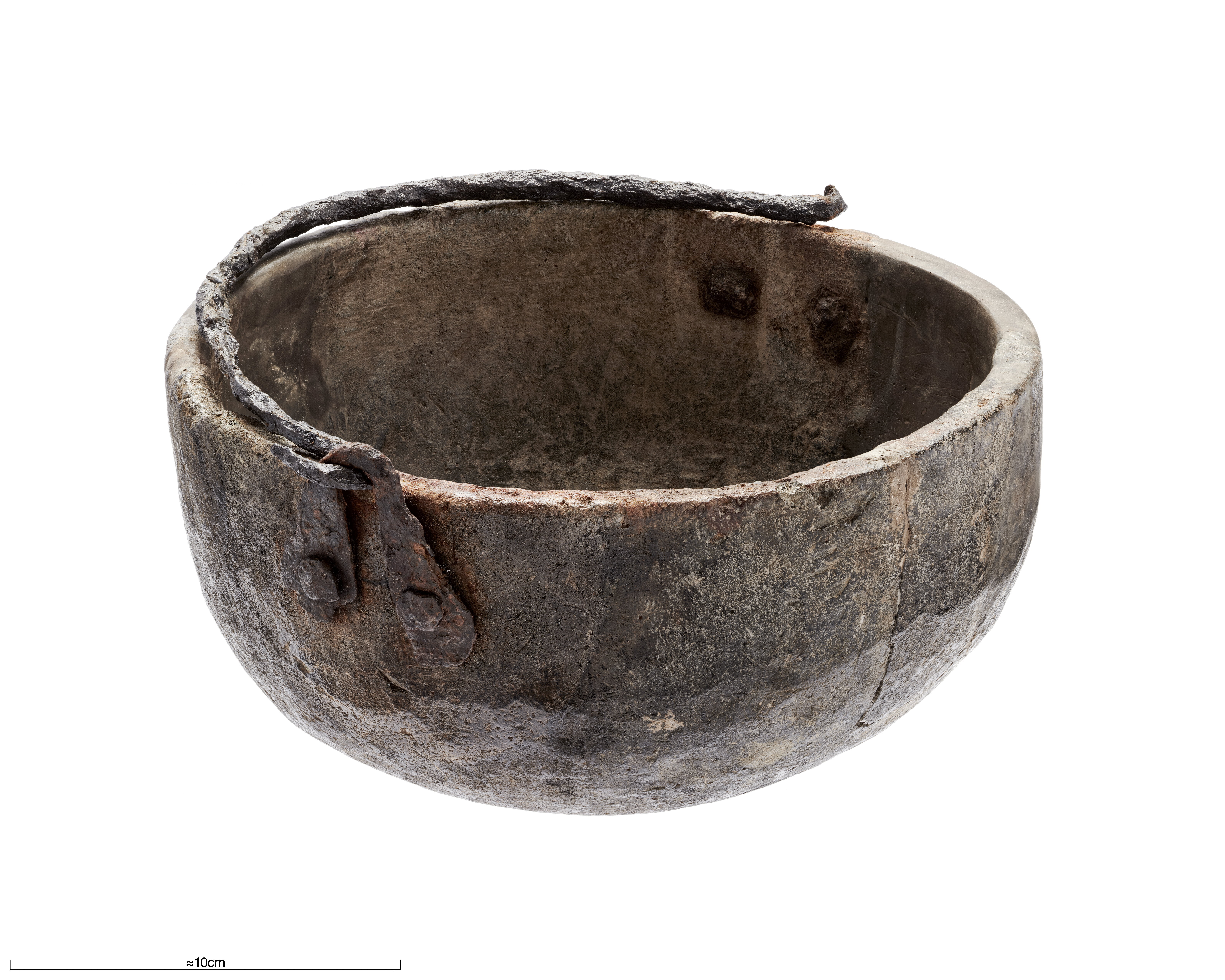 Rundbottnat kärl av täljsten; delvis rekonstruerat. Hank och hankfästen av järn.