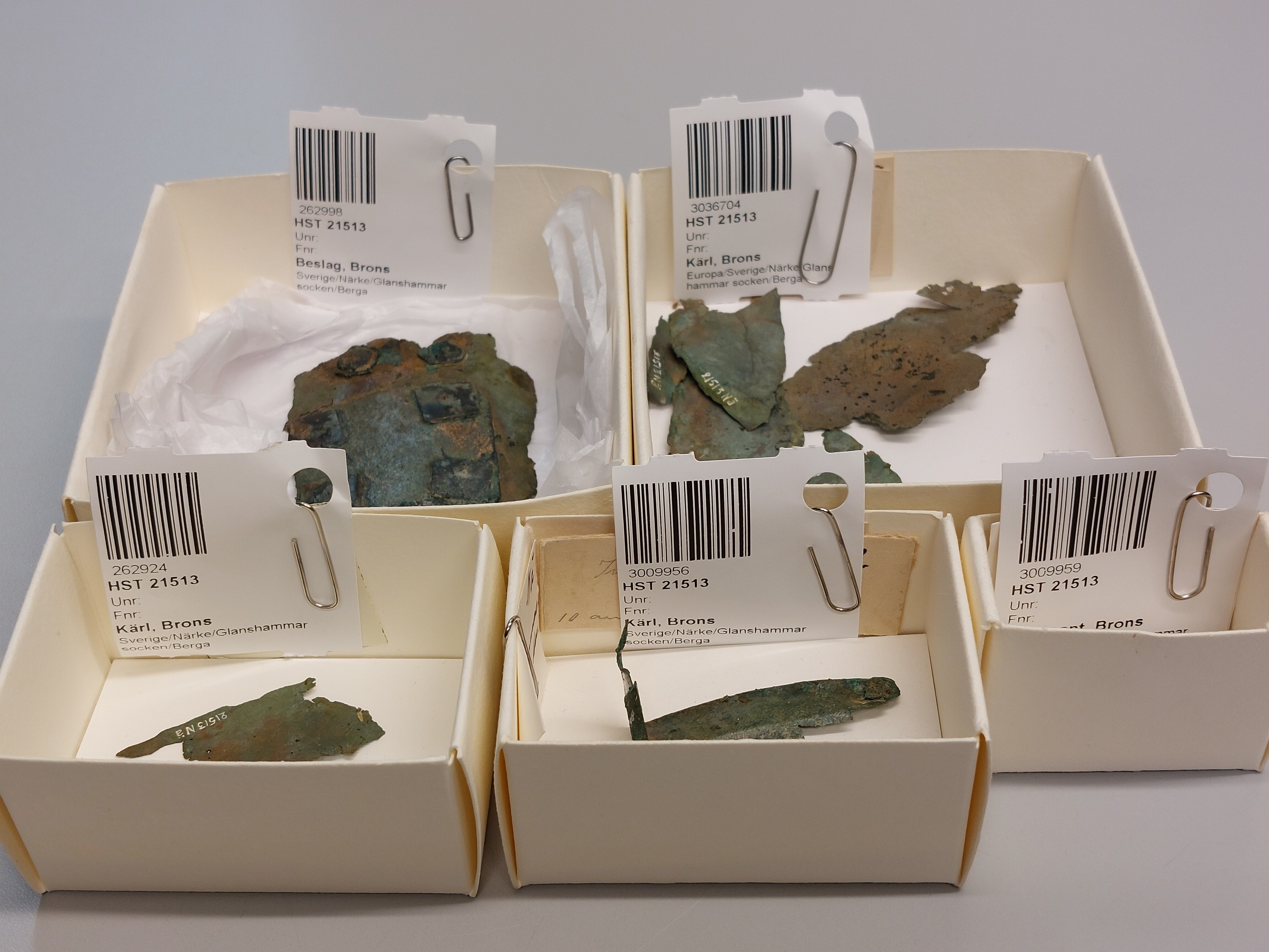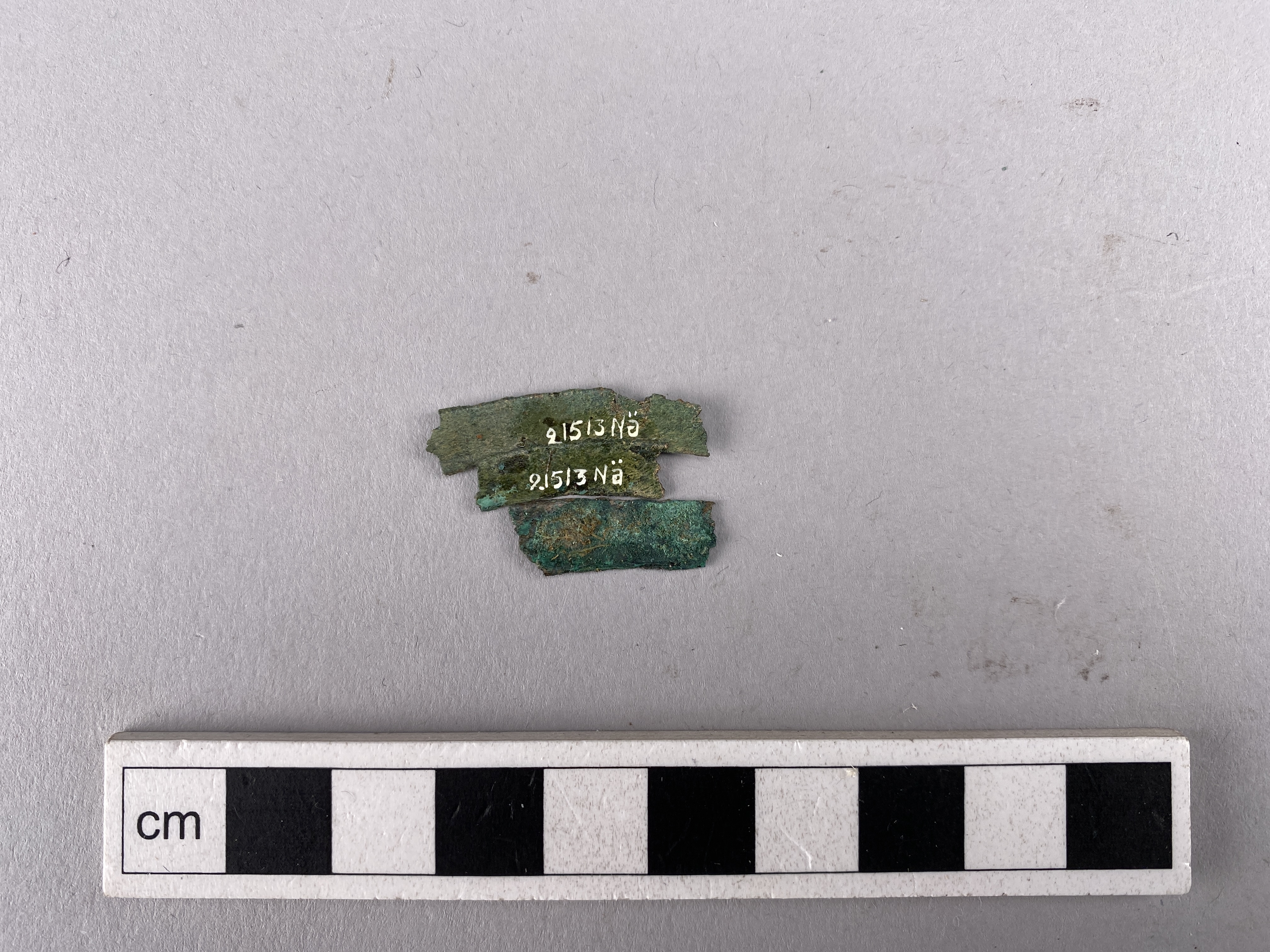 tre bandformiga bronsfragment sammanärgade. Ett har släppt