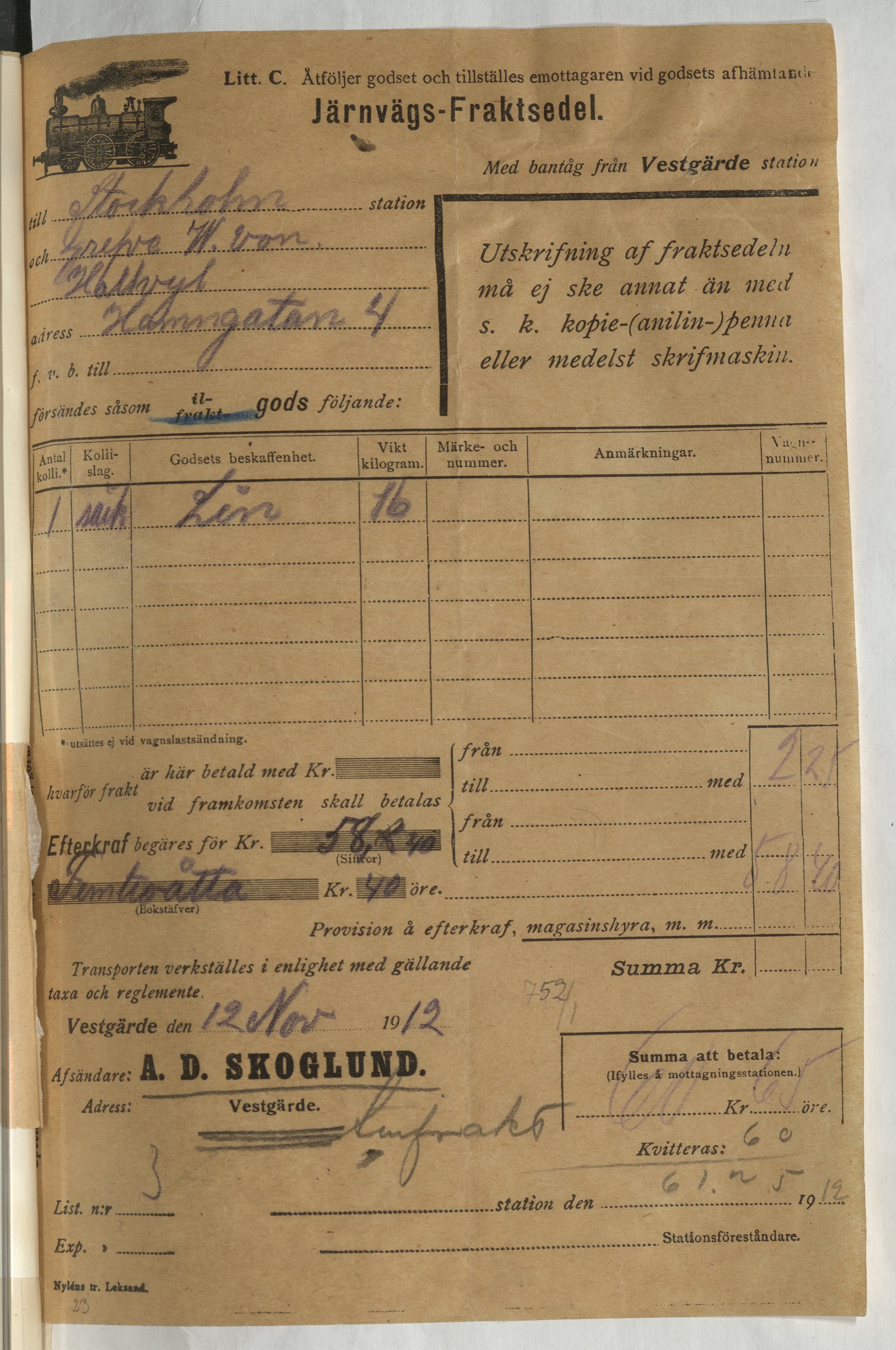 Järnvägsfraktsedel, avsändare är A. D. Skoglund. Västgärde, 1912.