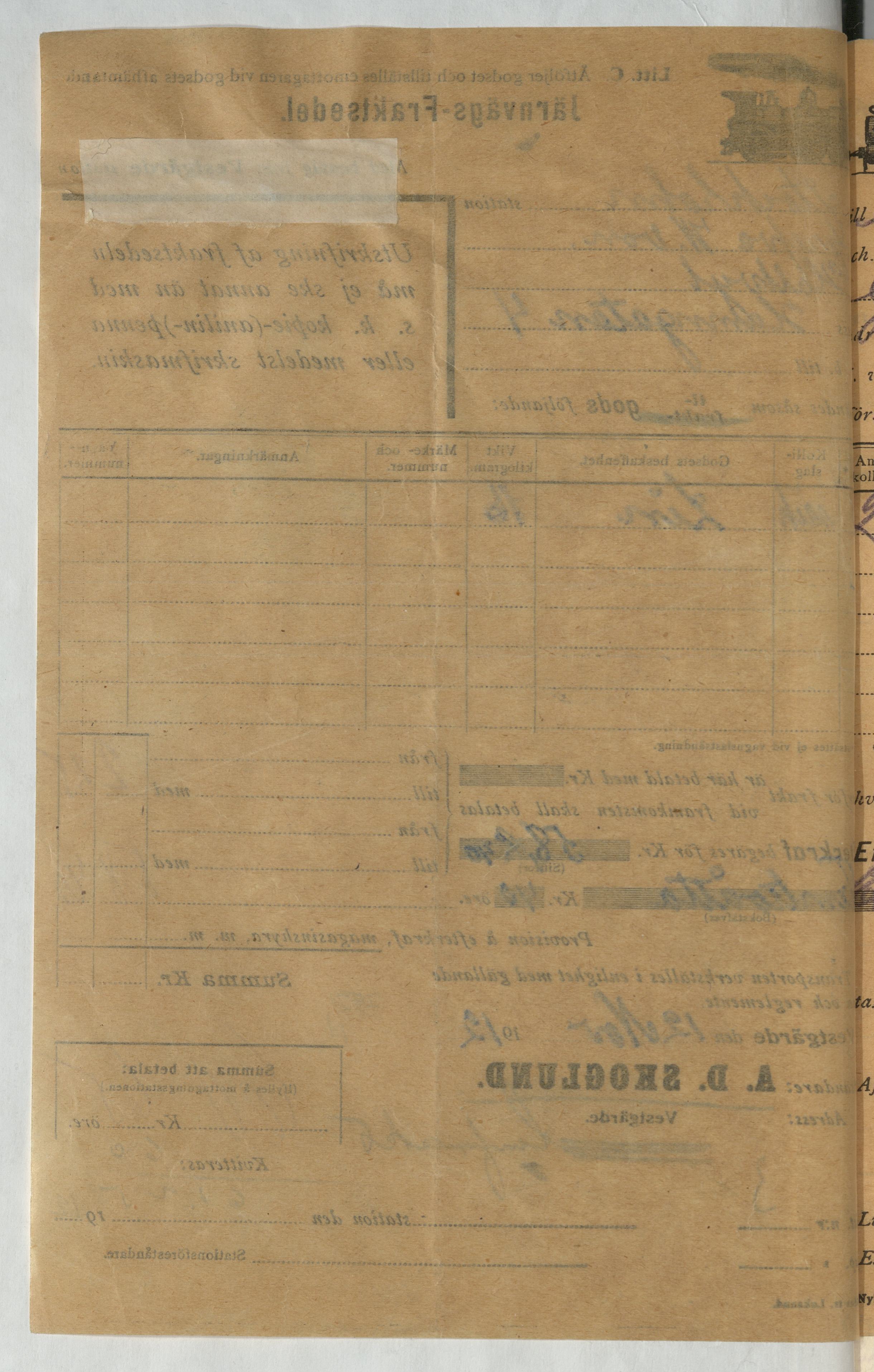 Järnvägsfraktsedel, avsändare är A. D. Skoglund