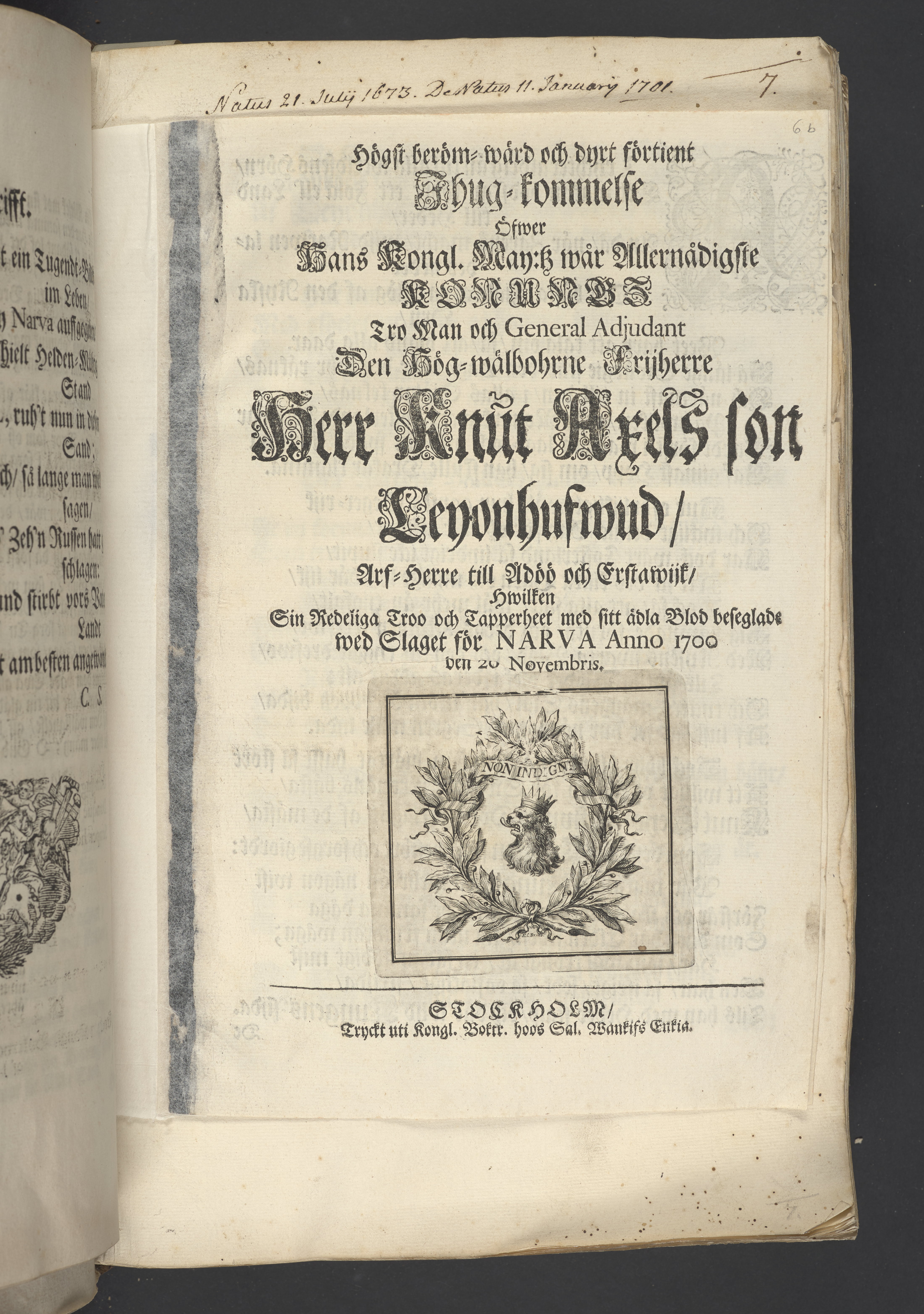 Högst beröm-wärd och dyrt förtient ihug-kommelse öfwer hans kongl. may:tz wår allernådigste konungs tro man och general adjutant den hög-wälbohrne friherre Herr Knut Axels son Leyonhufwud/ Arf-herre till Adöö och Erstawijk/ hwilken sin redeliga troo och tapperheet med sitt ädla blod beseglade wed slaget för Narva anno 1700 den 20 Novembris. Stockholm/ Tryckt uti Kongl. boktr. hoos sal. Wankijfs enckia.
