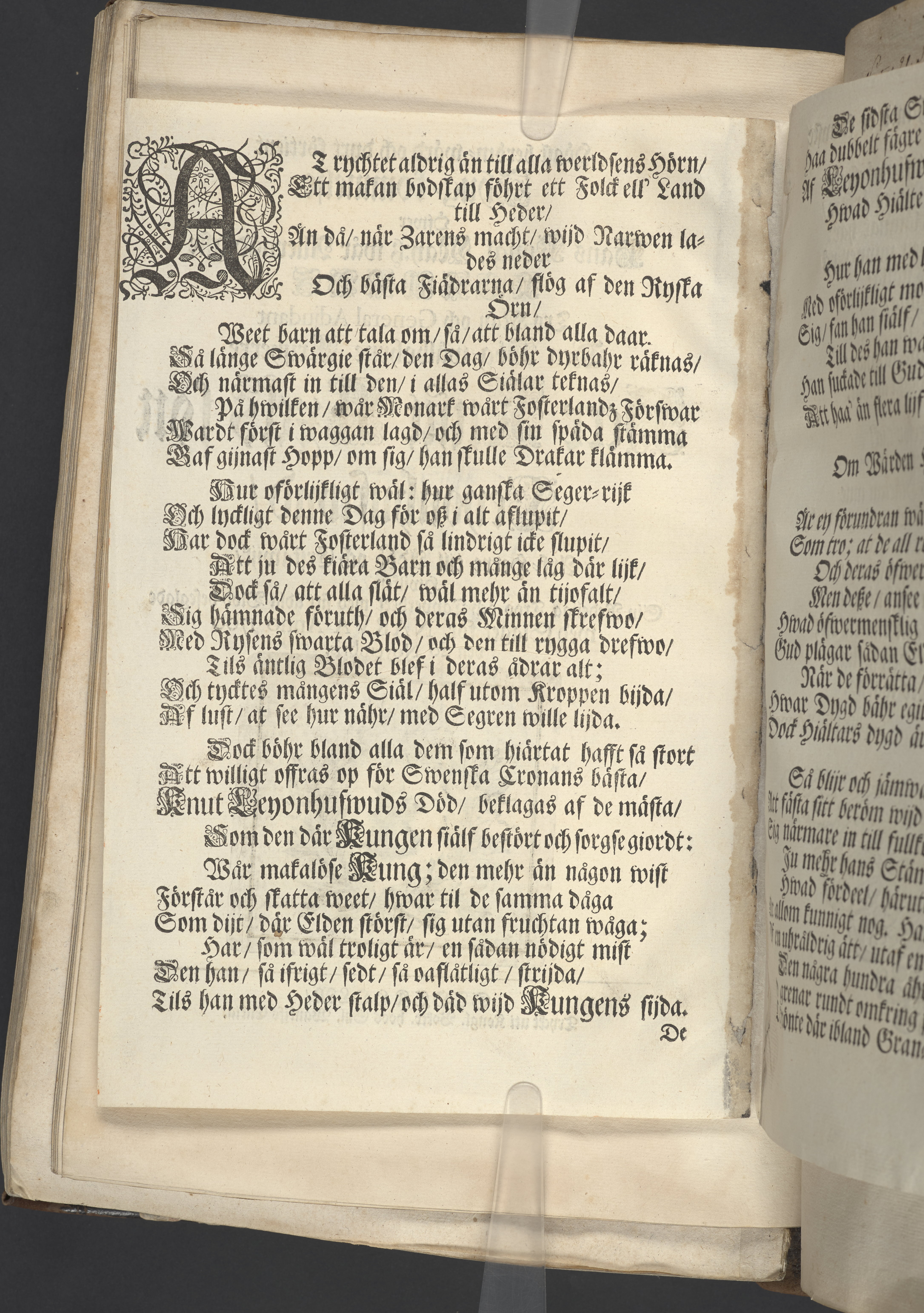 Gravdikt av Sophia Elisabeth Brenner över Knut Axelsson Leijonhufvud i samband med dennes begravning. Saknar paginering och arksignatur. Sannolikt del av den i trycket utgivna likpredikan över Leijonhufvud. På titelsidan en vinjett i kopparstick med ätten Leijonhufvuds vapen inom en lagerkrans, med devisen "Non indigne". Under lagerkransen signerad "El. Br. inv." (Elias Brenner invenit"). Gravdikten låg tidigare löst i kolligatbandet, och är skuren i mindre format än likpredikan.