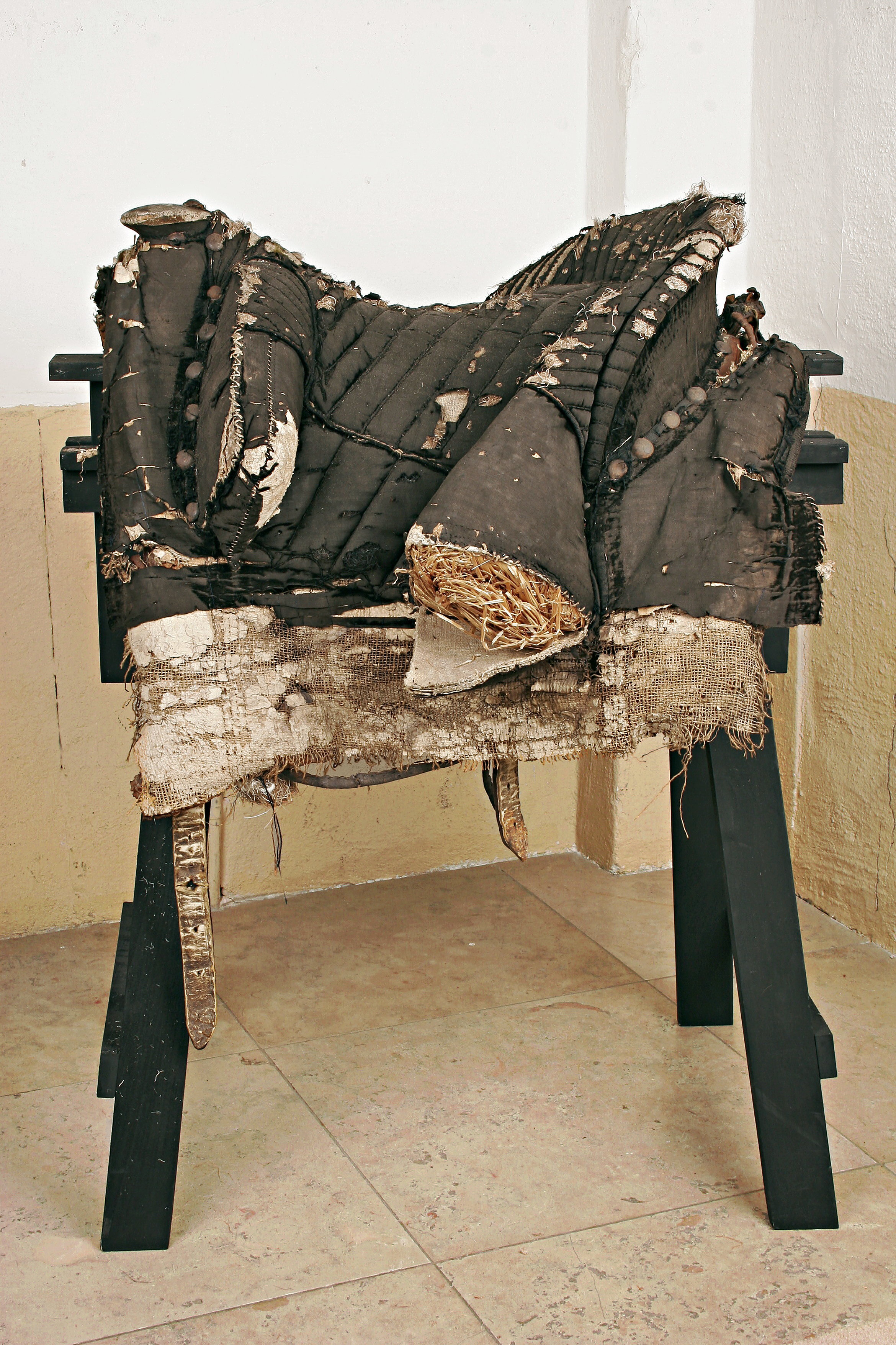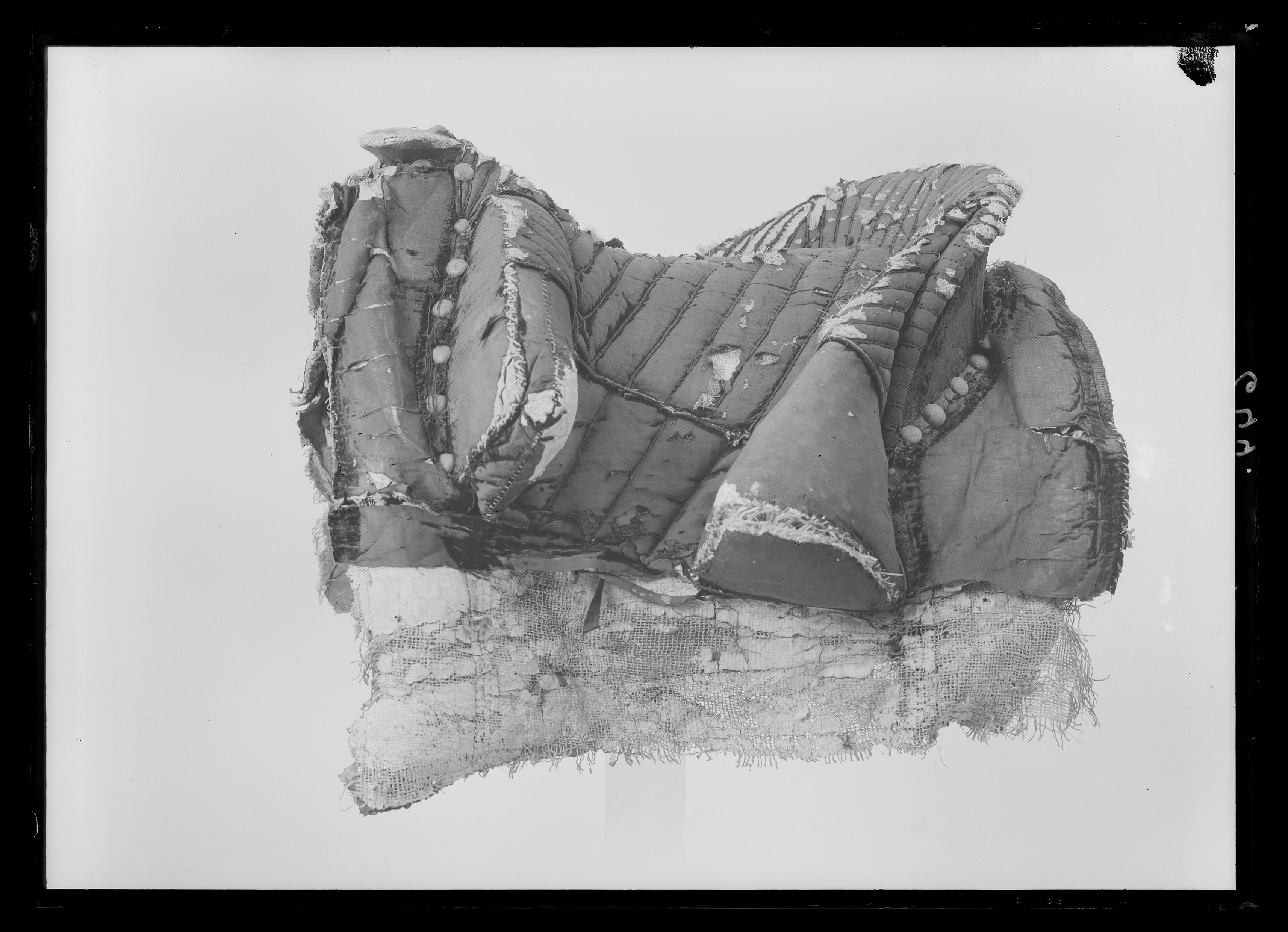 Bomsadel av svart sammet med stickningar av svart silkegarn i kedjestygn. Rektangulära kappor fodrade med brunt läder. Tvådelad frambom med snett avskurna ändar, ca 530 mm bred, ca 110 mm hög. Bakbom med stödbommar, ca 650 mm bred, 110 mm hög, på insidan med täta, lodräta stickningar. Sadelknapp upptill plan, klädd med sammet. Framför frambommen på vardera sidan en rad med sju tennlickor av stål, bakom bakbommen på ena sidan sex, på andra fem tennlickor. Bommen klädd med brunt skinn. Bossor av naturfärgat linne, kantade med brunt skinn. Fyra sadelgjordsstroppar av vitt läder, fodrade med brunt läder. Två byglar för stigläder samt läderstropp för svansremmen. På framvalvet ögla av läder.