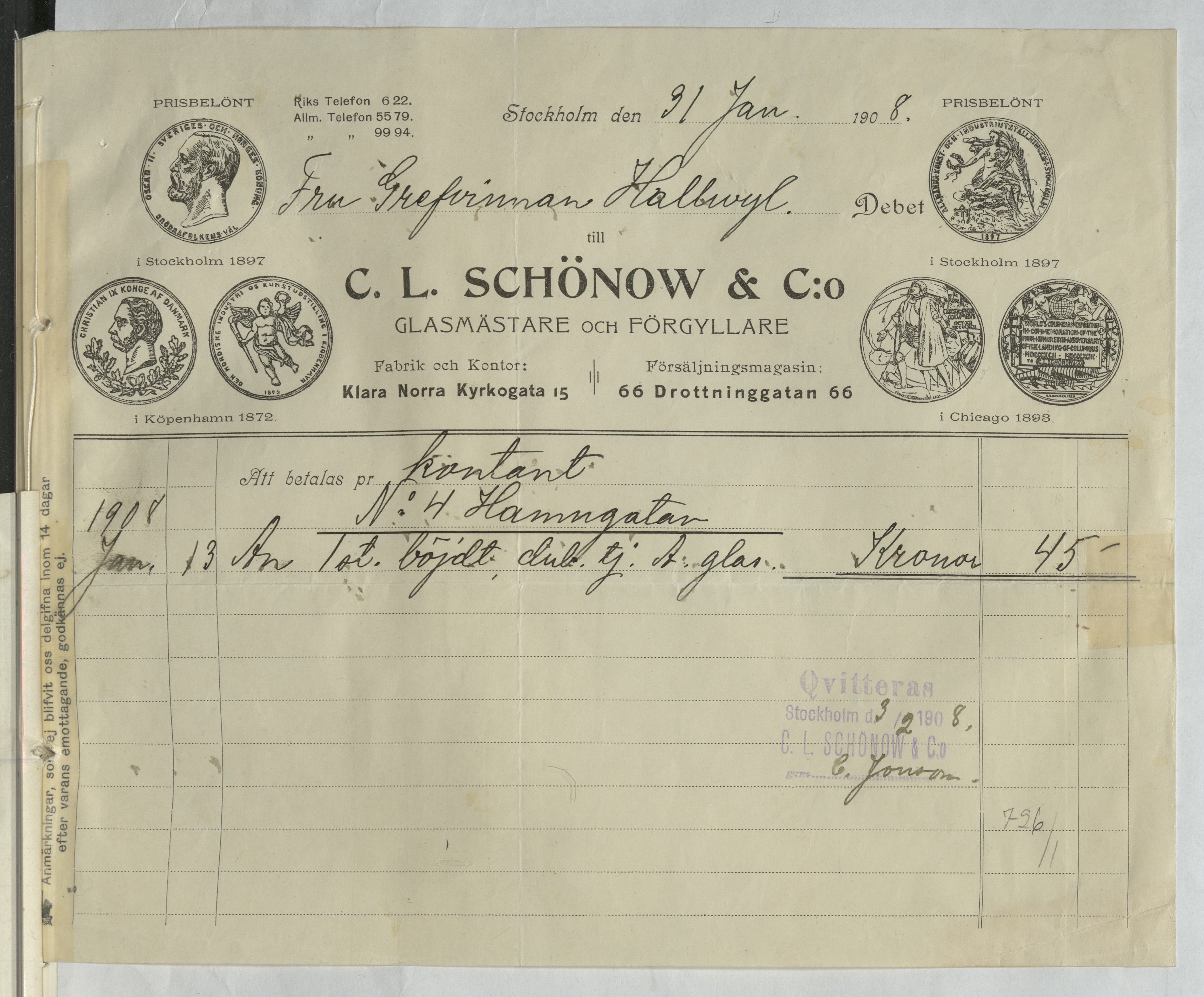 Kvitto från C. L. Schönow & Co. Glasmästare och Förgyllare. Stockholm, 1908.