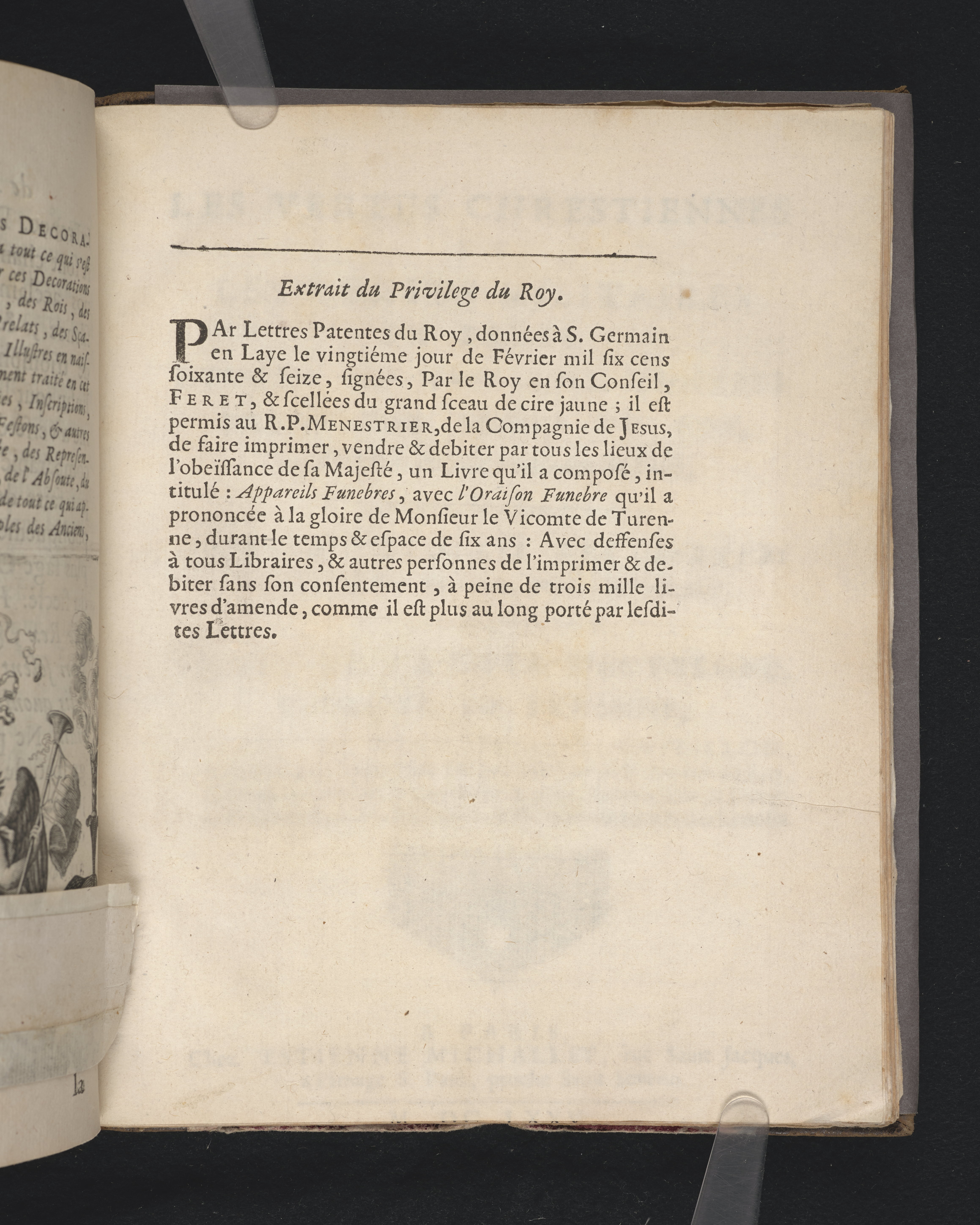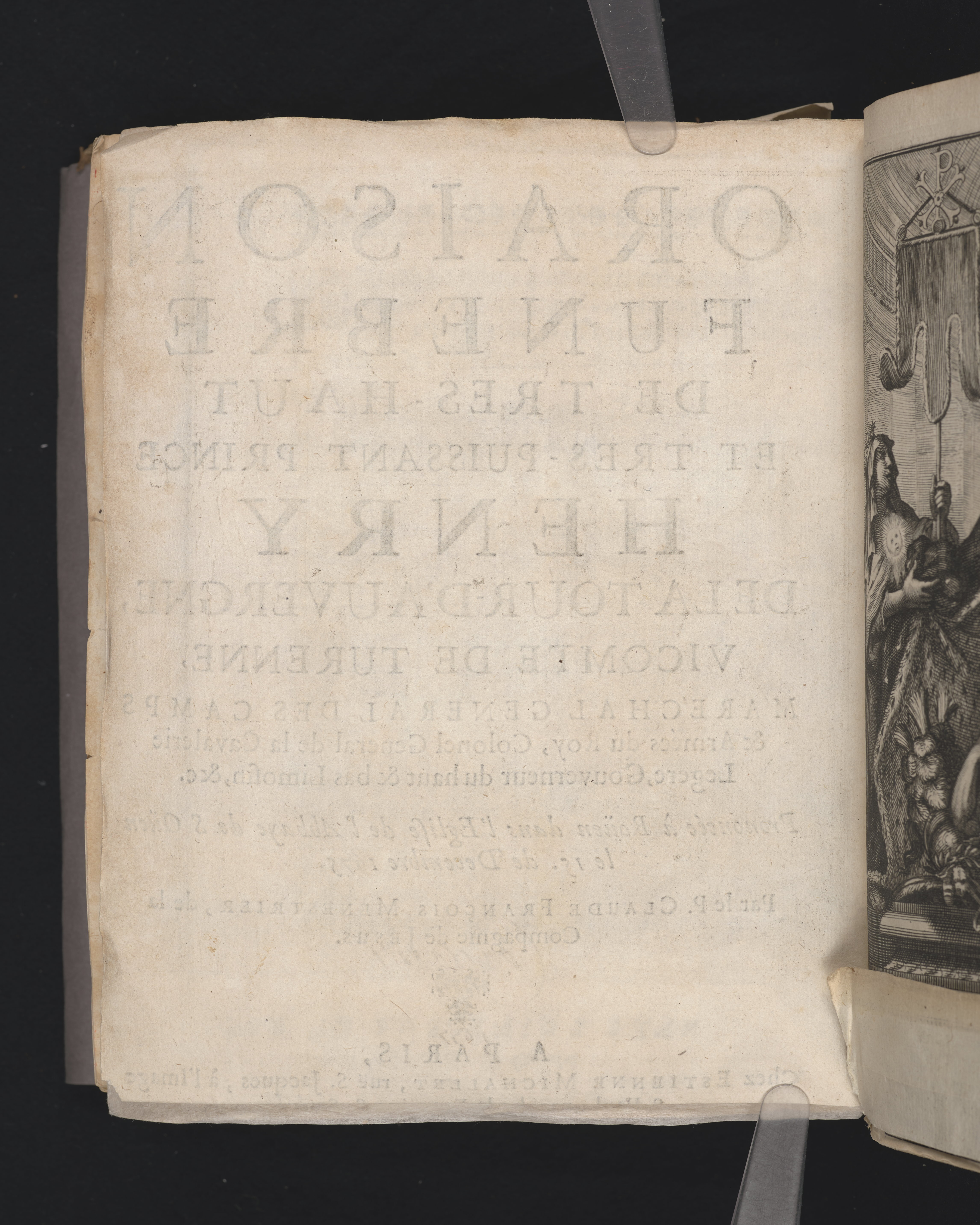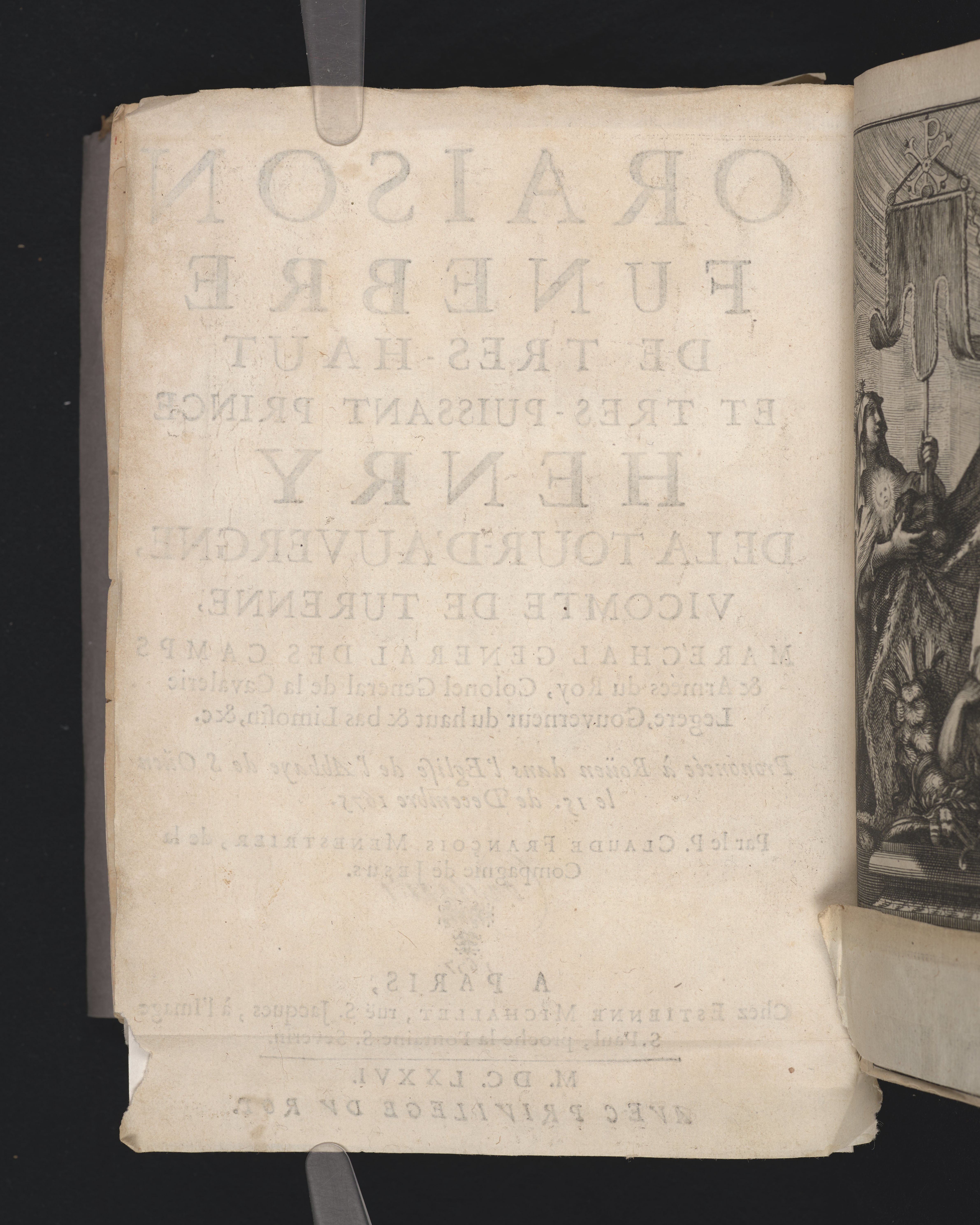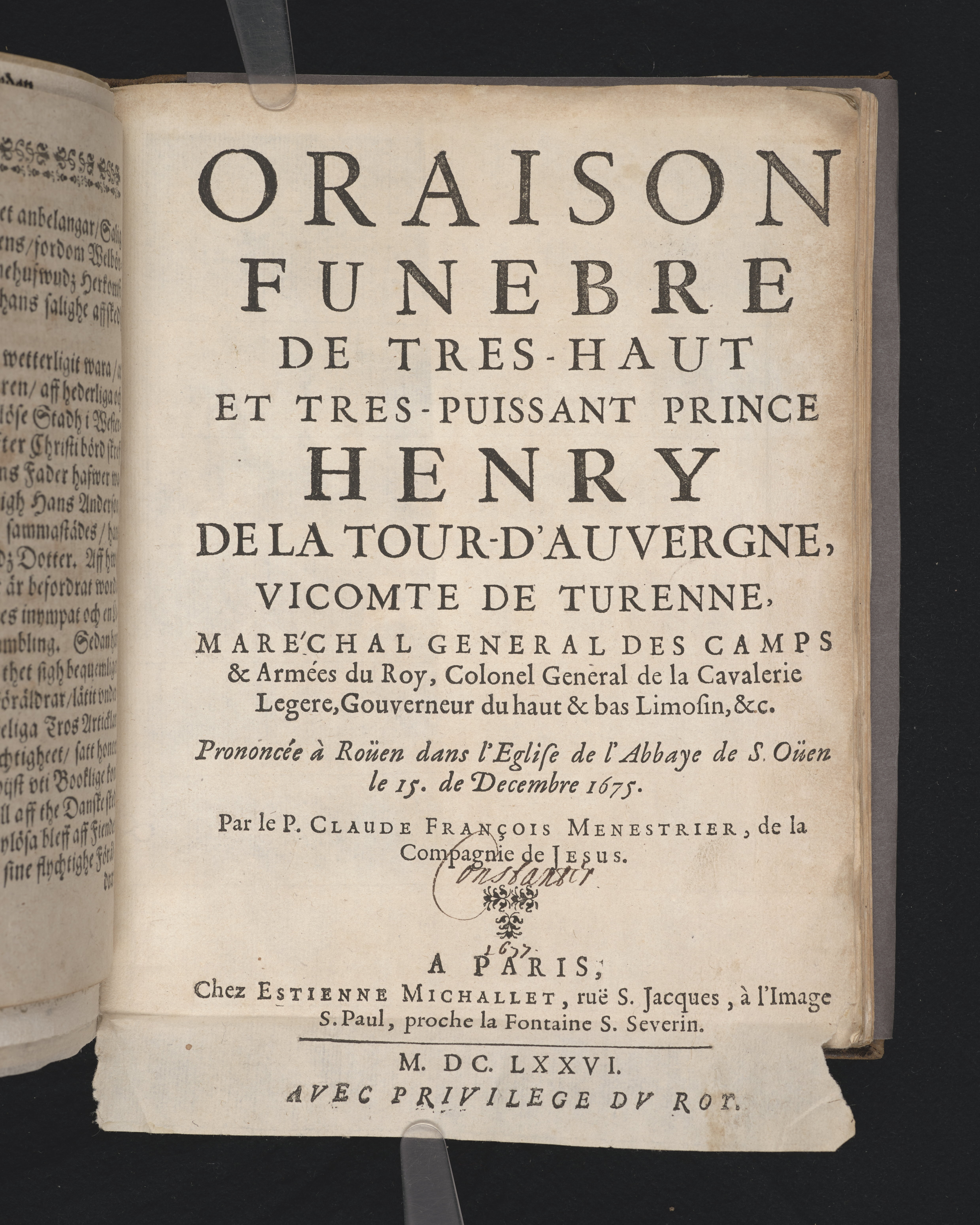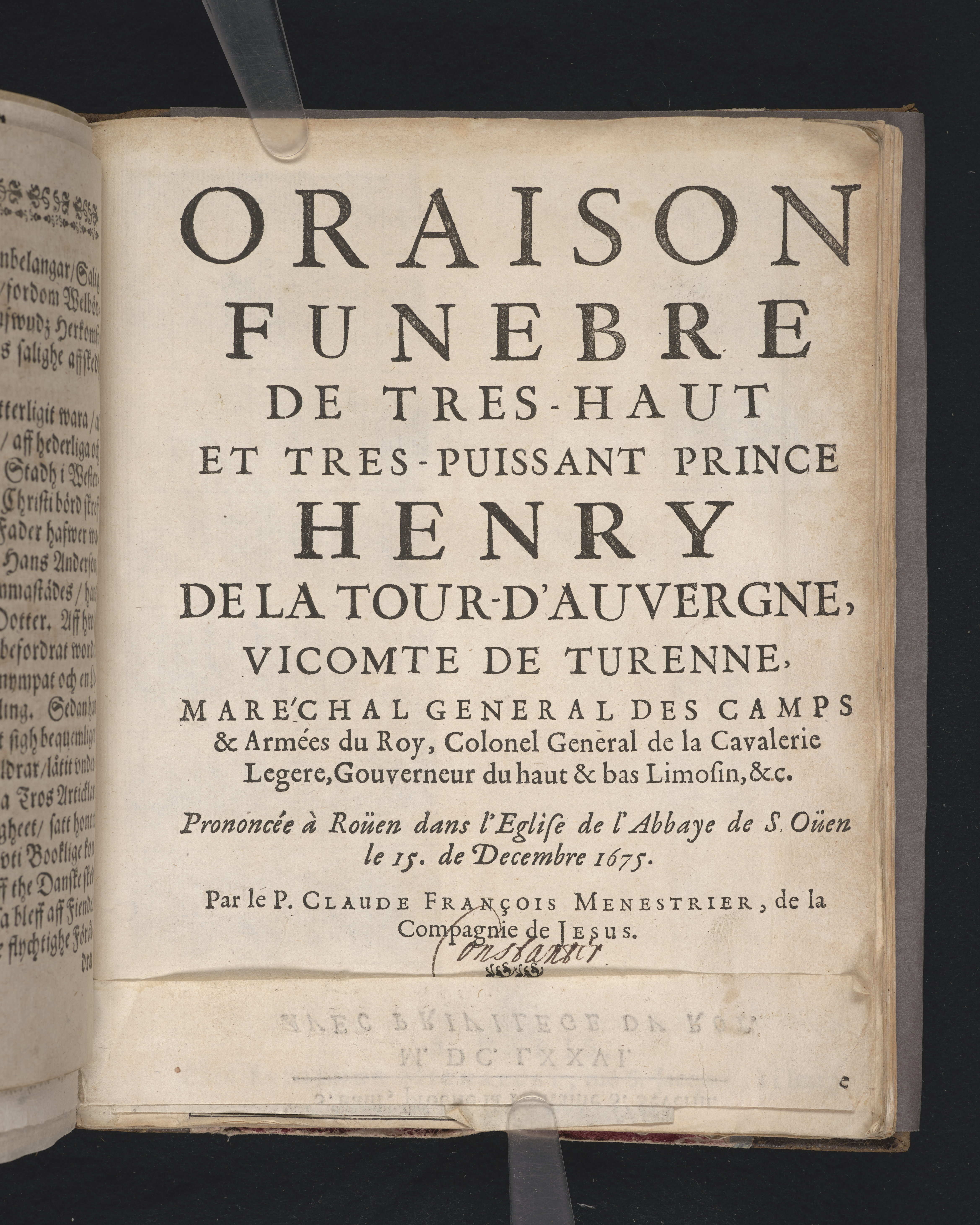 Oraison funebre de ... prince Henry de la Tour-d'Auvergne, vicomte de Turenne ... Prononcée à Roüen dans l'eglise de l'Abbage de S. Oüen le 15. de Decembre 1675. Par le P. Claude François Menestrier ... A Paris, chez Estienne Michallet ... MDCLXXVI.