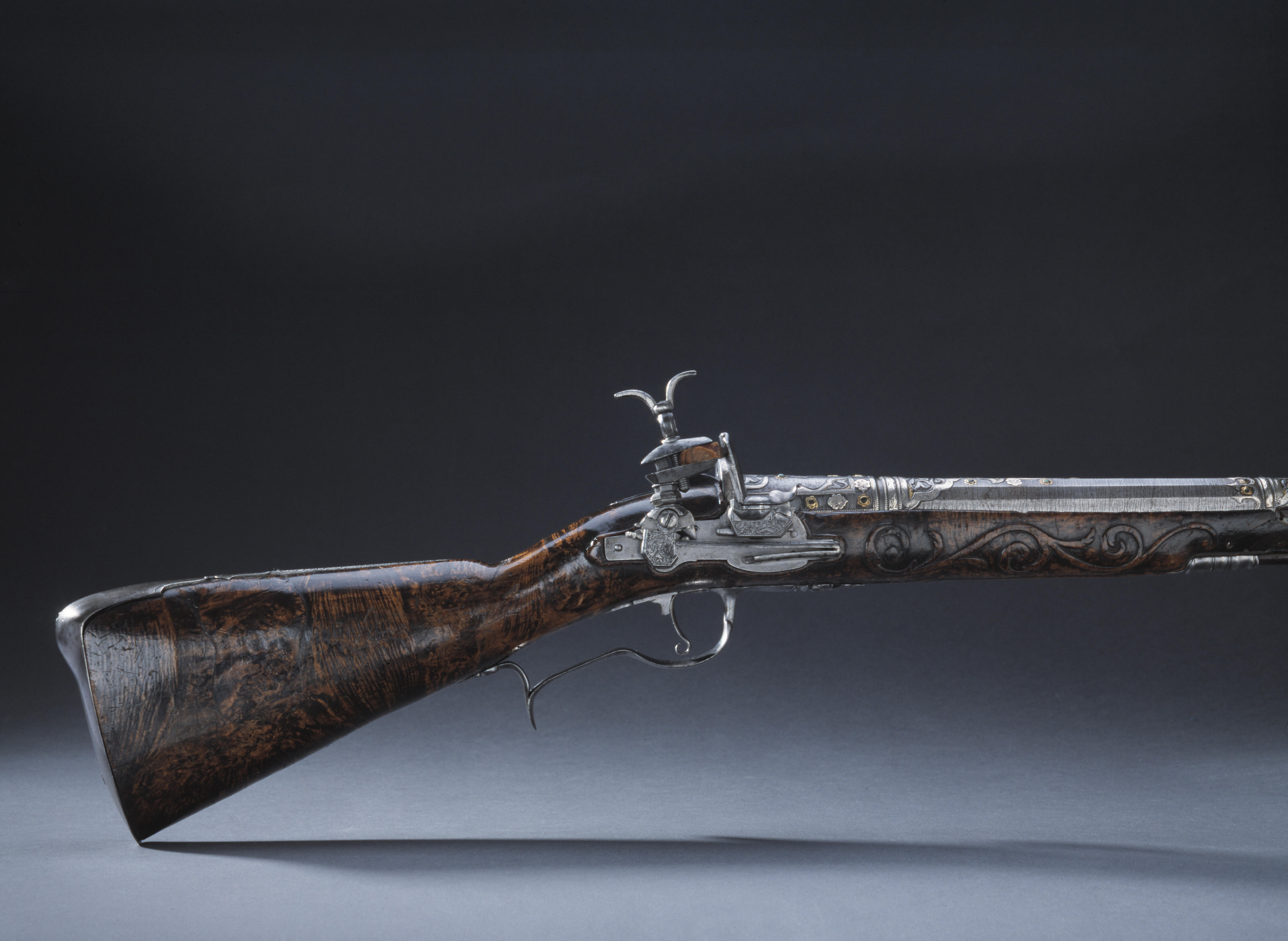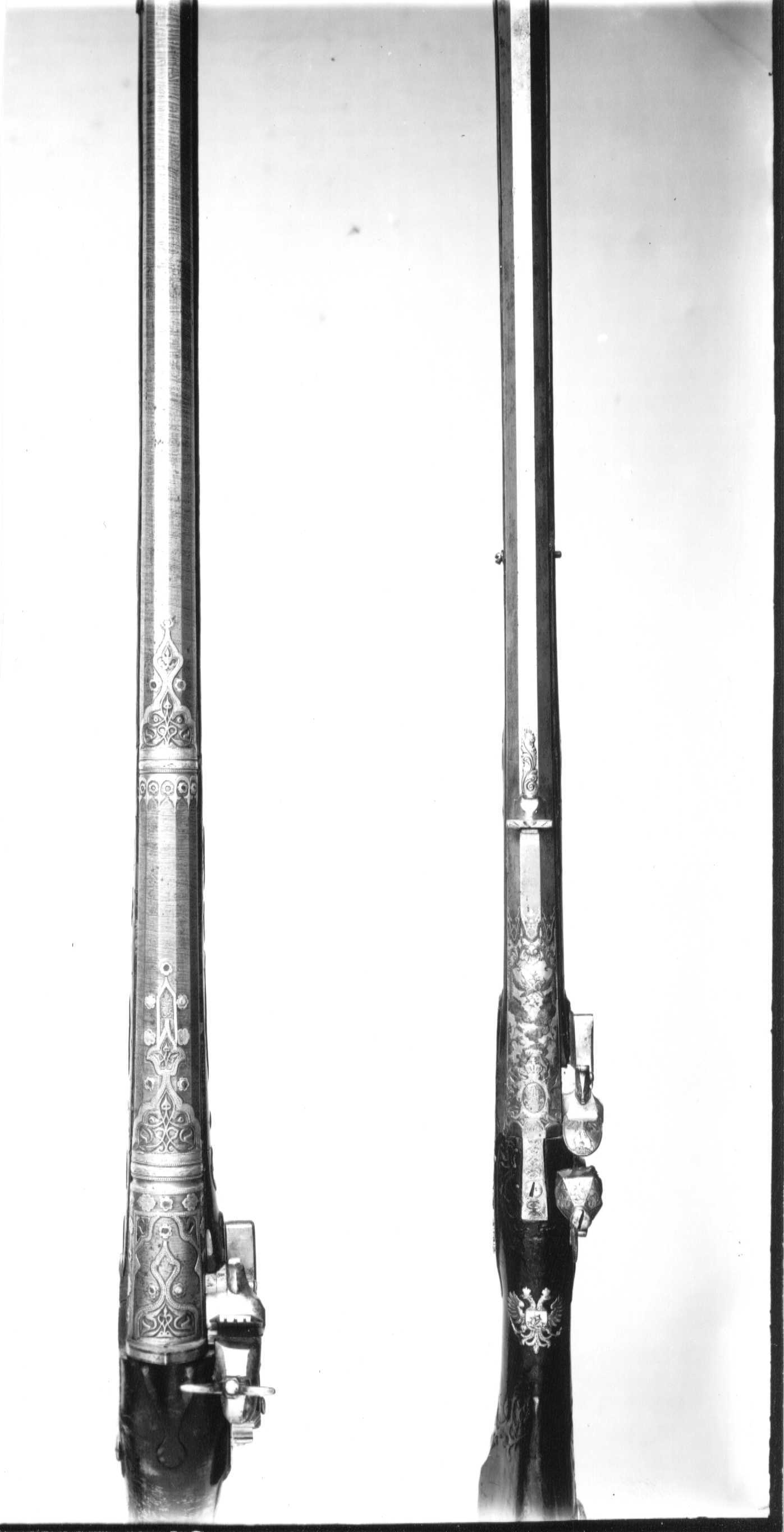 Tolvsidig, slätborrad pipa av damaskerat stål med trumf. Bakre delen av kammaren rund, främre delen tolvsidig, avgränsad med tvärvulster, beslagna med silver. Kammarens ovansida dekorerad i stålsnitt och påslaget silver, delvis med guld, silvret graverat, turkoser i rosettformiga fattningar av förgyllt silver. 22 fattningar, 8 stenar. I ett ornament arabiska skrifttecken, på kammarens sida likaså. Vid mynnigen snidade räfflor på längden, påslagen gulddekor, mynningspartiet ornerat som kammaren med snidade ornament med påslaget guld och silver samt fattningar för 3 turkoser. På mynningen stämpel III (kyrilliskt SJ) krönt av en krona (furst Alexander Sachovskoj). Riktmedel: Sikte i form av hål genom uppstående, spetsig, silverbeslagen och graverad skiva bak på pipan. Korn av mässing med skåra. Fästning: Tre häften. Pipan fäst med krysskruv samt två pipstift. Snapplås av stål av turkisk typ. Plant låsbleck. Hane med profilerad, kantig kropp, kraftiga käkar. Lös överkäke, käkskruv med ringformig nederdel och tvåflikig, vingformig mutter. Batteri med räfflat eldstål med svagt fasad baksida. Utvändig slagfjäder. Stålbleck i batteriets nederkant, på hanfotens studel etsad dekor, människa i halvfigur omgiven av lövverk och inskrift: "MARTIN". På blecket över batterifjädern en halvsittande människa omgiven av lövverk och text: "SEITZ". Fästning och avtryckare: Två låsskruvar. Avtryckare av stål med inrullad ände. Helstock av brunt, flammigt trä. Kolv av fransk typ med något välvd bakplåt av stål, konturerad flik på kolvryggen. Kolvnacken snidad. Vulst runt låsblecket. Framstockens bakre del snidad med volutrankor. Näsband av horn. Profilerad spets-, mellan- och topprörka. Runda låsskruvbrickor av stål. Plant avtryckarbleck av stål. Bakåt utdragen varbygel av stål med konturerade armar, den främre i liljeform. Tillbehör: Laddstock av trä (fastrostad) med skoning av horn, l: 46 mm. I stället för flinta en träbit insvept i röd chagrin.