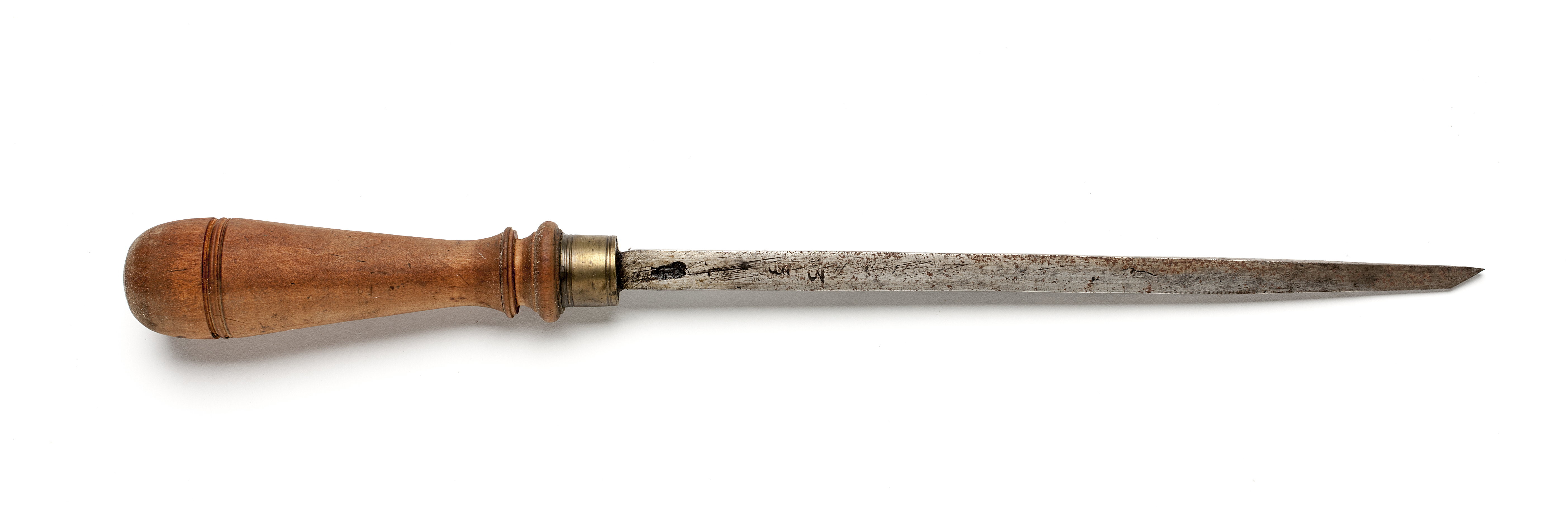 Stämplat på stålet: nyckel, möjligen över bokstav med två staplar, samt "3" tre gånger. Klinga med rektangulär genomskärning. Svarvat skaft av päronträ, med två vulster nedtill ("rydboholmstyp"). Mässingsring.