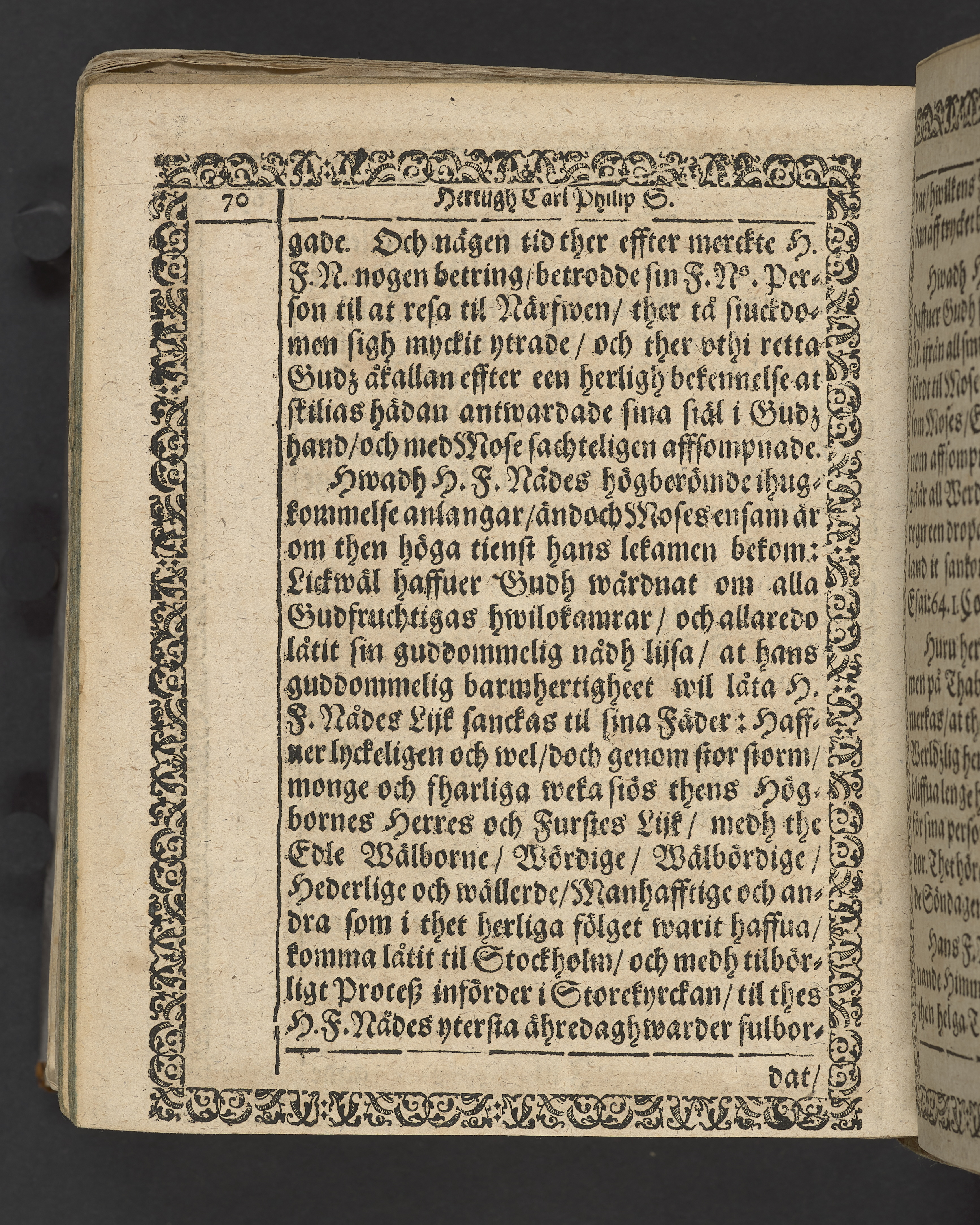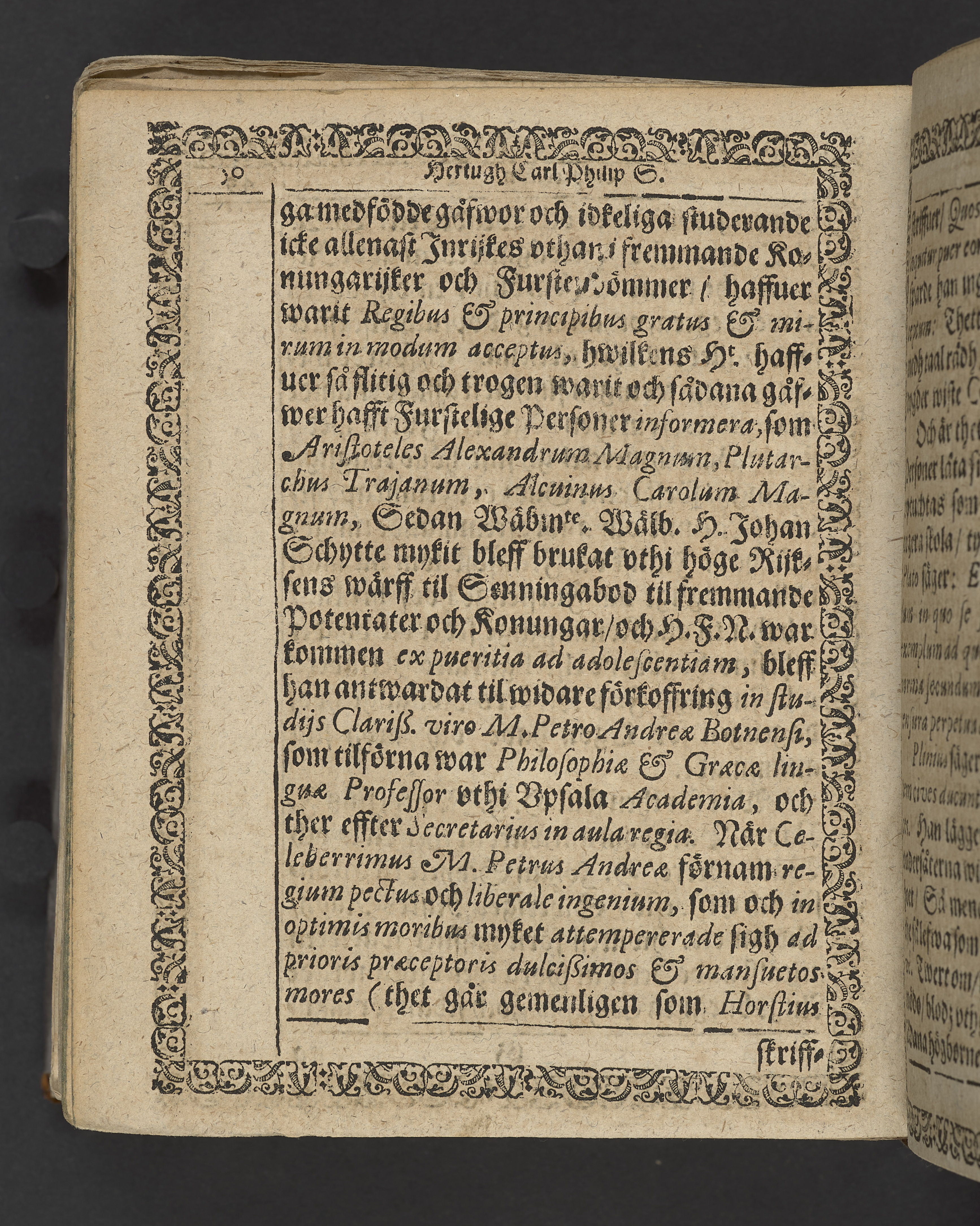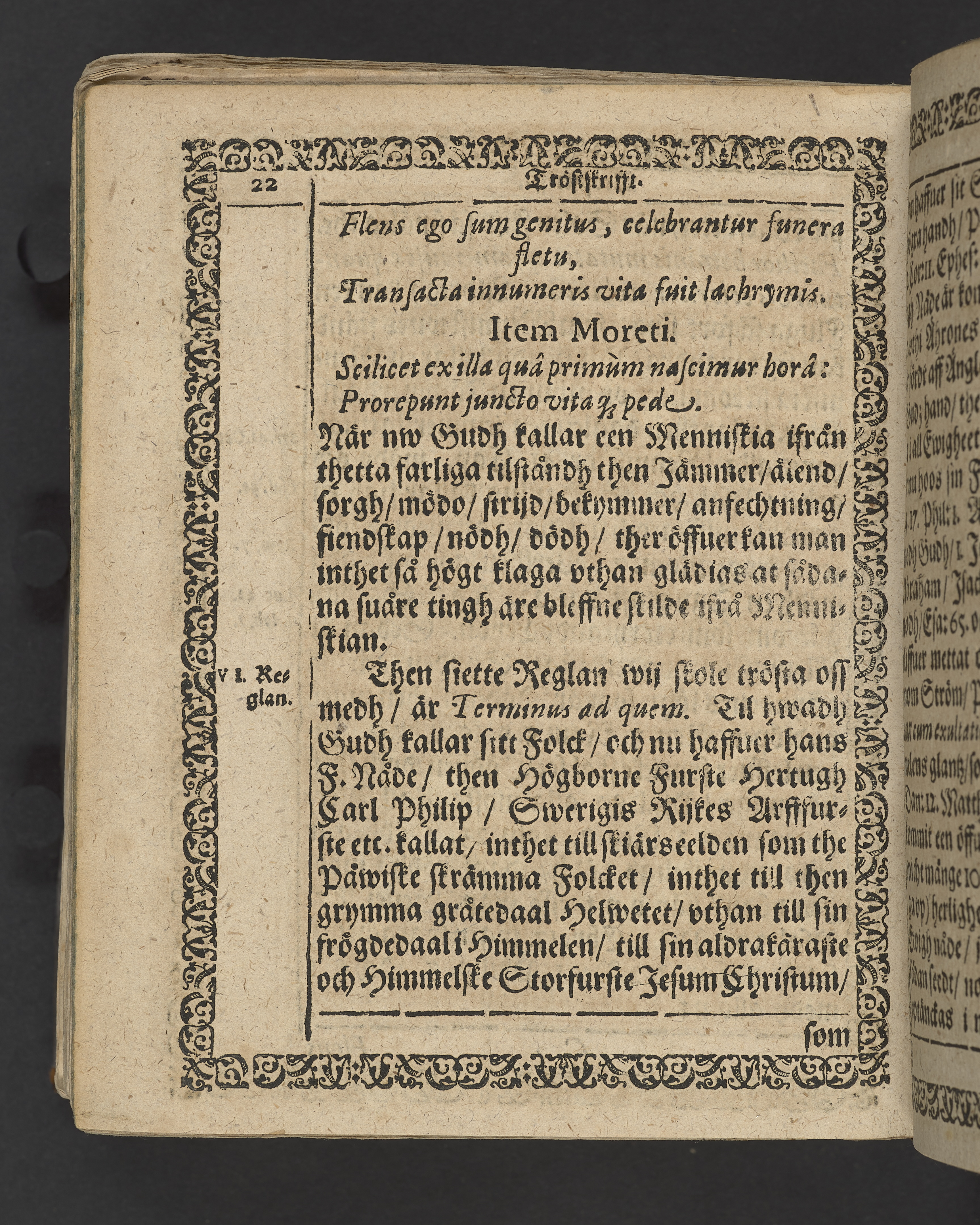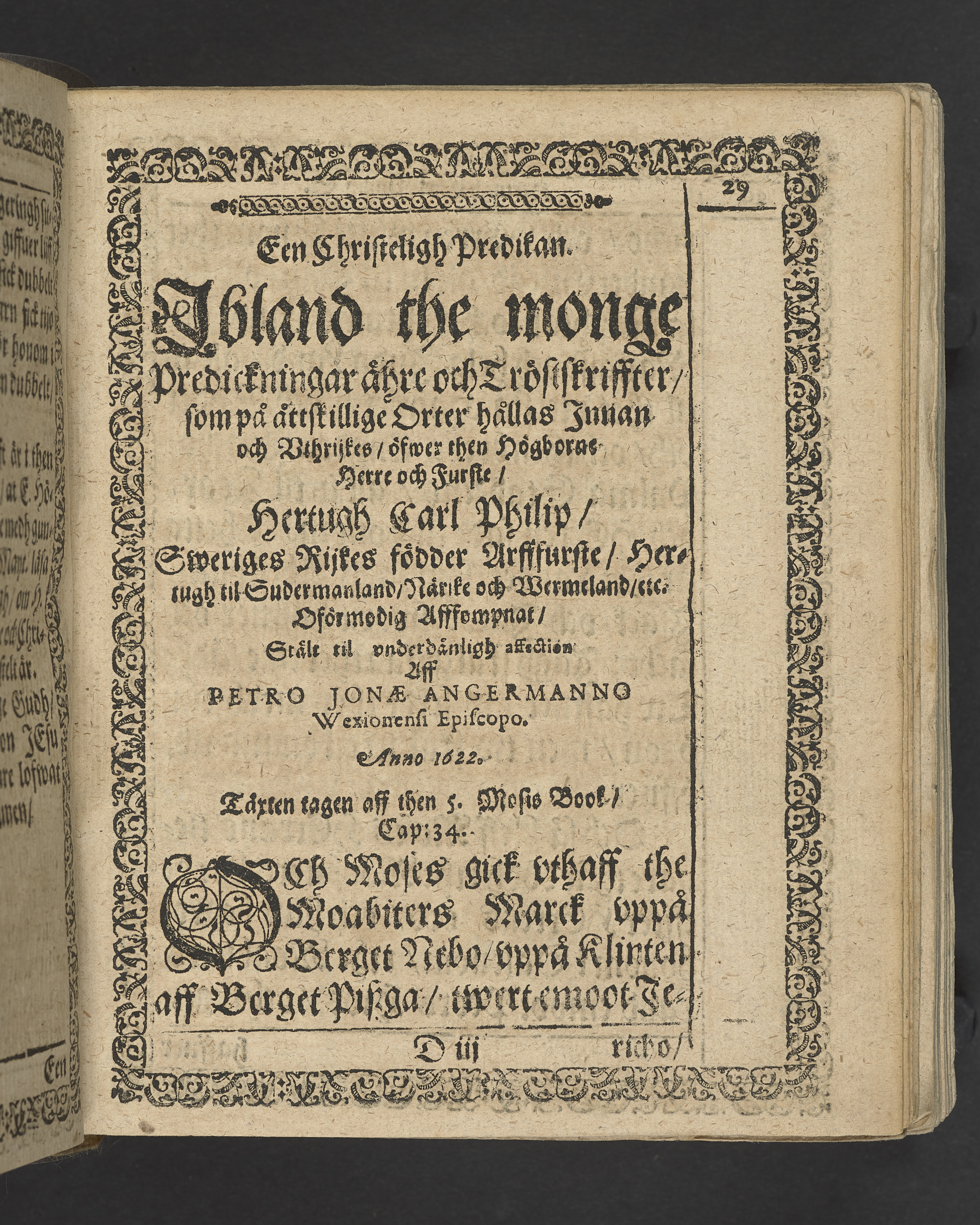 Een kort tröstskrifft til ... frw Christina, Sweriges ... drotning, emoot thet stora sorgefallet som hendt är medh ... hertugh Carls Philipp, Sweriges, Göthes och Wendes Arffurstes ... hughkommelse, oförmodeligh ... kallelse, som skedde i Narfwen vthi Liflandh, then 25. Jan. åhr 1622 ... Sampt en christeligh lijkpredikan öfwer höghbemälte H. F. N. saliga lijk ... i Strängnäs domkyrkia ... samma åhr ... stält aff Petro Jonae Angermanno ... Tryckt i Rostock aff Jochim Fuesz, åhr 1623.