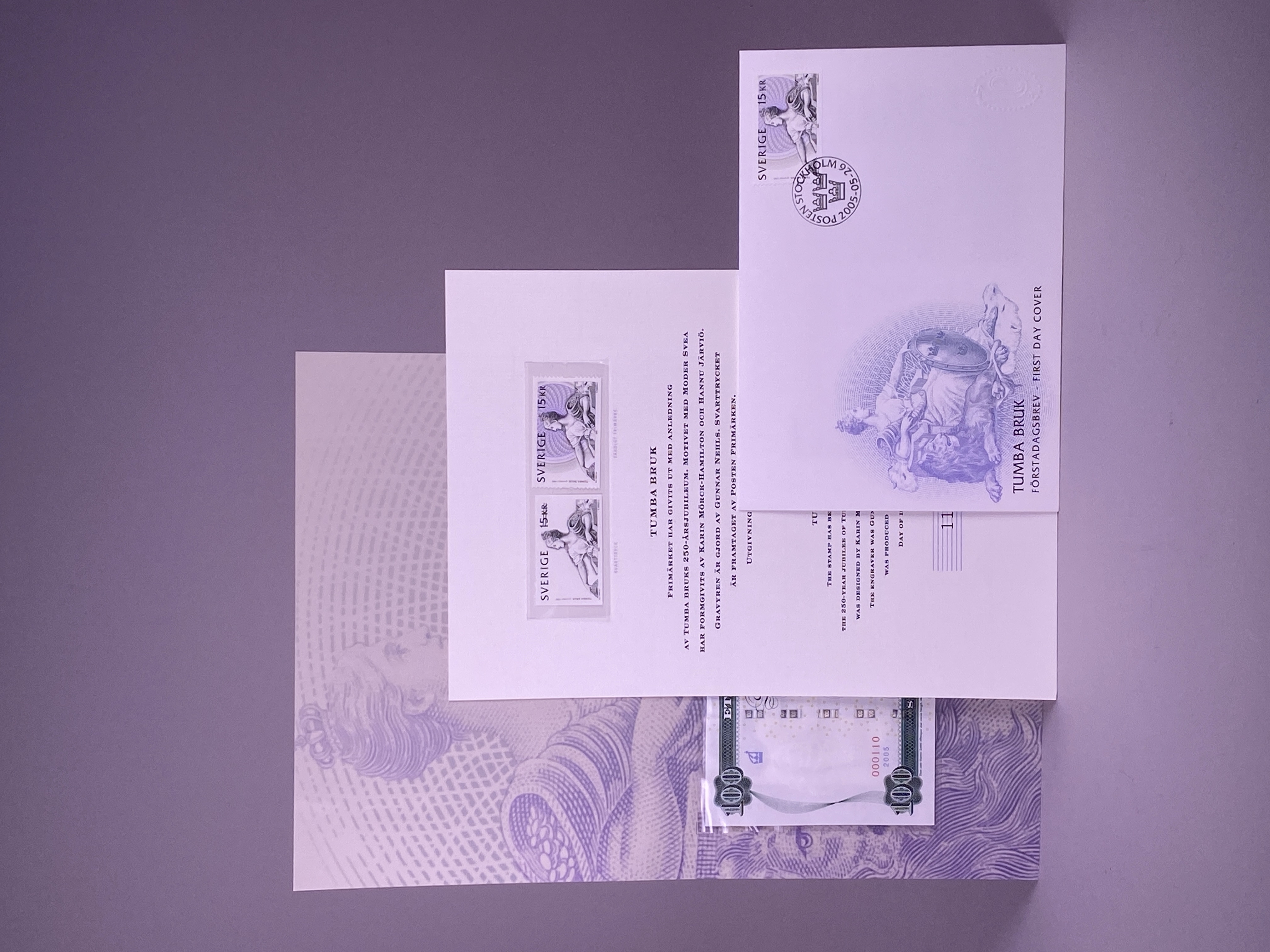 Mapp innehållandes en minnessedel med valören 100 kronor, tre frimärken samt ett förstadagsbrev. Minnessedel, frimärke samt brev utgavs år 2005 med anledning av Tumba bruks 250 års jubileum. Sedelns huvudmotiv är Moder Svea i den utformning som utfördes av konstnären Julius Kronberg till 1890 års sedelserie. Framsidan med bankens namn utskrivet två gånger, dels i dess gamla form från tiden före ståndsriksdagens upphörande 1866 - Sweriges Rikes Ständers Bank, dels med det idag gällande namnet - Sveriges riksbank. Vinjett, valörer och valörtext tryckt med mörk grönsvart koppartrycksfärg. Bakgrund i huvudsak tryckt i beige och grågröna offsetfärger. Bakgrundsmönstret uppbyggt i guilloche- och reliefmönster. Sedelns baksida med huvudmotiv föreställande planritning över Tumba bruk från 1804 samt med illustration av papperstillverkning ur Denis Diederots stora franska encyklopedi från åren 1751-1780. Sedeln med vattenmärke föreställande rikslejonet som ursprungligen förekom på bancosedlarna tryckta 1835- 1858. Sedeln även med säkerhetstråd, s.k. bred demetalliserad optiskt variabel fönstertråd, i reflektivt ljus ser man "Tre Kronor" som när man vinklar sedeln förändrar sig och blir "100". Frimärket förkommer i två varianter, som färdigt frimärke och som svarttryck. Huvudmotivet utgörs även i detta fall av Julius Kronbergs målning av Moder Svea. Frimärket är även utformat som en sedel med säkerhetsdetaljer såsom mikrotext. Motivet har formgivits av Karin Mörck-Hamilton och Hannu Järviö. Gravyr av Gunnar Nehls. Svartryck framtaget av Postens Frimärken. Sedel, frimärken och brev placerade i mapp tillverkad i papp. Mappens framsida med illustration föreställande Klockhuset vid Tumba bruk, samt texten "TUMBA BRUK 250 ÅR GRUNDAT 1755 RIKSBANKEN". Mappens insida med två pappersark, ett större och ett mindre. På det större arket sitter minnessedeln samt ett frimärke monterat innanför varsin plastficka. Arkets framsidan med tryckt motiv föreställande Moder Svea samt texten "TUMBA BRUK", baksidan av arket med text beskrivande Tumba bruks histora, minnessedelns utformning samt frimärkets utforming. Det mindre pappersarket med två frimärken placerade innanför plastficka, samt text beskrivande frimärkets utformning tryckt i svart mot vit bakgrund.