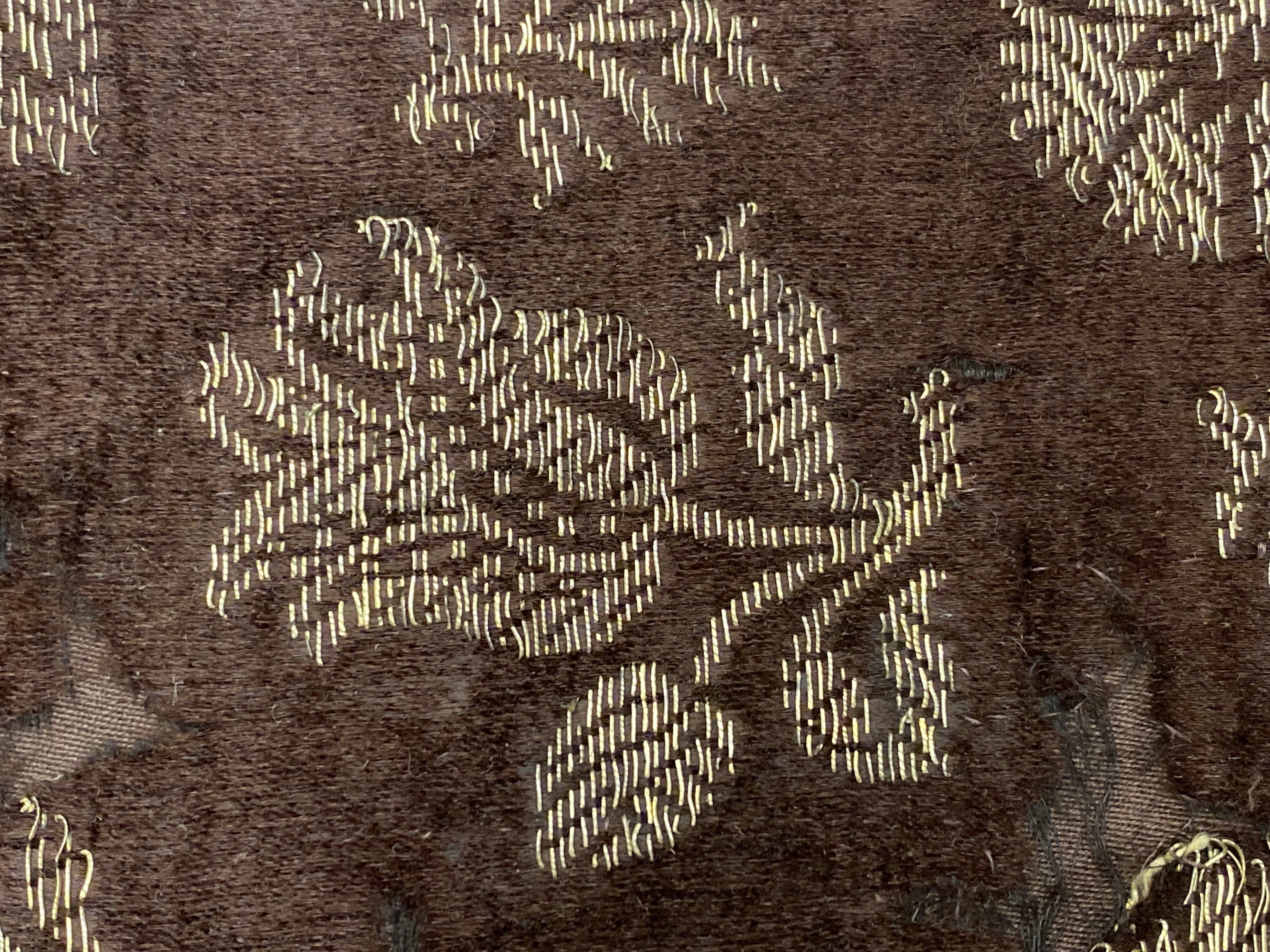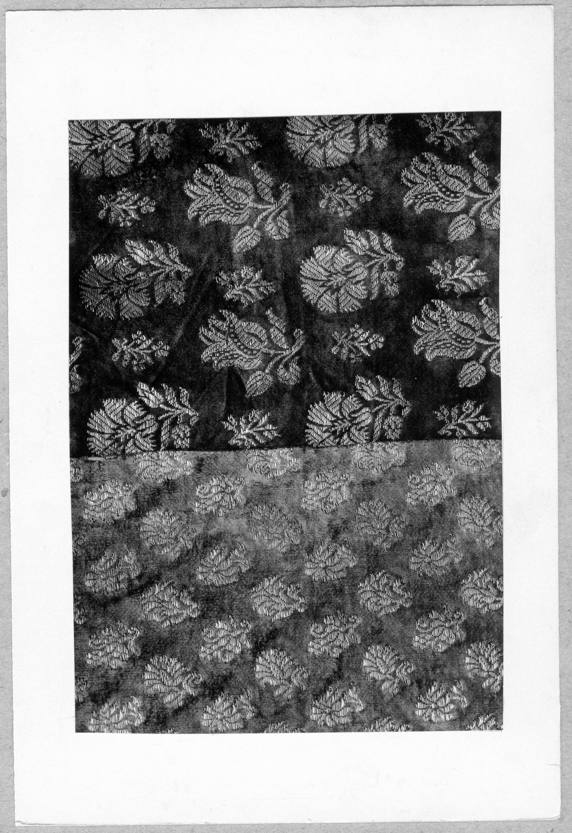 Mittvåd av brunviolett siden med strödda blommor och blad. CHW MF 1672 i smala guldband. Sidovåder av rödviolett siden med strödda blommor och blad. Blått lärftfoder. Deponerad 1932.