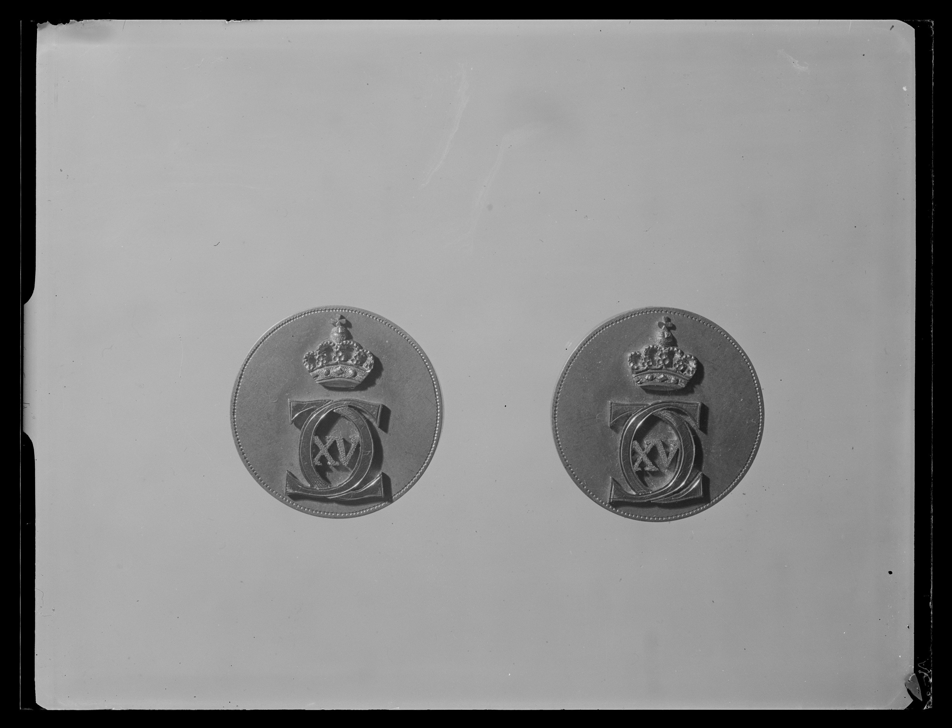 Knapp av gulmetall (matt förgyllning?) med nedvikt 2 mm bred kant, längs kanten punsad ring. På knappen fäst namnchiffer, spegelmonogram C (blankt rödgult guld) XV (mattpunsat) krönt av kunglig krona av samma gula färg som plattan. Namnchiffret fastskruvat på baksidan med fyra muttrar, en mutter saknas på vardera knappen. Smalt skaft och tunn nedre platta.