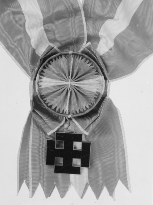 Ordenstecken för kommendör med stora korset av republiken Österrikes Förtjänstorden (1922-1934, Gross-stern des Ehrenzeichens für Verdienste um die Republik Österreich, 1934-1938 Gross-stern des Österreichischen Verdienstorden). Kryckkors av förgyllt silver(?), täckt med matt, svart emalj(?). På den övre korsarmen en kantig bygel, däri fäst en oval ring i form av en repfläta. Däri fäst bandring, allt av förgyllt silver(?).